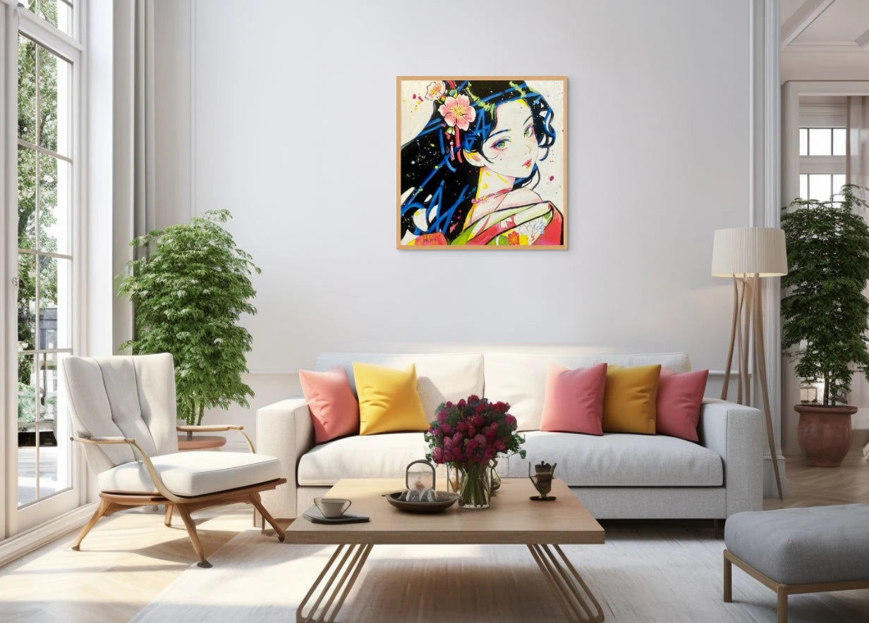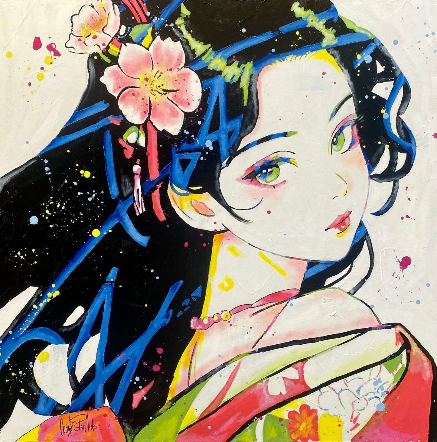 From an early age, she was immersed in an artistic environment, growing up in her father’s studio surrounded by canvases and brushes. These early experiences, combined with inspiration drawn from contemporary artists like Kaws and Takashi Murakami, have shaped her unique style, characterized by a vibrant and colorful view of the world.