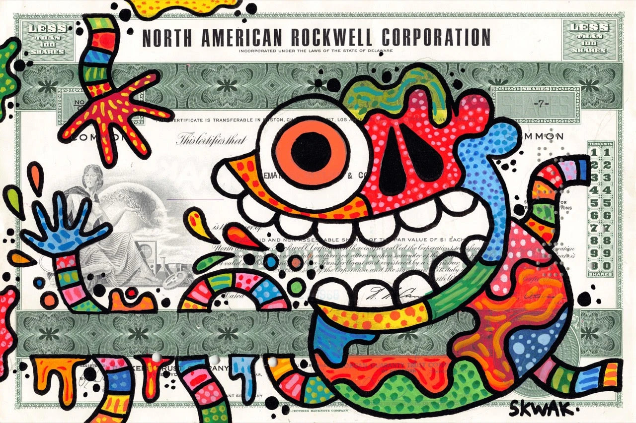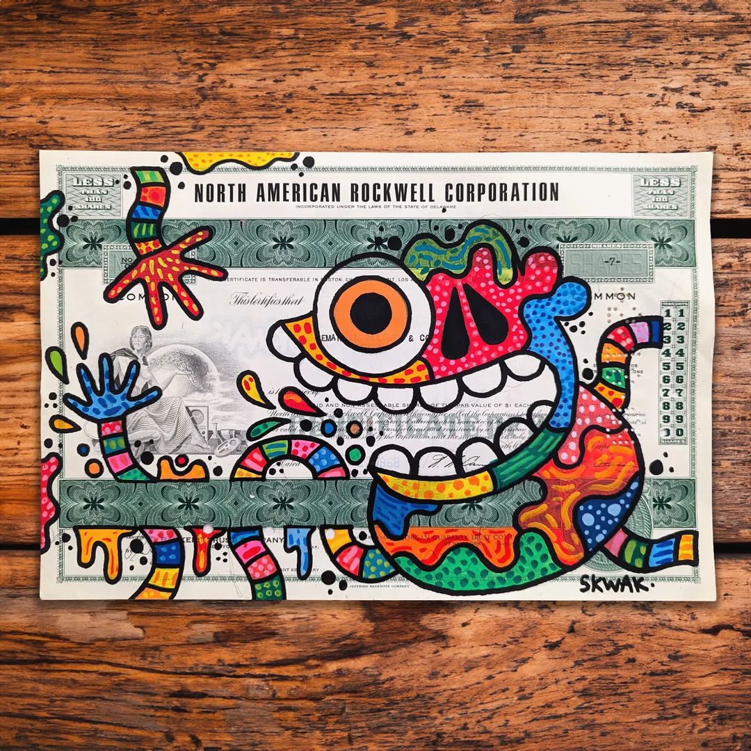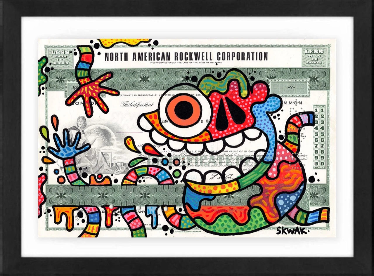 This artworks is an original and unique painting executed on a genuine vintage American stock certificate, nicely framed in 11"x14" in. floating Frame with Polished Glass and Hanging Hardware.