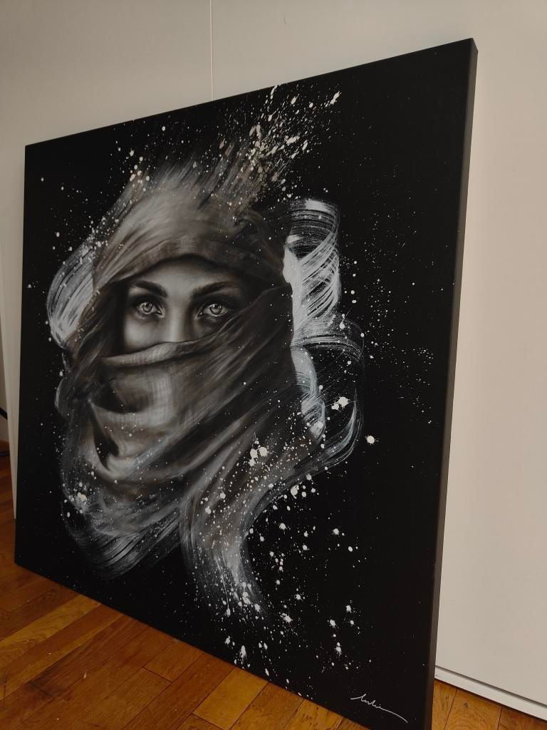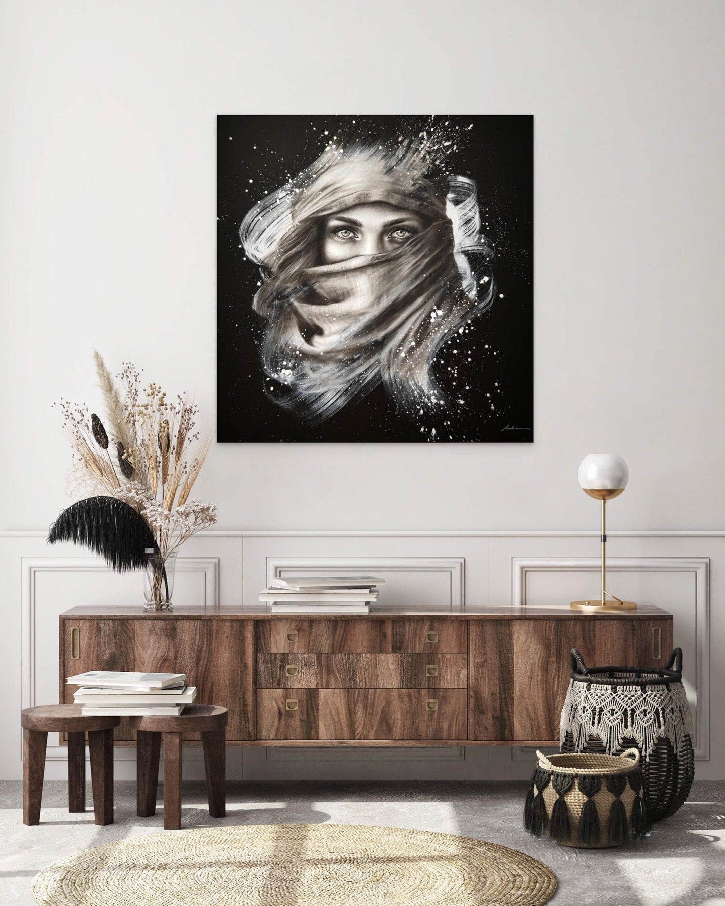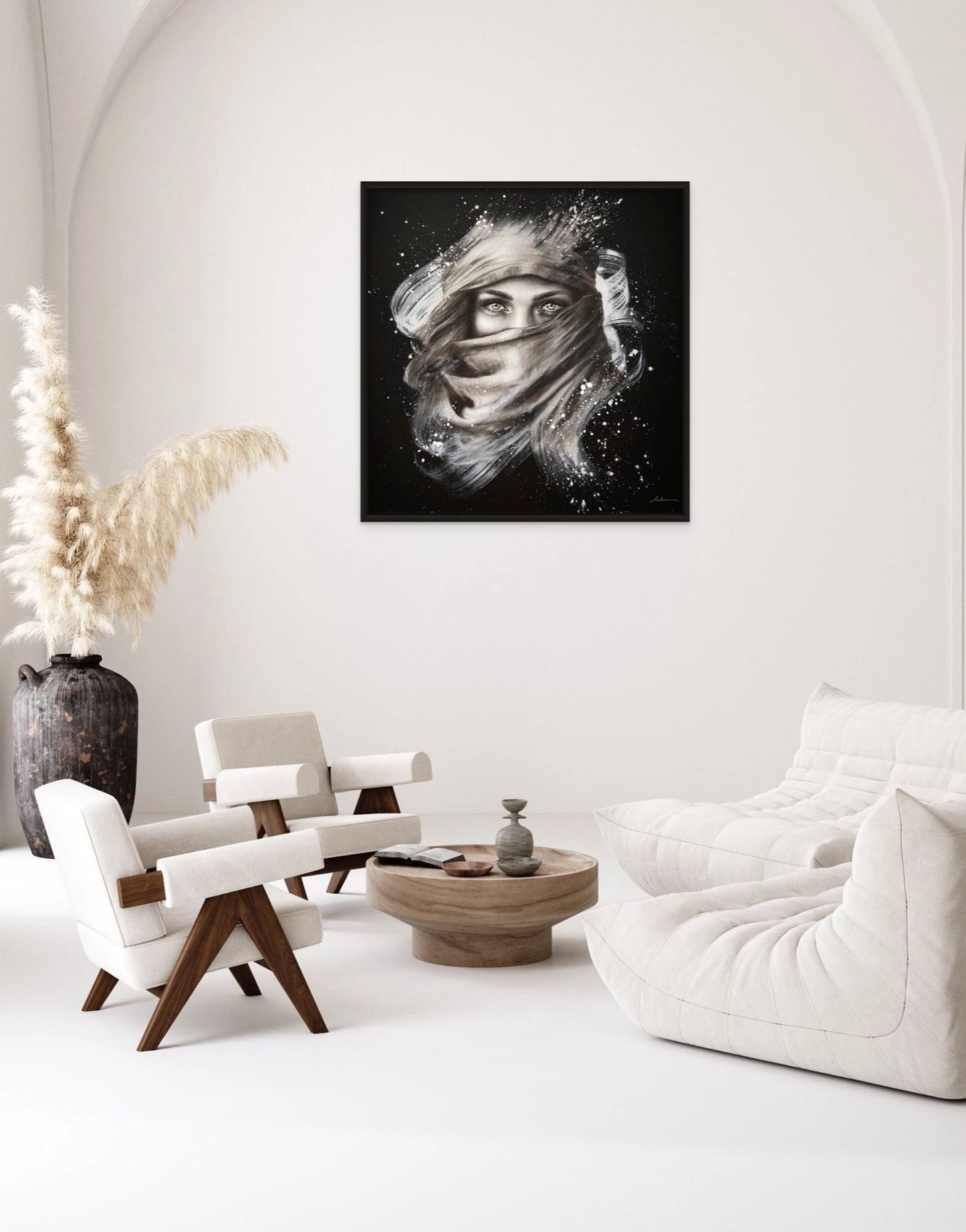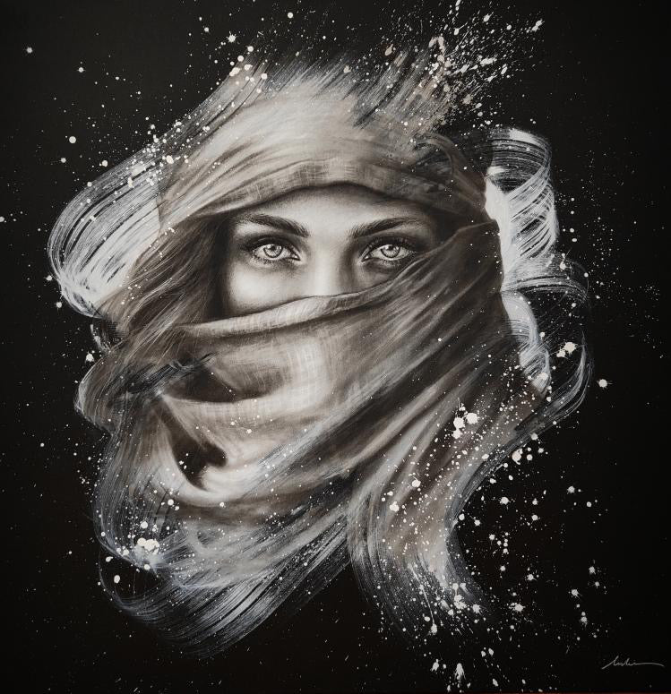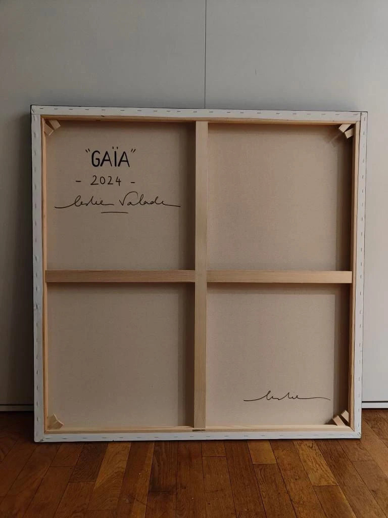 Leslie Valade's 'Gaïa' is a unique original on a 100x100cm (39x39 inches) canvas, a portrait that captures the mystery and beauty of the Earth goddess with delicate, swirling strokes. It's a one-of-a-kind piece, not a print or a duplicate.