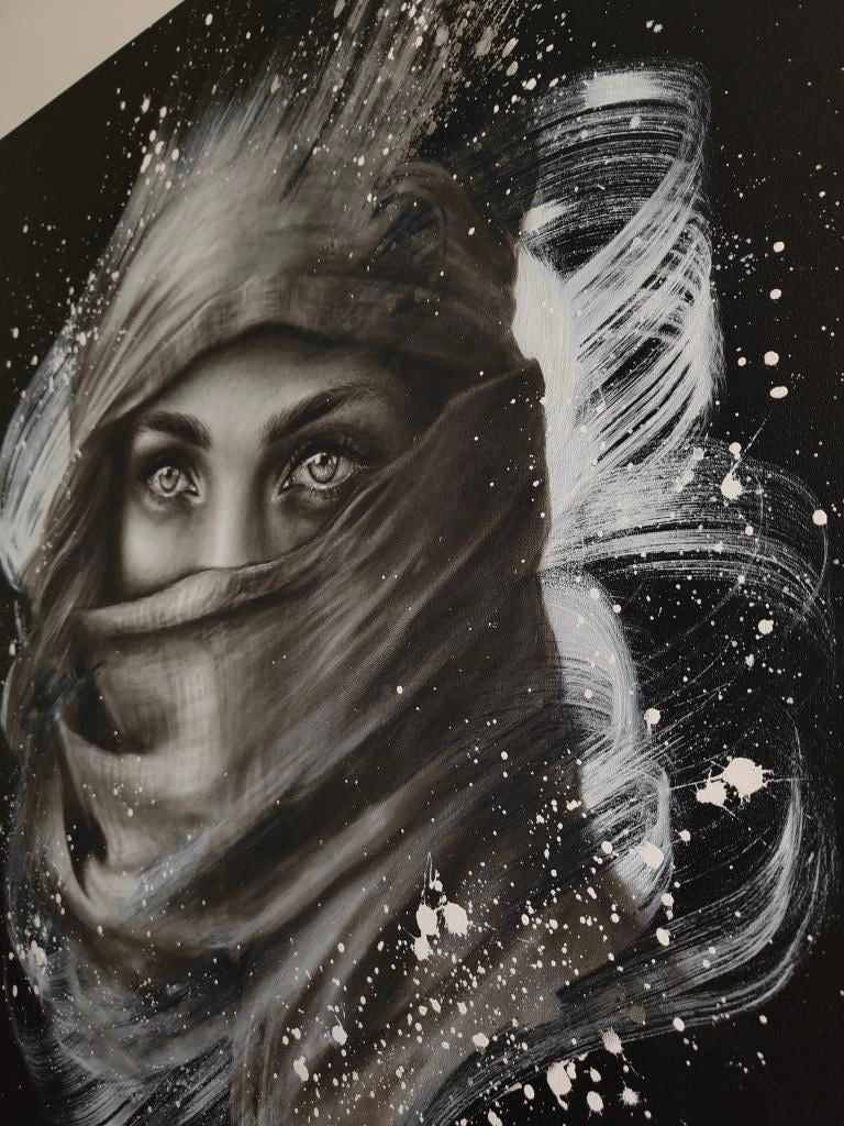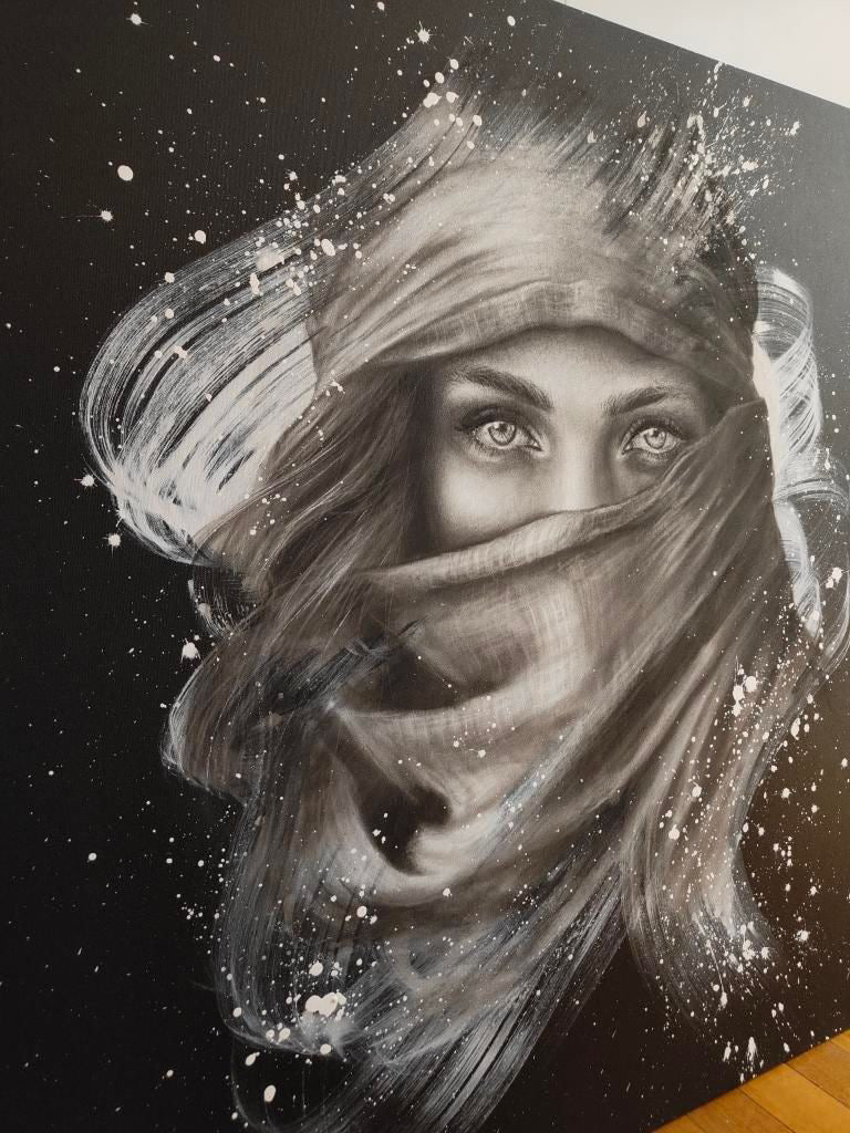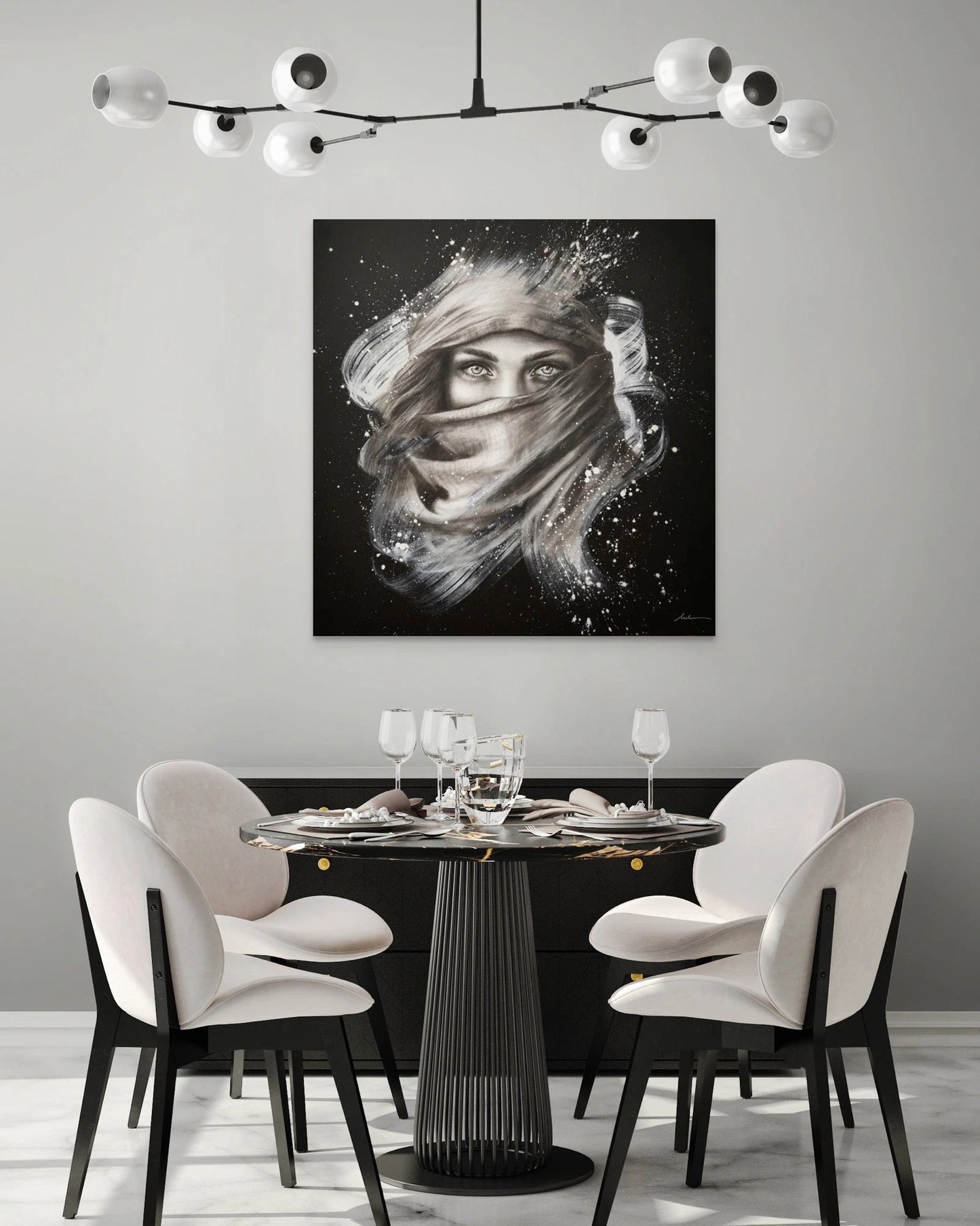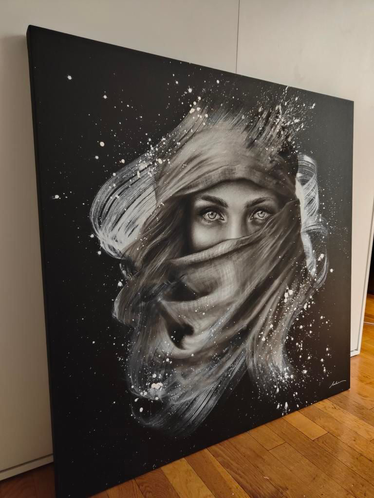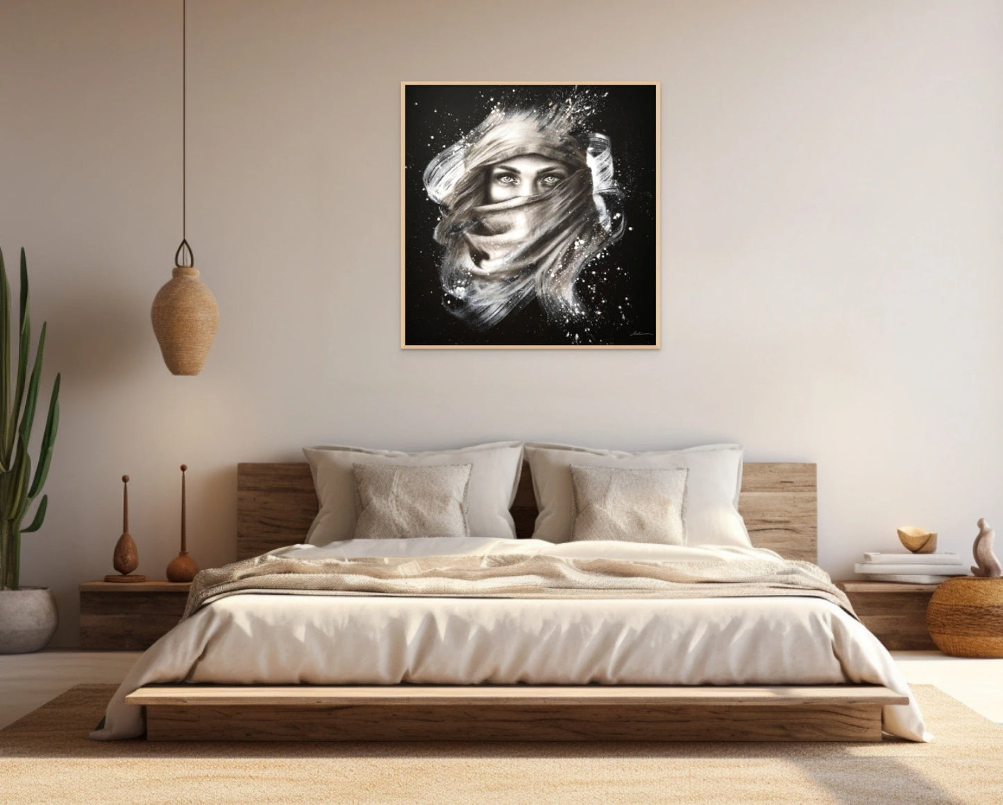 Leslie Valade's 'Gaïa' is a unique original on a 100x100cm (39x39 inches) canvas, a portrait that captures the mystery and beauty of the Earth goddess with delicate, swirling strokes. It's a one-of-a-kind piece, not a print or a duplicate.