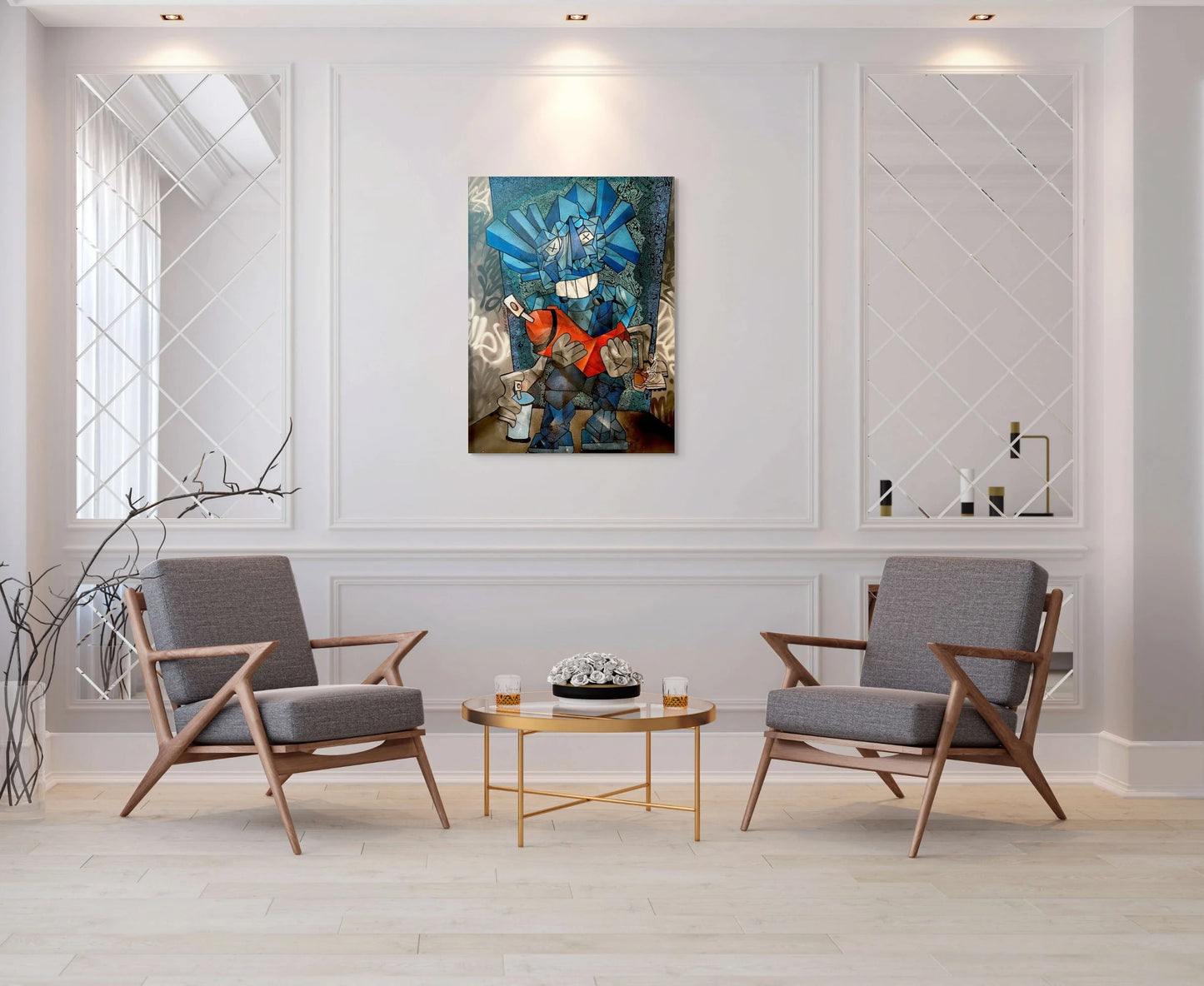 The KAWS character represents the artist's creative spirit and vision, while the humanized spray can signifies the transformative power of art tools as they become an extension of the artist's identity.