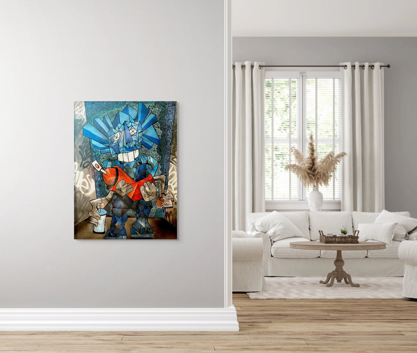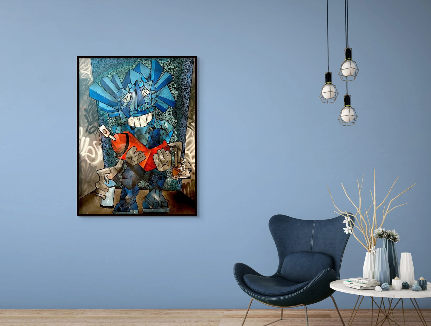 In "La vie en Kaws" Aket delivers a captivating 142 x 109 cm canvas that uniquely blends the iconic KAWS character with a playful twist on street art. At the center of the painting, the renowned blue KAWS character tenderly holds a human-like orange spray can with arms, legs, and a head shaped like a spray nozzle.