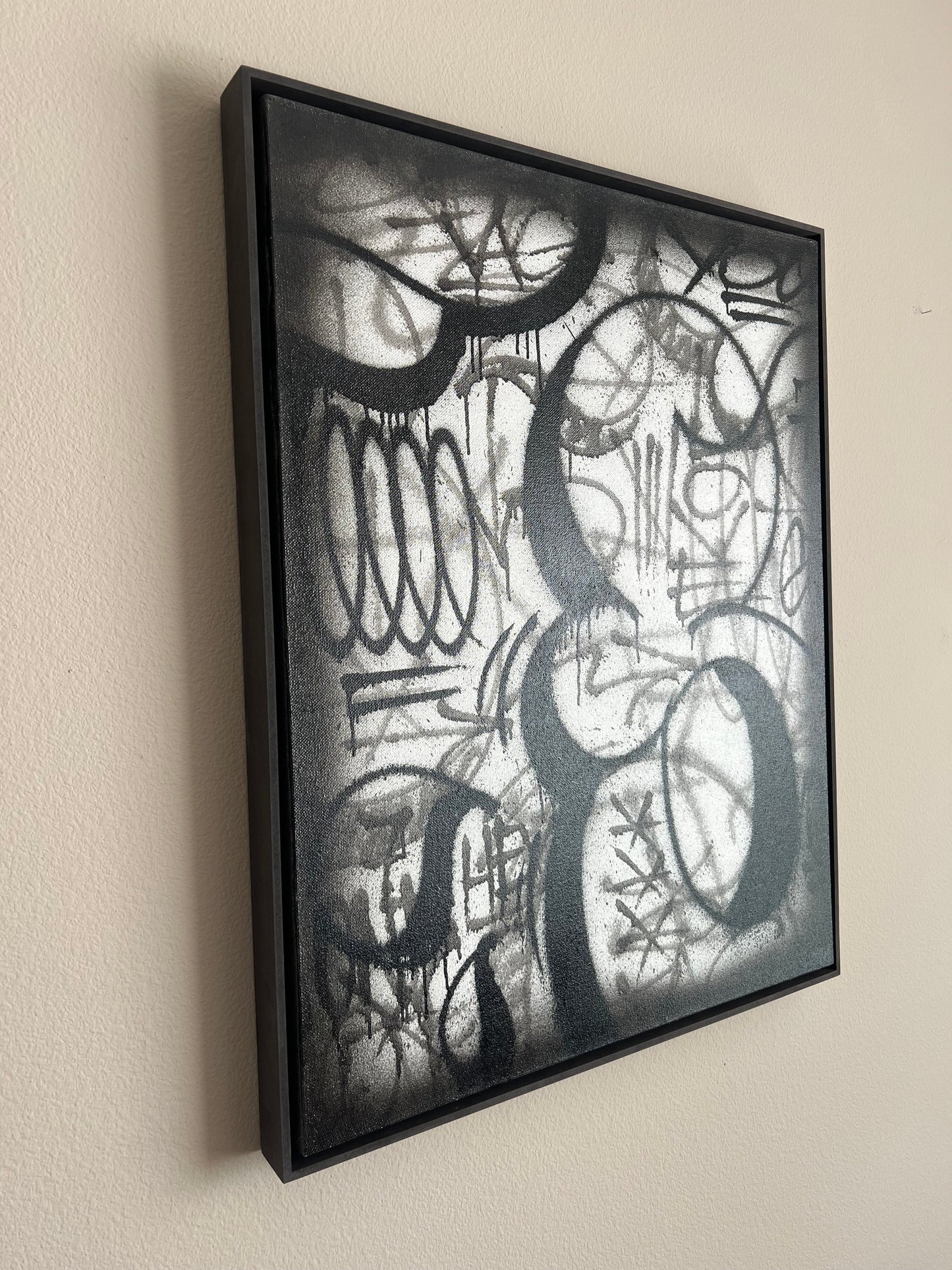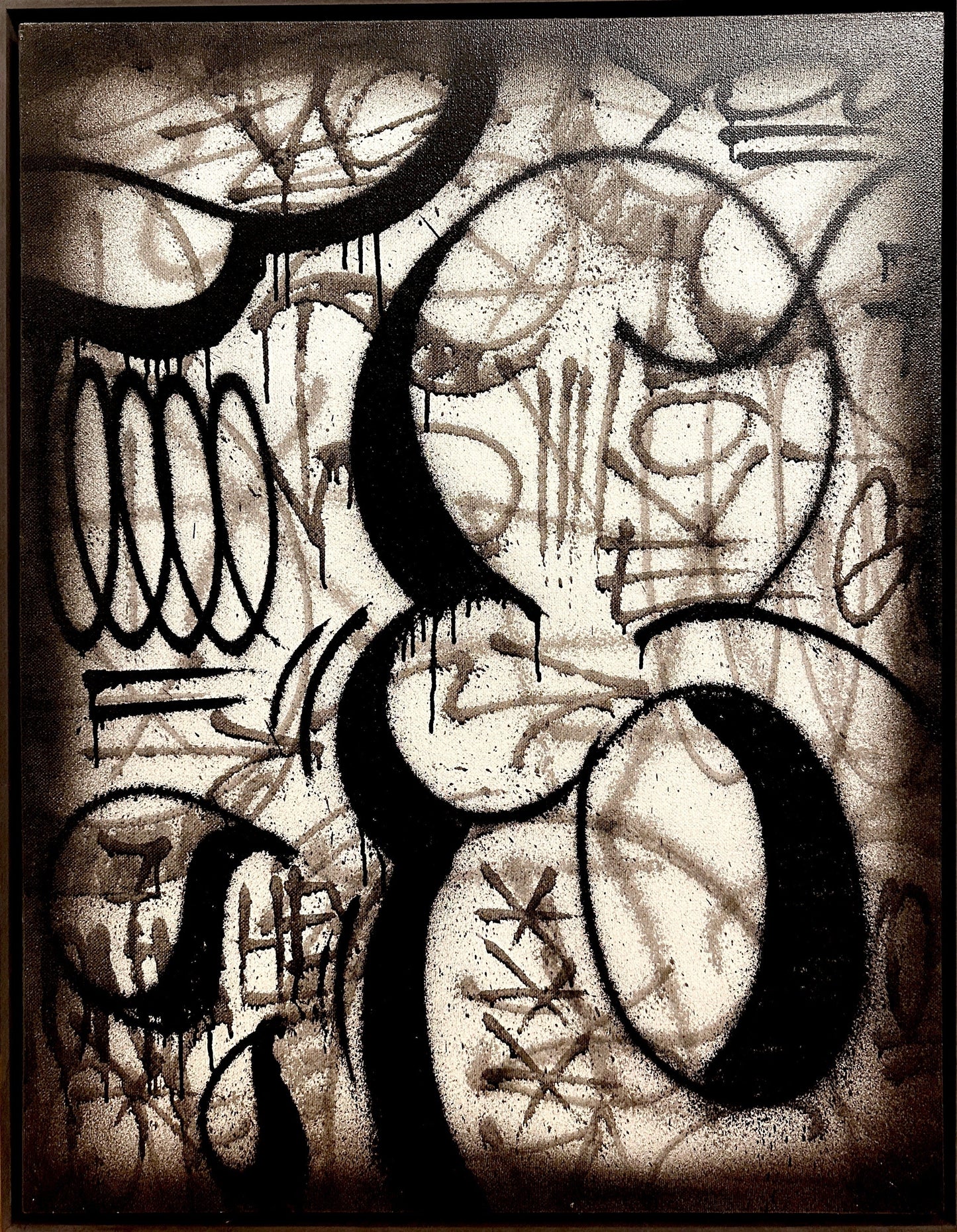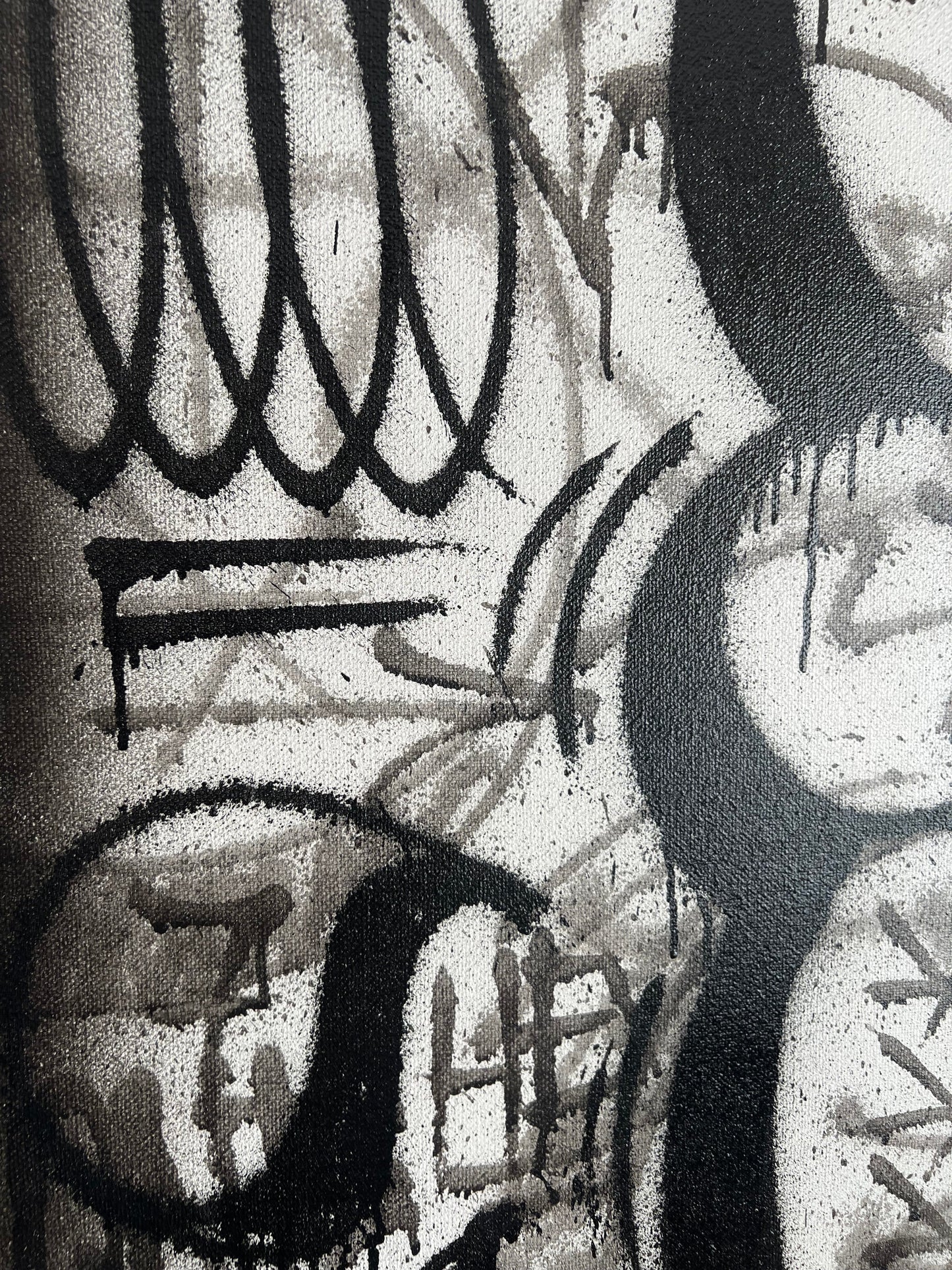 Black and Mild by Sven is a mesmerizing exploration of abstract graffiti, showcasing a chaotic yet harmonious interplay of bold, black strokes against a muted background. The composition is dominated by large, looping shapes that evoke a sense of movement and spontaneity, while smaller, intricate scribbles fill the spaces in between, adding complexity and depth. The drips and splatters indicate a raw, unrefined energy reminiscent of urban street art.