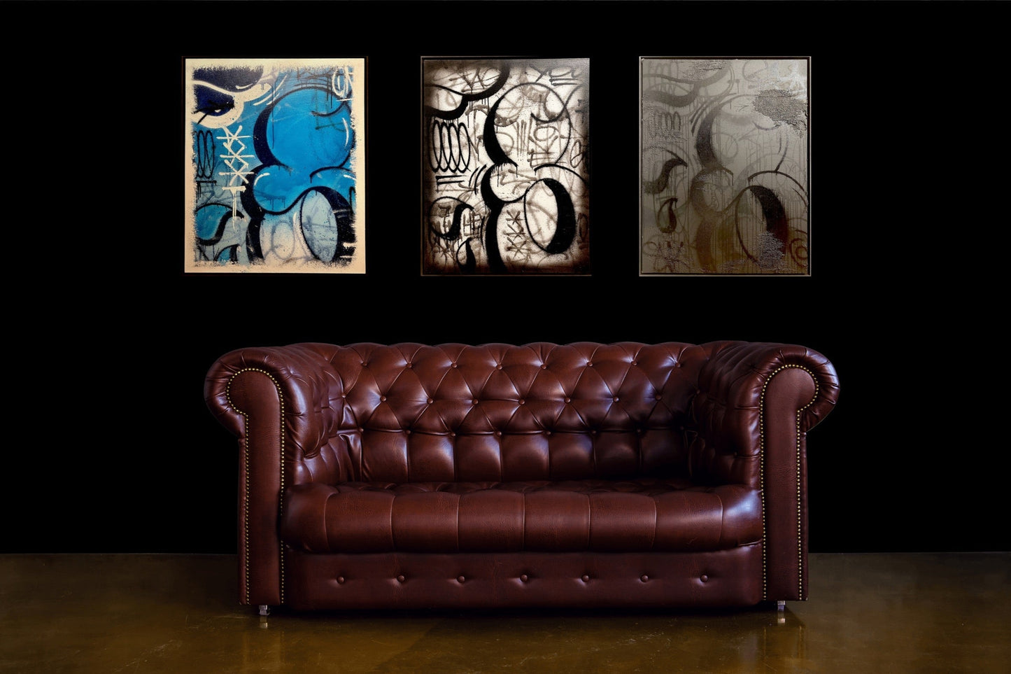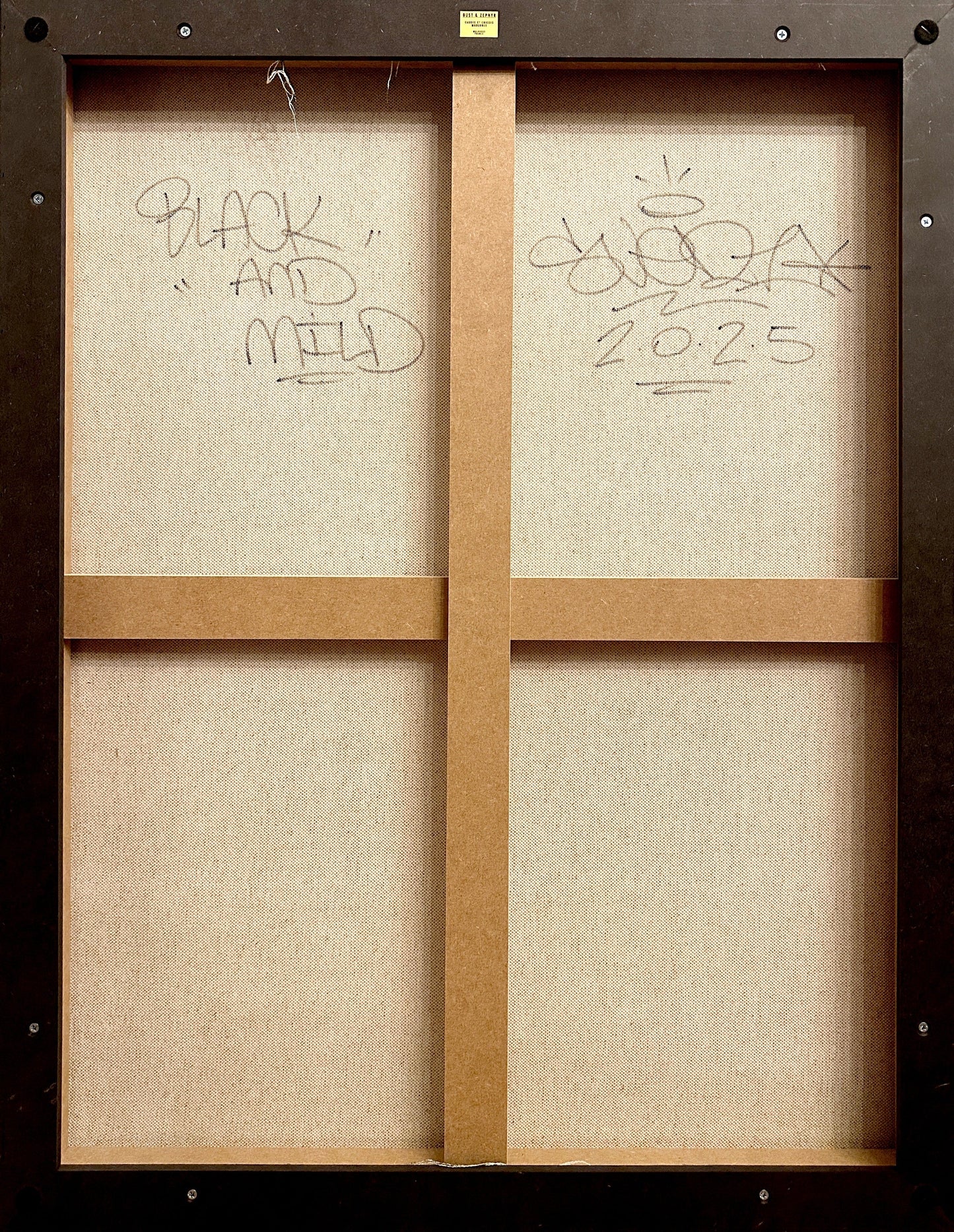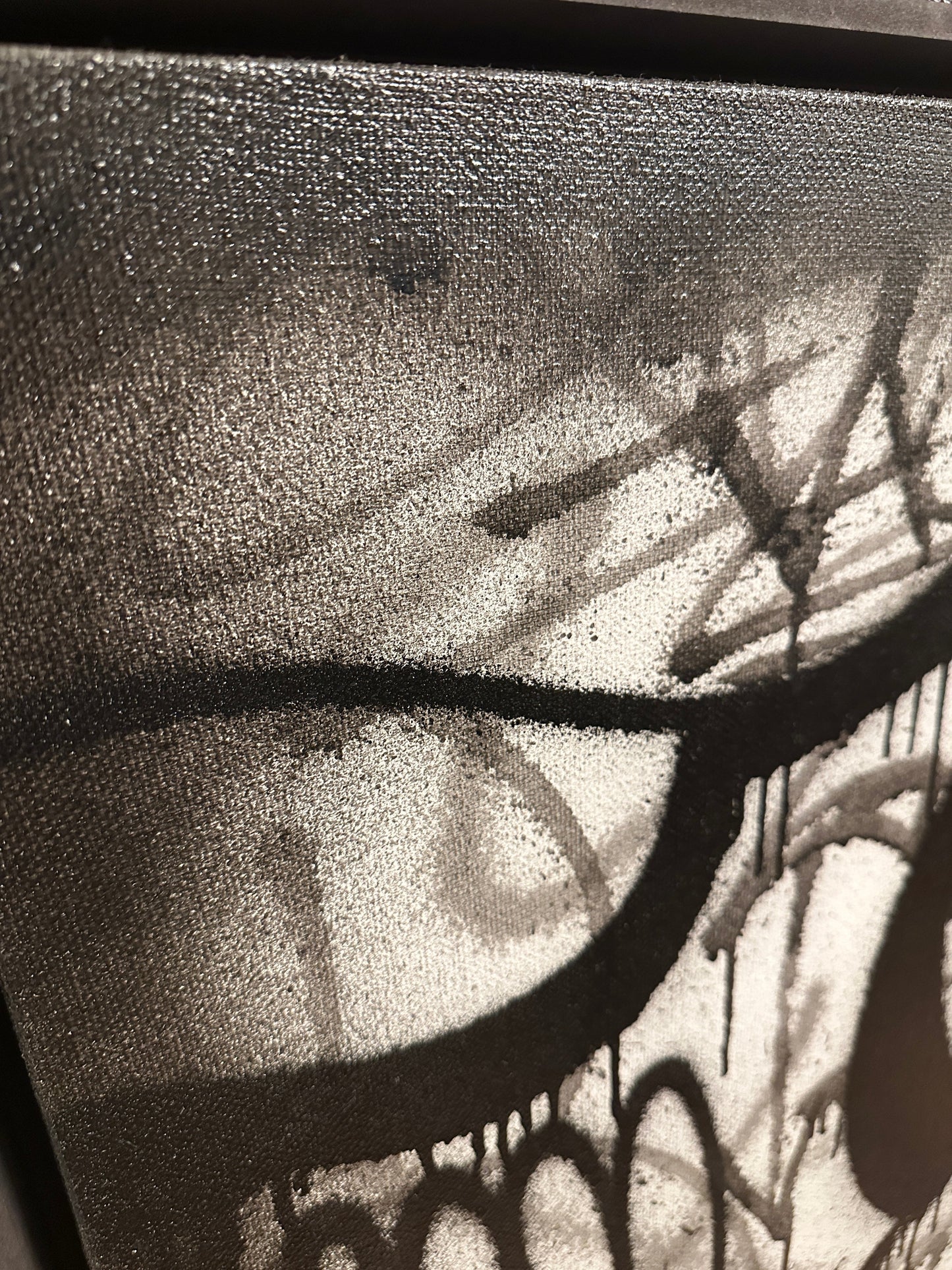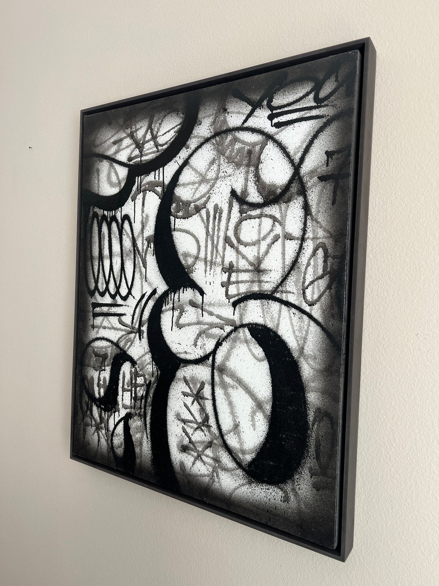 Black and Mild by Sven is a mesmerizing exploration of abstract graffiti, showcasing a chaotic yet harmonious interplay of bold, black strokes against a muted background. The composition is dominated by large, looping shapes that evoke a sense of movement and spontaneity, while smaller, intricate scribbles fill the spaces in between, adding complexity and depth. The drips and splatters indicate a raw, unrefined energy reminiscent of urban street art.