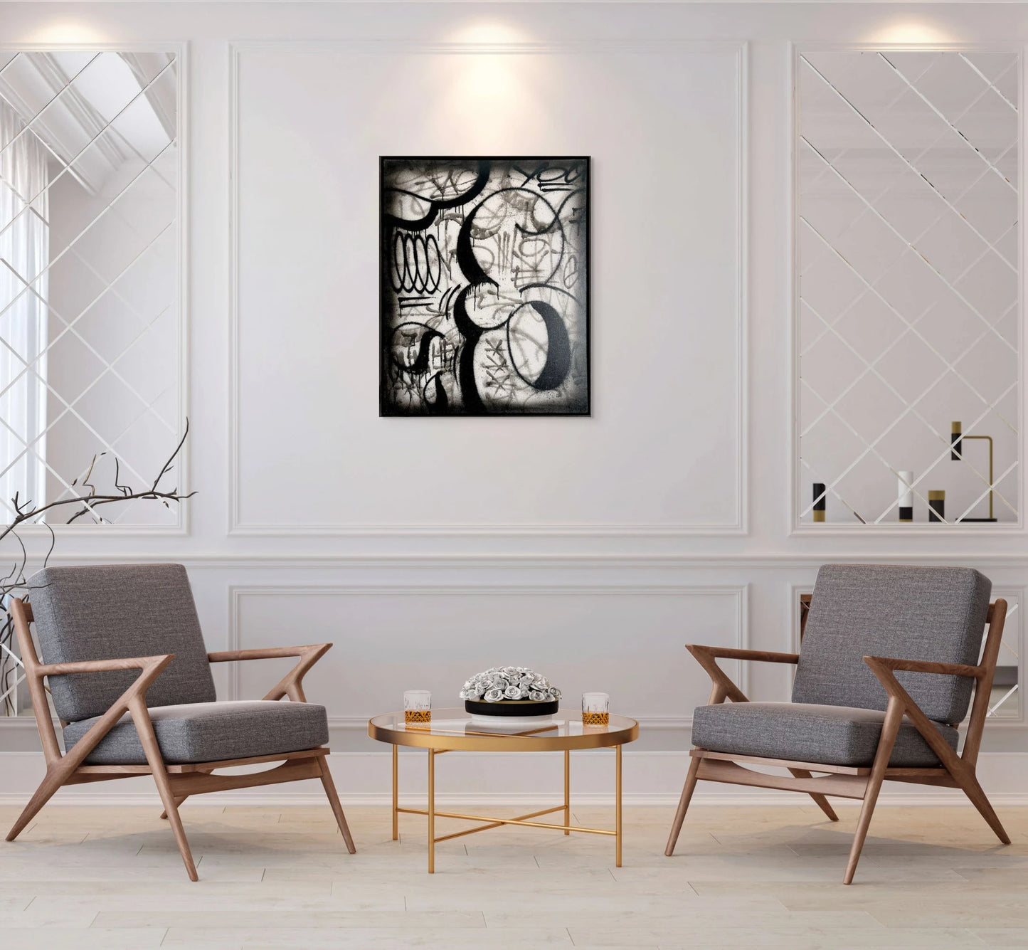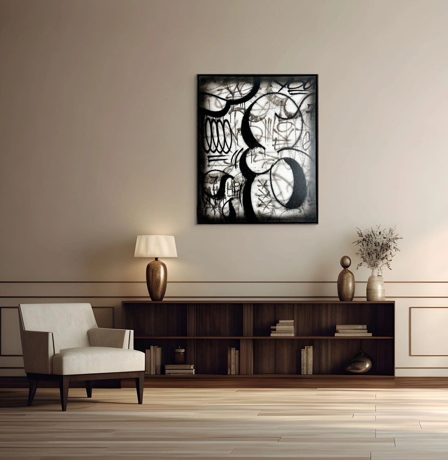 The balance between the dense lines and open spaces creates a dynamic tension, pulling the viewer’s gaze across every inch of the canvas. This piece captures the spirit of rebellion and free expression, inviting the audience to find meaning in the seemingly chaotic presentation. Its unique blend of fluidity and structure sets it apart as a striking representation of modern abstract art.