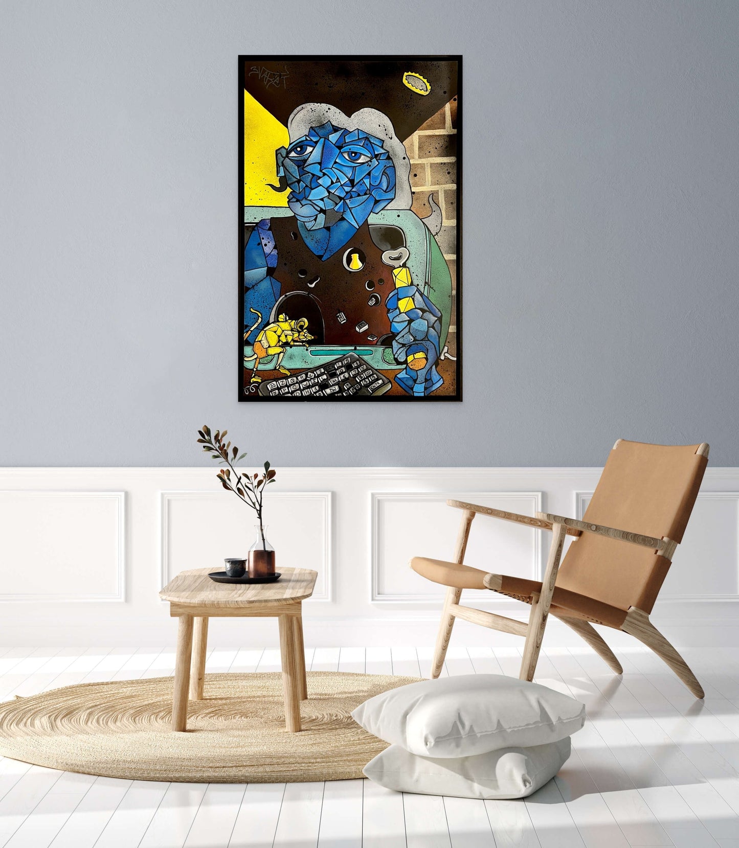 Over time, Aket's style has evolved to include deconstructed portraits in which he multiplies elements and shapes of the faces, accentuating the features and lines. His artwork is heavily influenced by cubist painters such as Picasso and Condo, and he shapes faces in a playful, ludic way that can be both abstract and figurative, but always cubic.