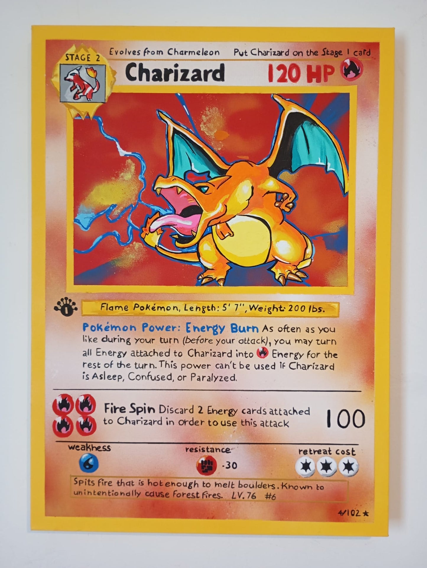 Sophie So Moon's original handmade painting on canvas is a classic depiction of a Charizard Pokémon trading card, a highly sought-after collectible in the gaming world.