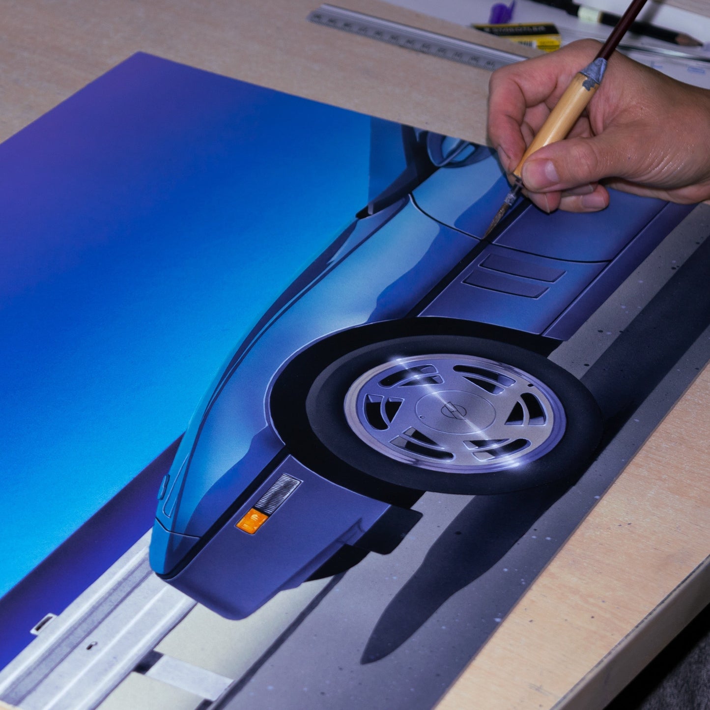 A beautifully rendered segment of a sleek, metallic blue sports car occupies the right half of the canvas, showcasing its impeccable contours and reflective surface with striking detail. The wheel, radiant in its chrome finish, catches the light brilliantly, underscoring the artist's technical skill. The scene is set against a breathtaking backdrop of a clear blue sky punctuated by a few wispy clouds, which mirror the serene calmness of a distant, deep blue ocean horizon.
