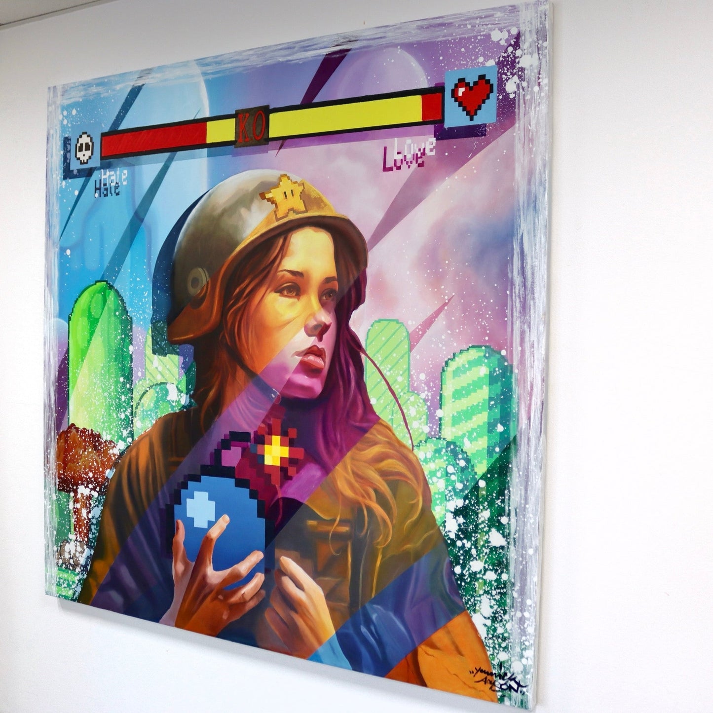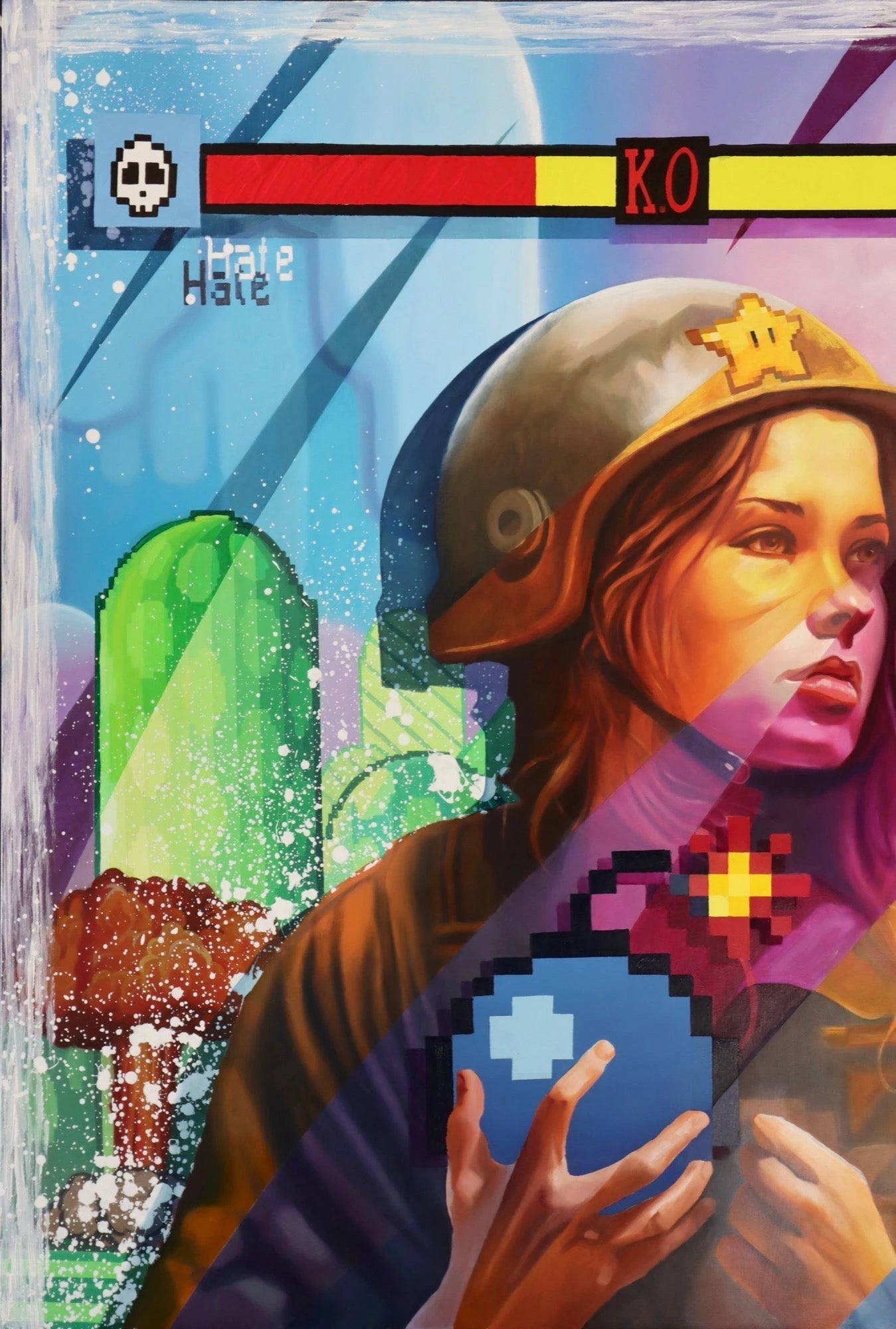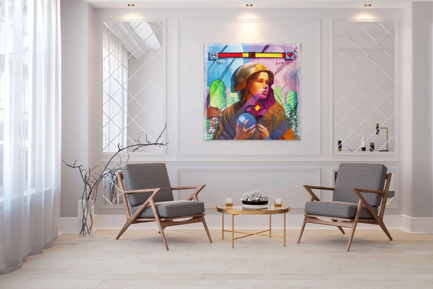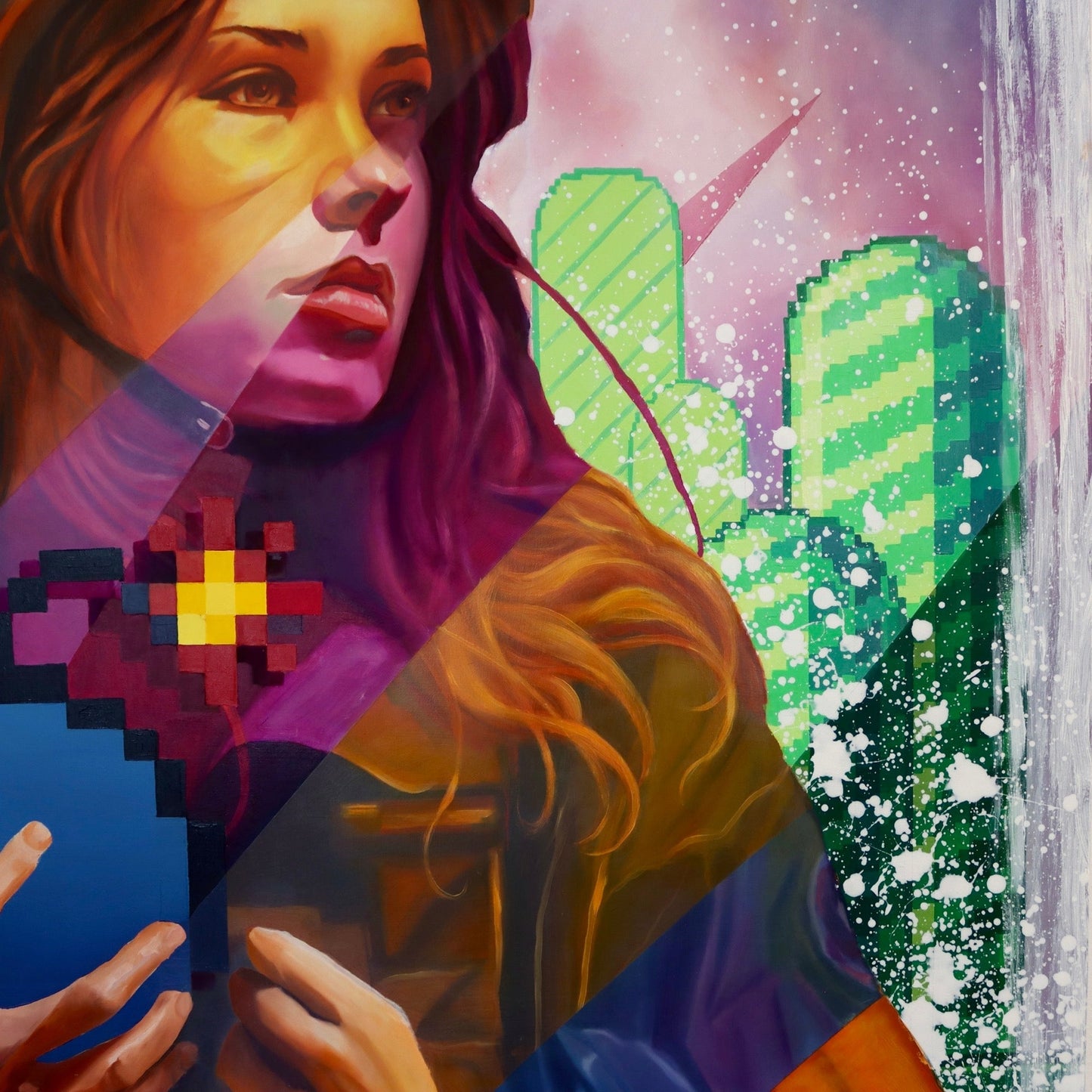 This 51x51 inches (130x130 cm) painting on canvas features a fusion of acrylic and oil mediums, offering a vivid, stylized profile of a woman. It merges vibrant geometric patterns, evocative of digital glitches, with tropical and classic video game motifs, enhancing the pop art aesthetic. The scoreboard-like text adds a unique, game-inspired twist.