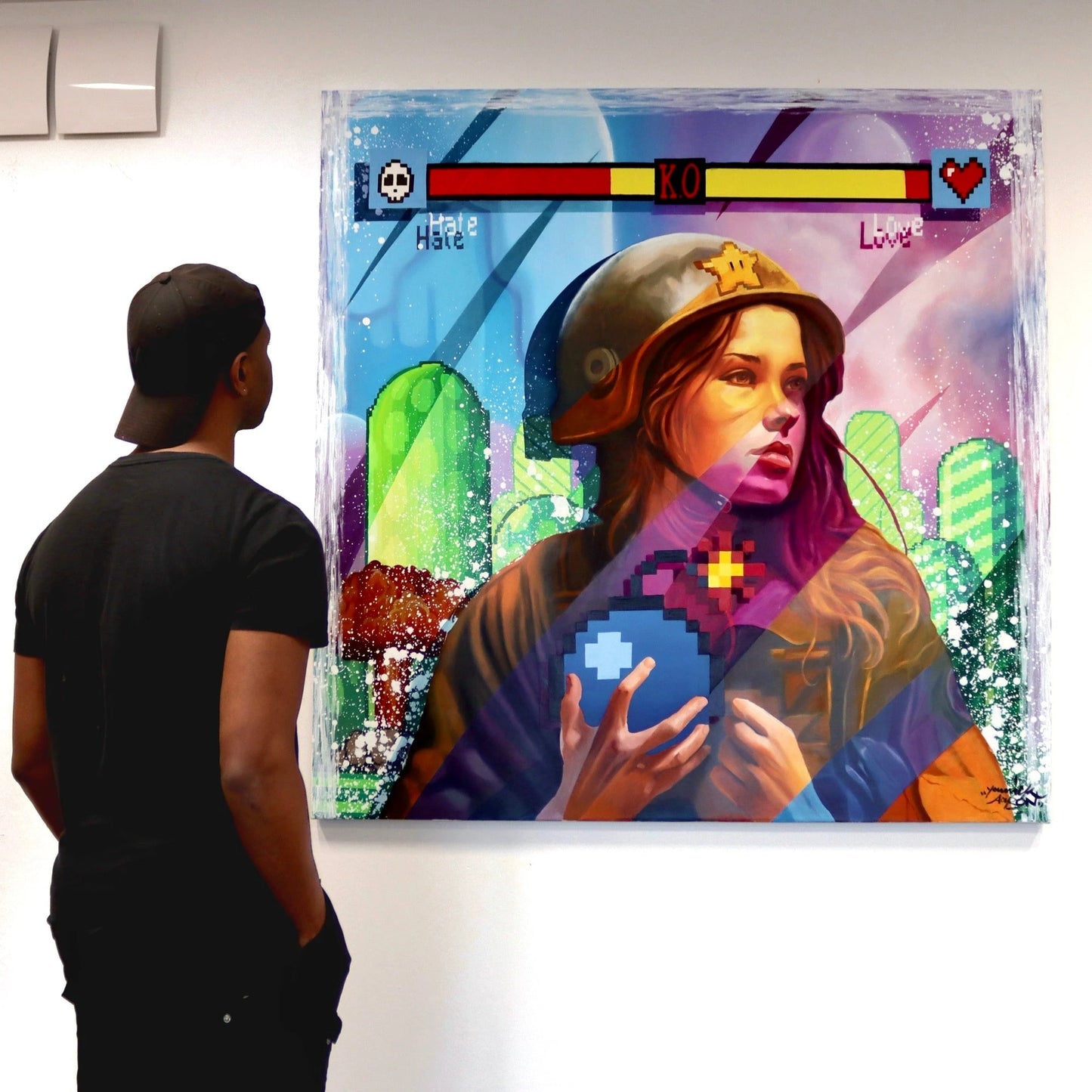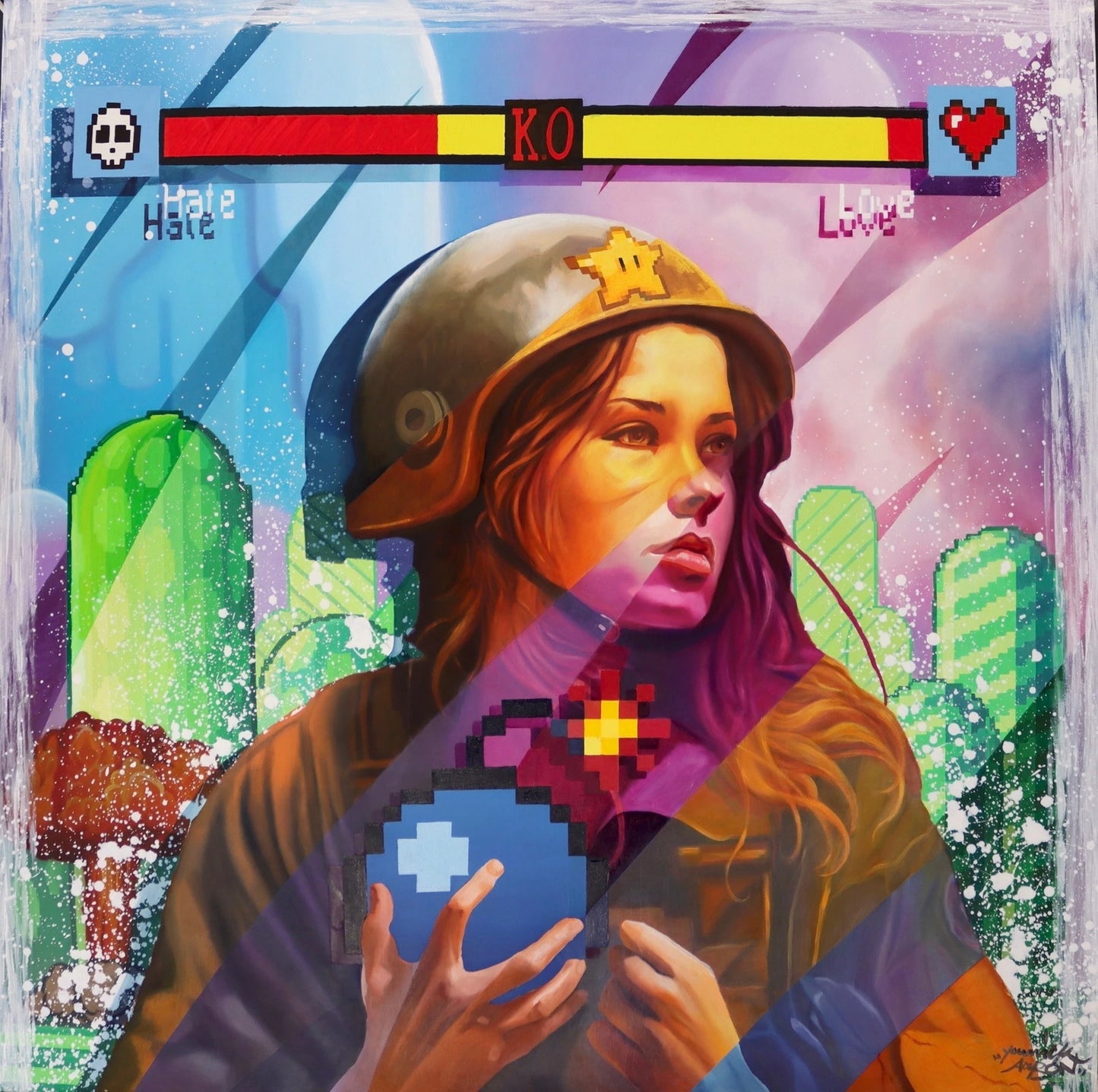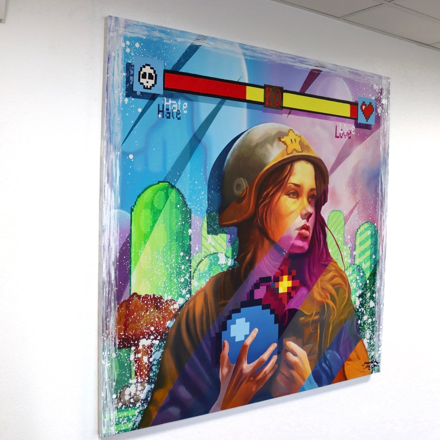 This 51x51 inches (130x130 cm) painting on canvas features a fusion of acrylic and oil mediums, offering a vivid, stylized profile of a woman. It merges vibrant geometric patterns, evocative of digital glitches, with tropical and classic video game motifs, enhancing the pop art aesthetic. The scoreboard-like text adds a unique, game-inspired twist.