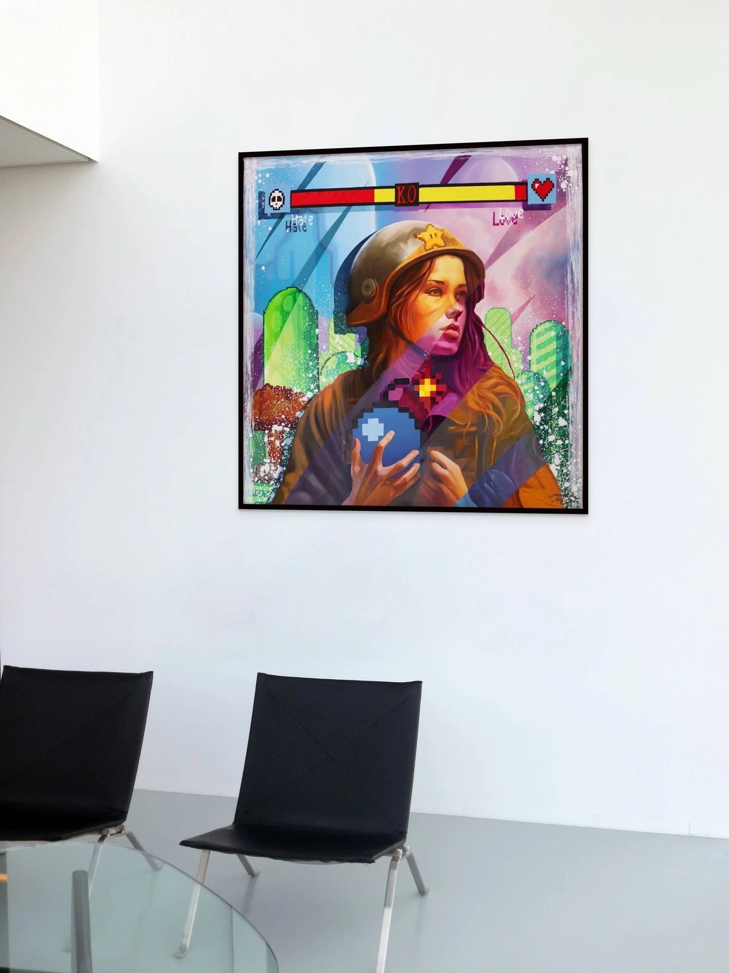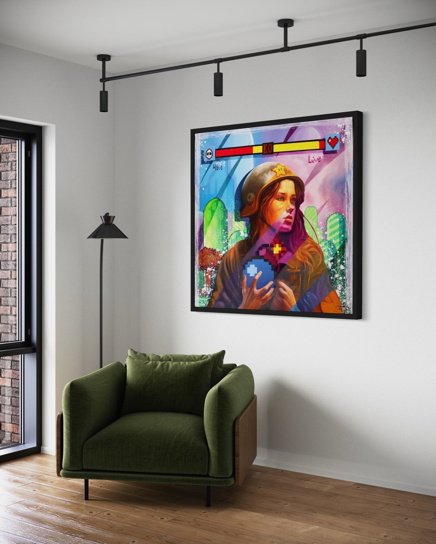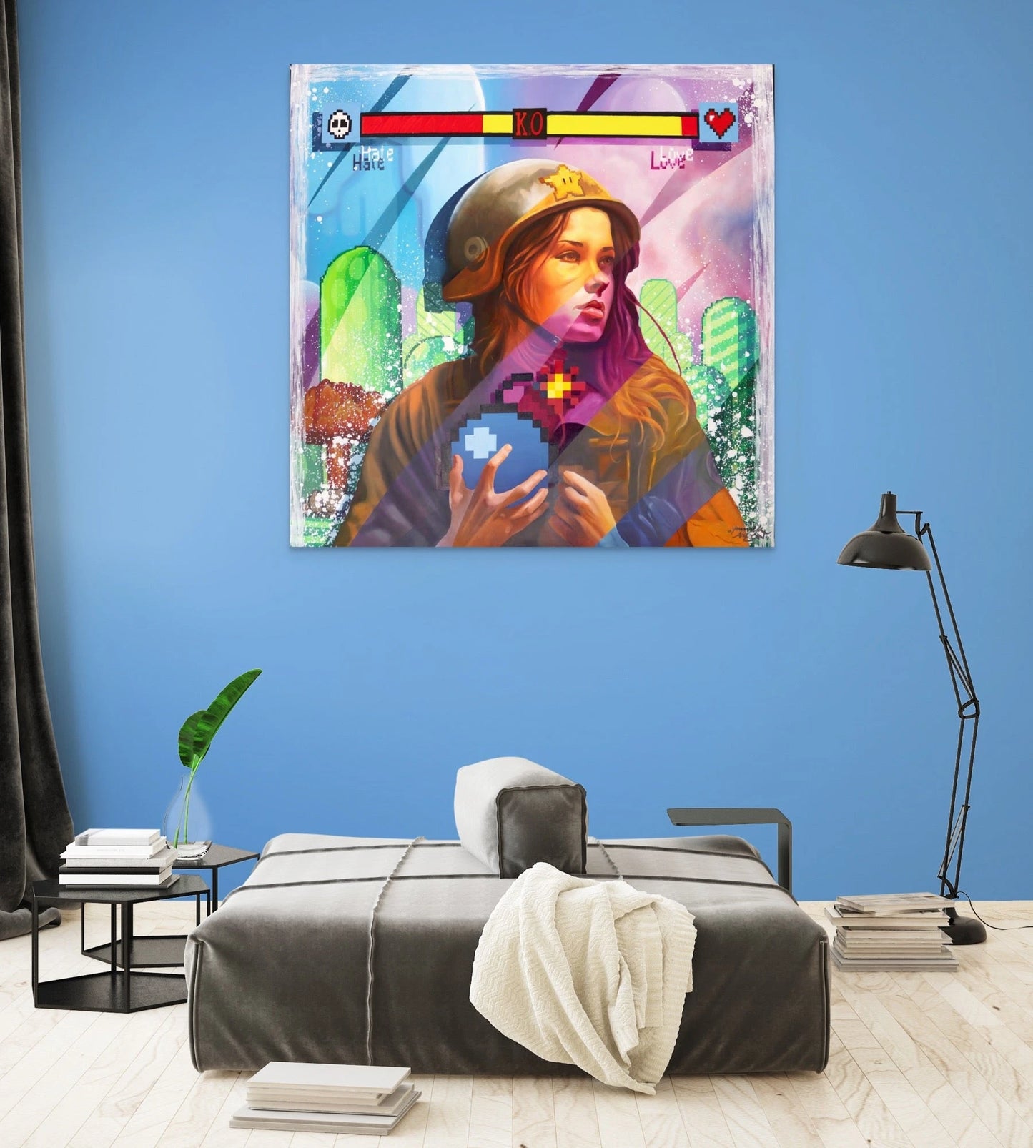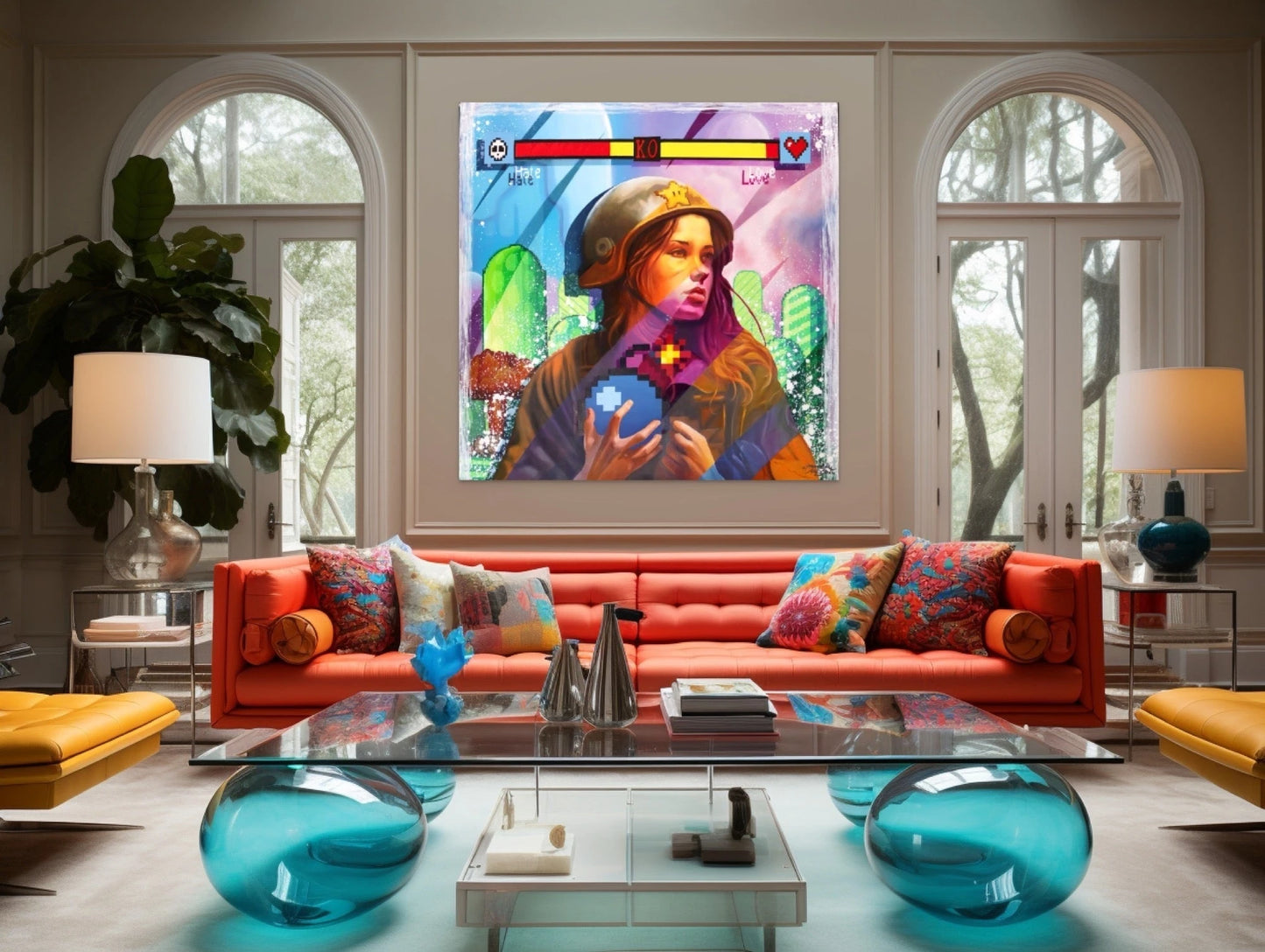 This 51x51 inches (130x130 cm) painting on canvas features a fusion of acrylic and oil mediums, offering a vivid, stylized profile of a woman. It merges vibrant geometric patterns, evocative of digital glitches, with tropical and classic video game motifs, enhancing the pop art aesthetic. The scoreboard-like text adds a unique, game-inspired twist.