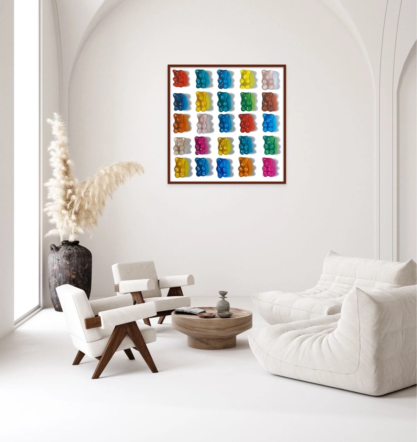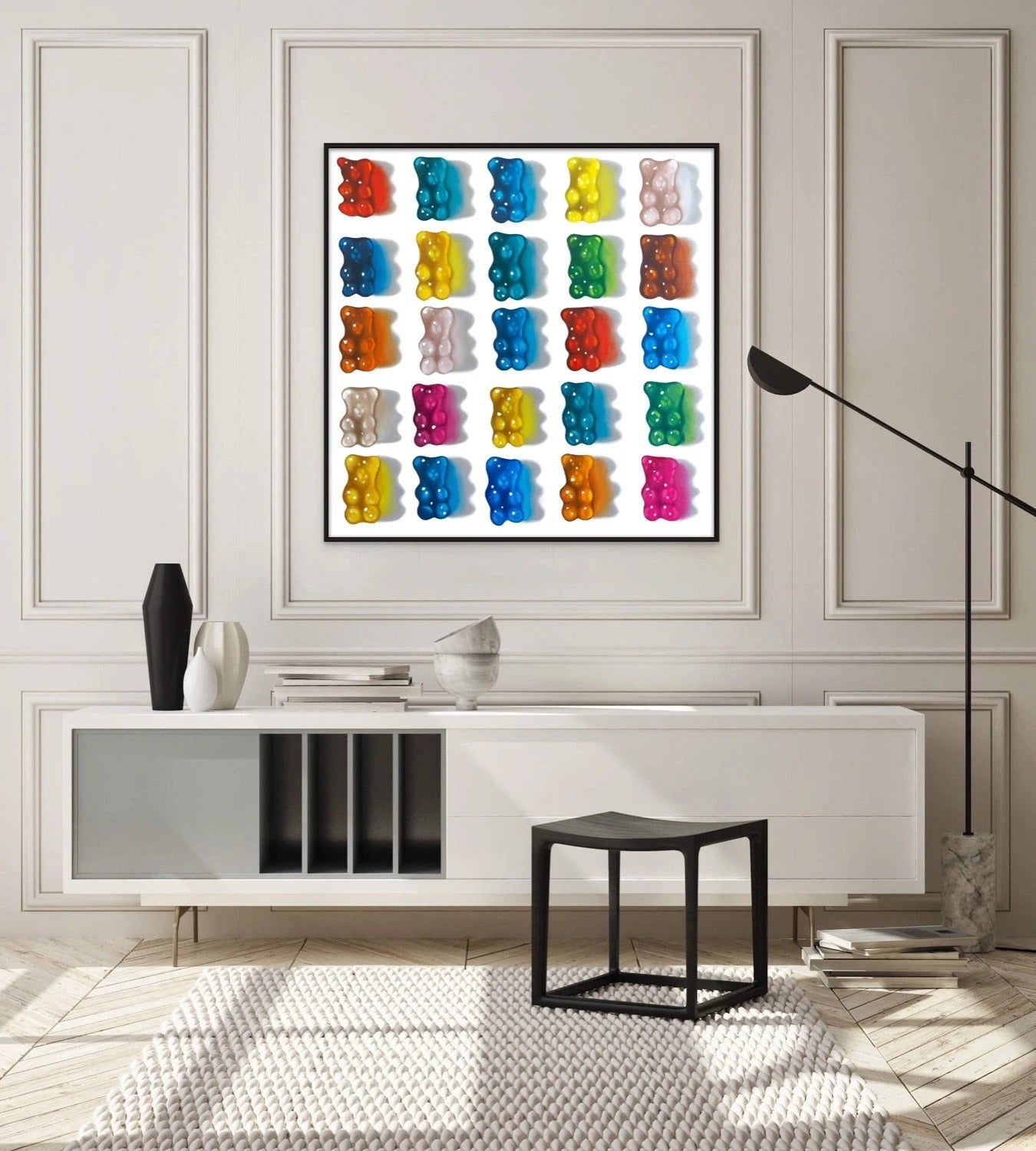 "Bear Rhythm" is a striking 100x100 cm oil on canvas that displays Ian Bertolucci's profound affinity for the playful and the vibrant. This large-scale work features an array of gummy bears arranged in a grid, each one casting a soft shadow that brings a dynamic sense of depth to the flatness of the canvas. Bertolucci's meticulous attention to detail shines through the glossy, tactile surfaces of these sweet icons, rendered with a hyper-realistic touch that challenges the boundary between the painted and the palpable.