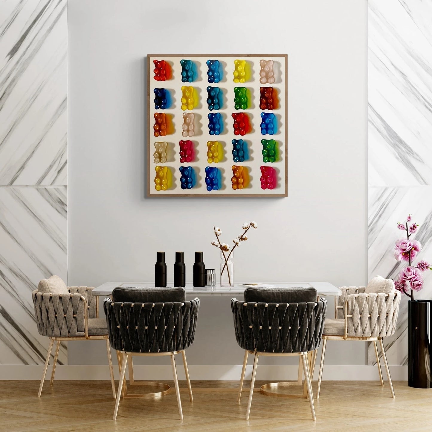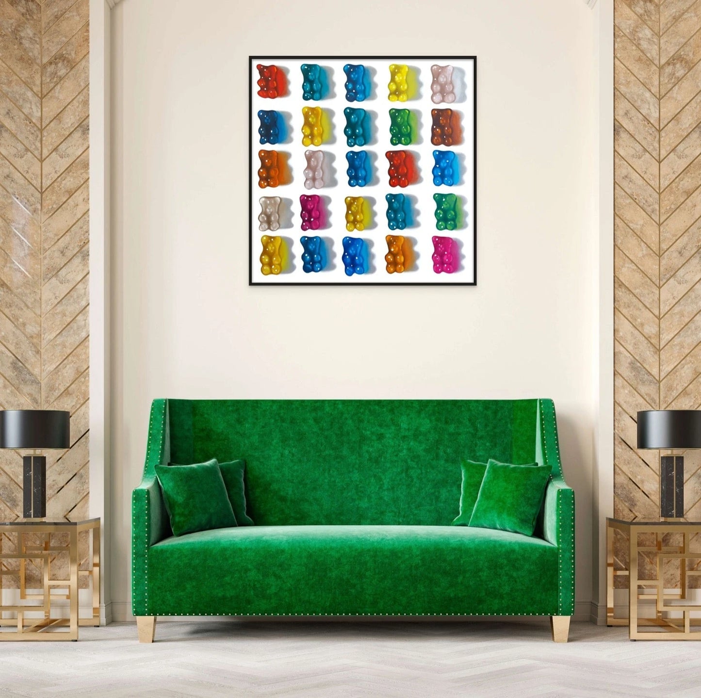 The painting is a symphony of color, with each bear illuminated in rich, saturated hues that dance across the canvas, echoing the inherent joy and rhythm found in simple pleasures. The artist's use of light not only highlights the bears' chewy texture but also their translucency, creating a jewel-like luminosity that radiates from the work. With deliberate repetition and careful placement, Bertolucci imbues the composition with a sense of order and harmony, inviting the viewer to find solace in the patterns that rhythmically repeat yet subtly vary in tone and shade.