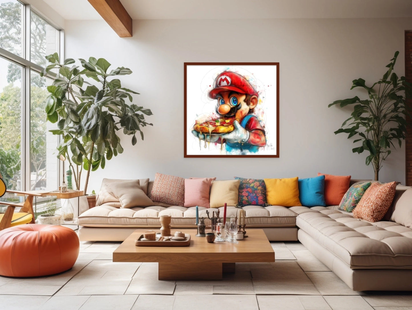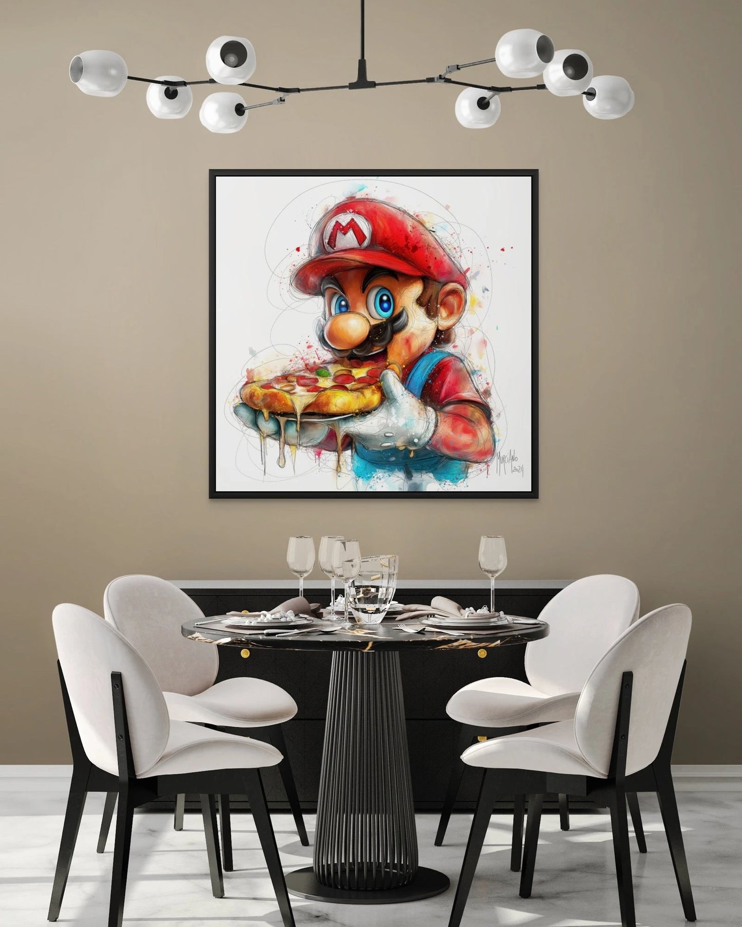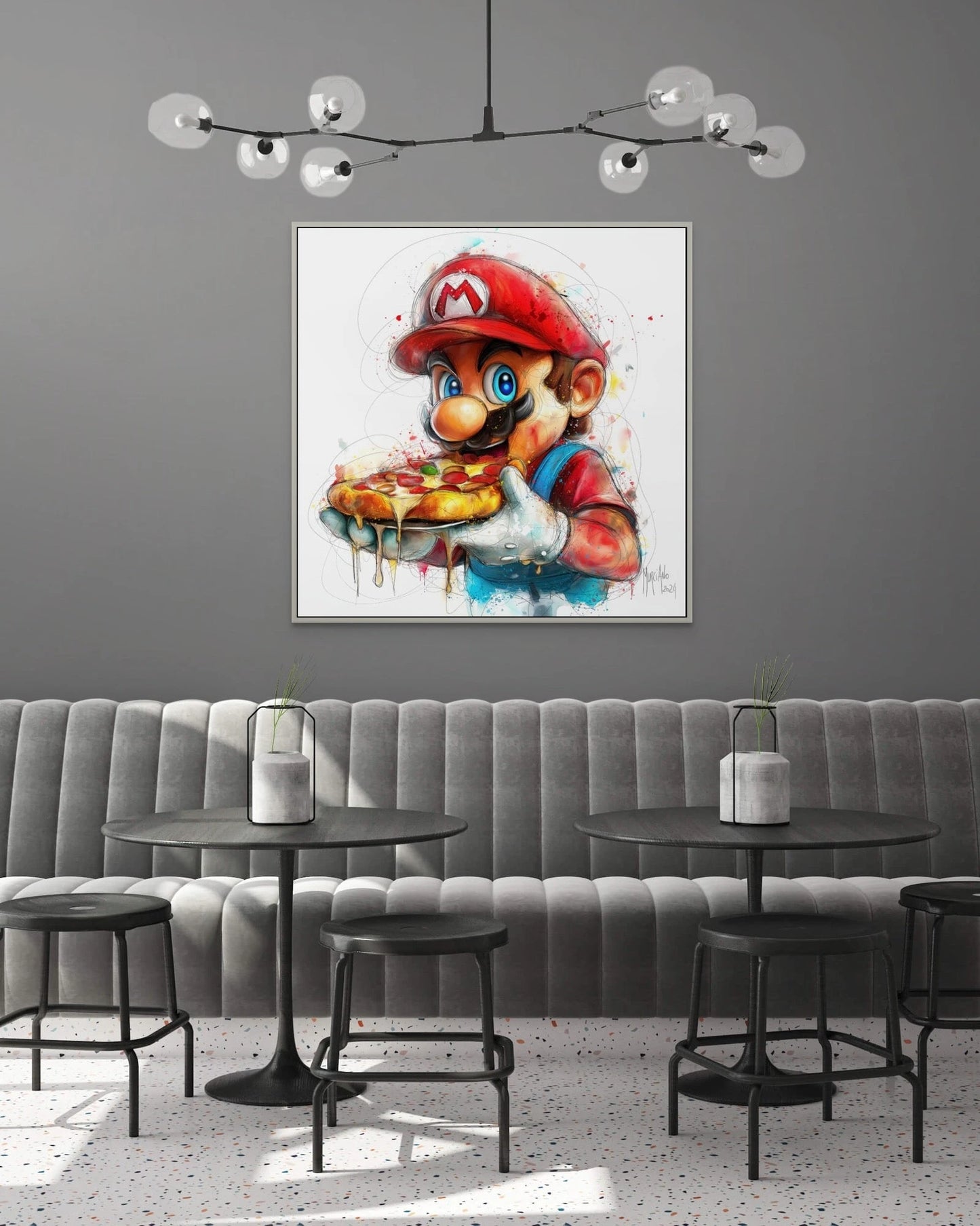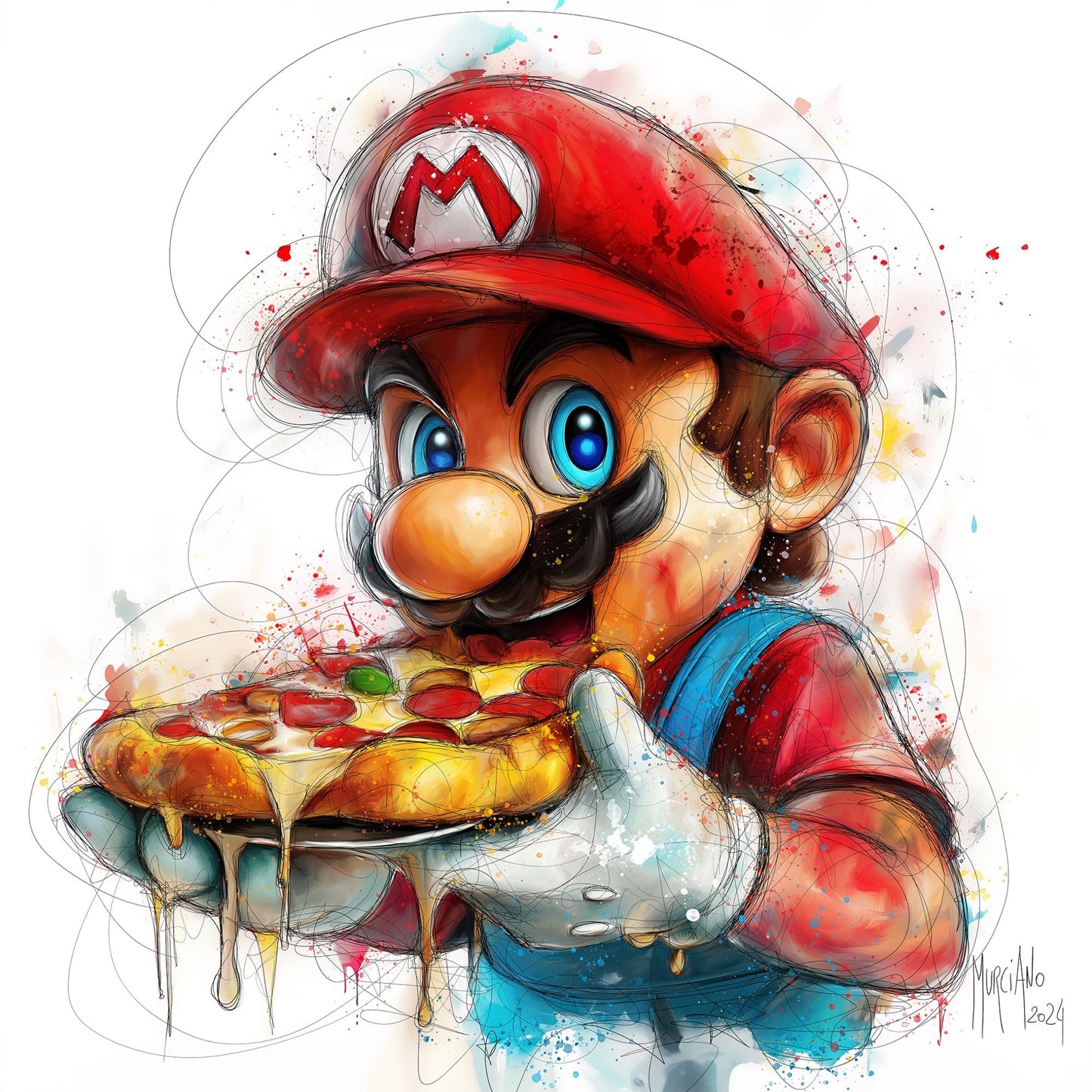 Patrice Murciano's 'Mario Pizza' is a 39"x39" inch. (100x100cm) oil on canvas that whimsically depicts the iconic Super Mario indulging in a cheesy pizza, infused with playful energy and vibrant splatters of color.