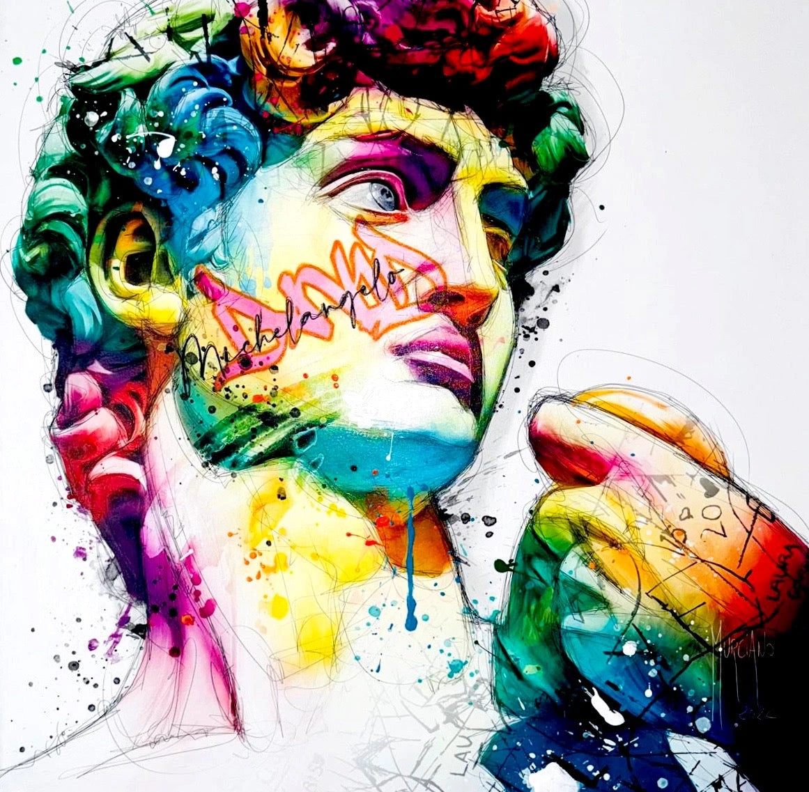 He uses lots of colors and splashes of paint to bring David to life in a new way. The colors are vibrant and playful, making the painting feel energetic and fun. Murciano adds graffiti elements, like the name "Michelangelo" written across David's face, blending classic art with street art. This mix of styles makes the painting feel modern and exciting. David's face is the focus of the painting.