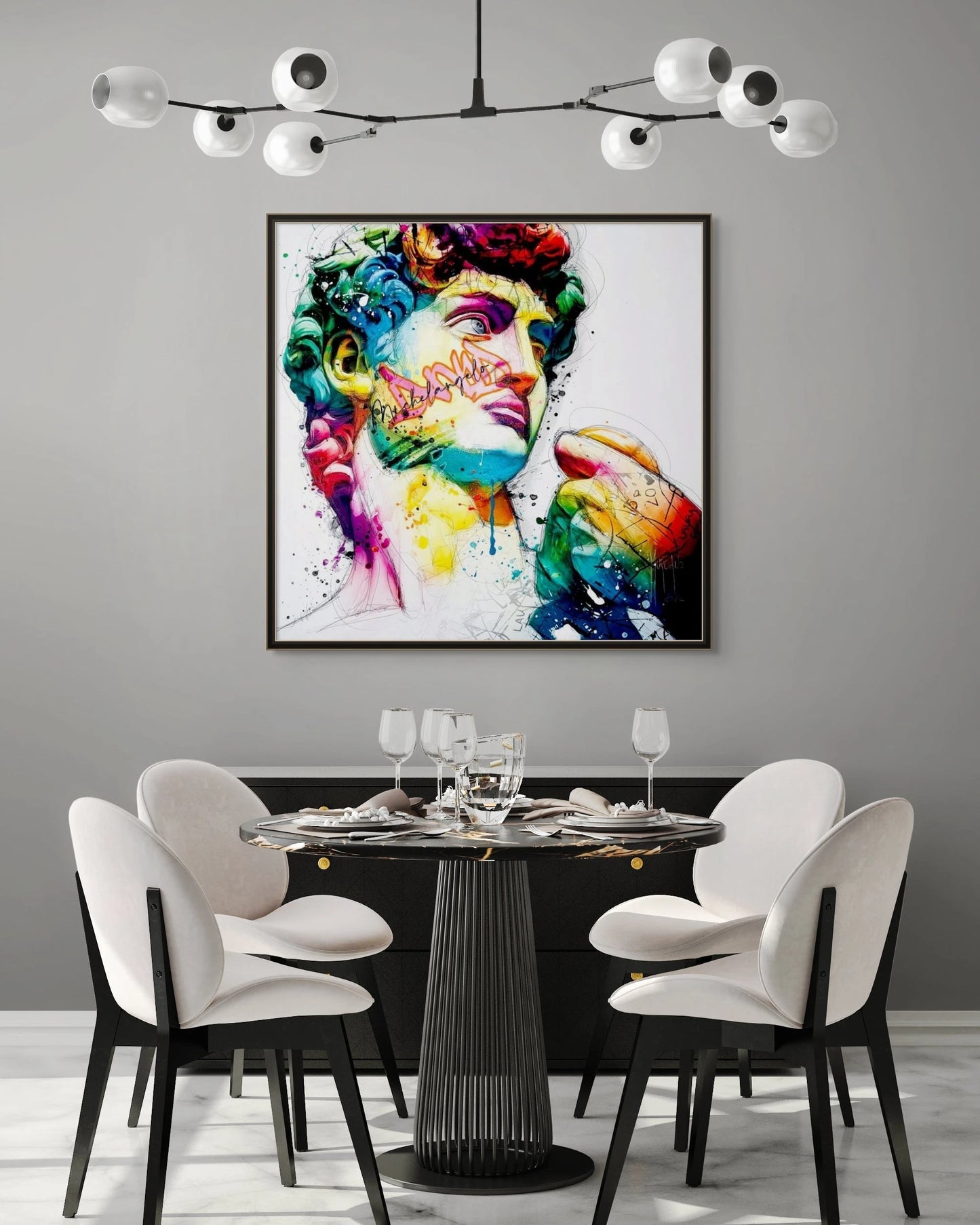 The graffiti elements add a modern touch, making the painting feel fresh and contemporary. This painting is perfect for anyone who loves art that is both classic and modern. It would look great in a living room, office, or gallery.