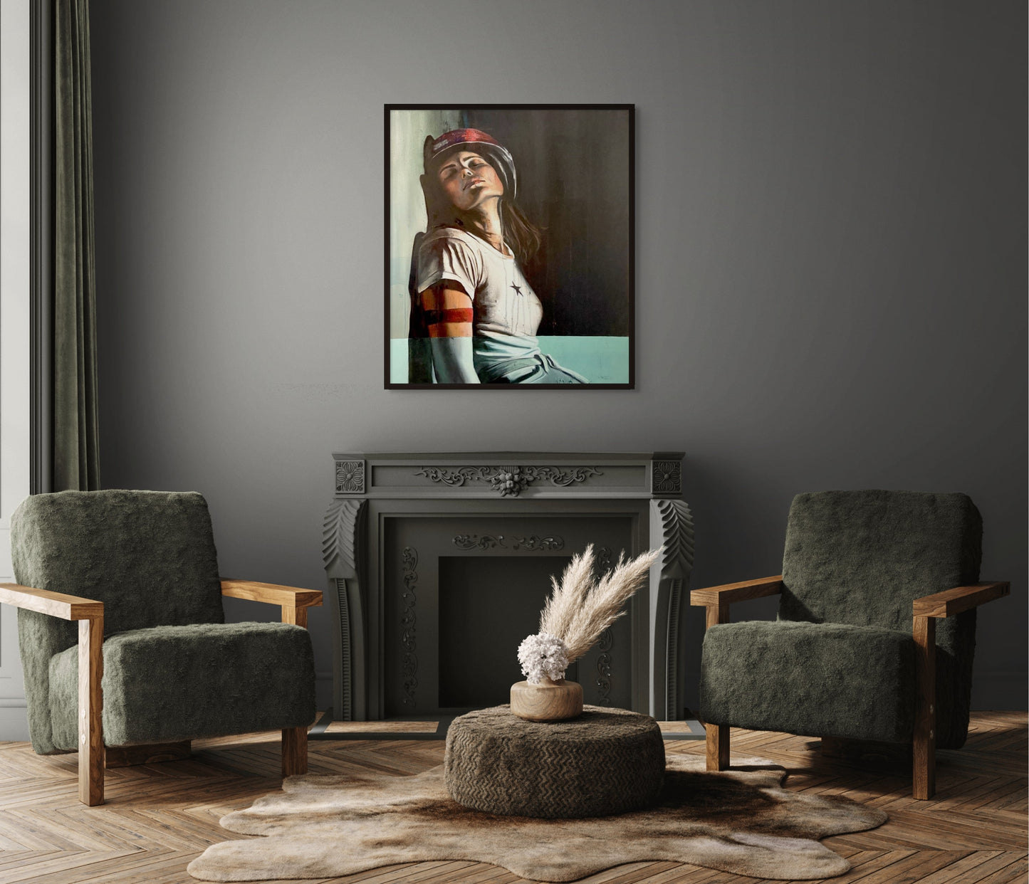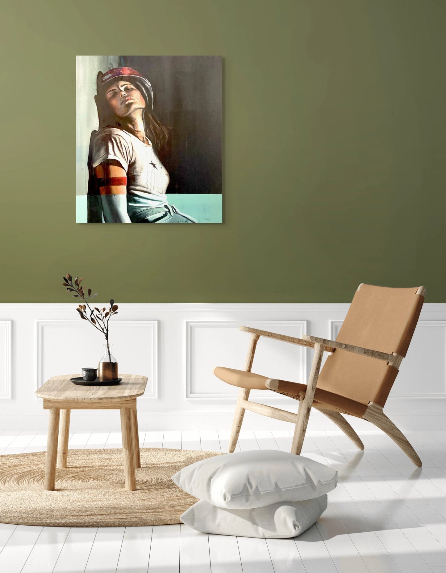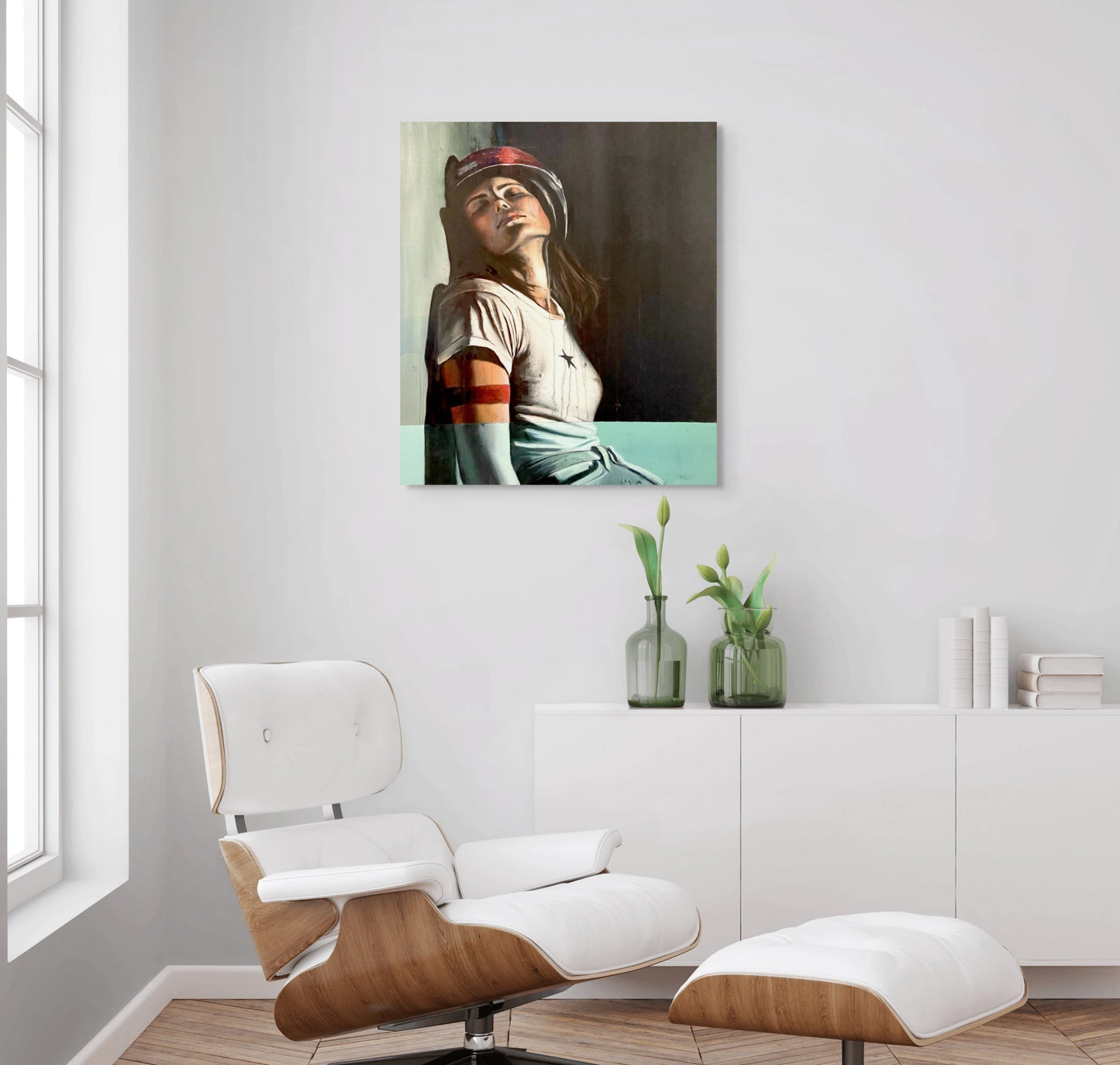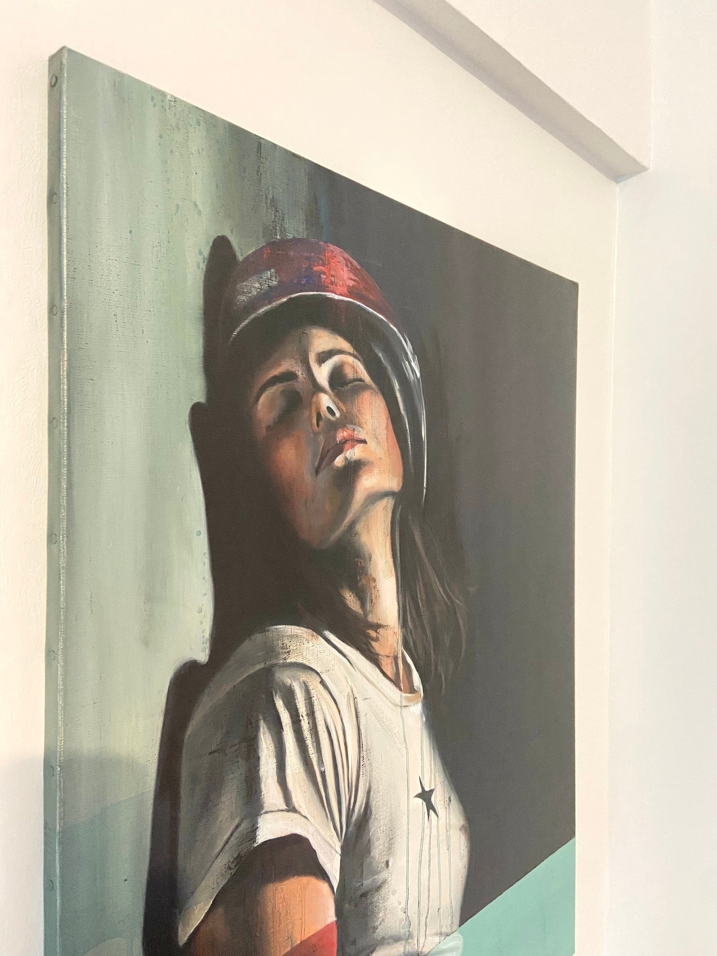 In "Wall of Quiet" Mathieu Questel captures a compelling moment of introspection through the evocative interplay of light and shadow. This 2025 oil on canvas presents a young woman draped in the raw textures of resilience and vulnerability.
