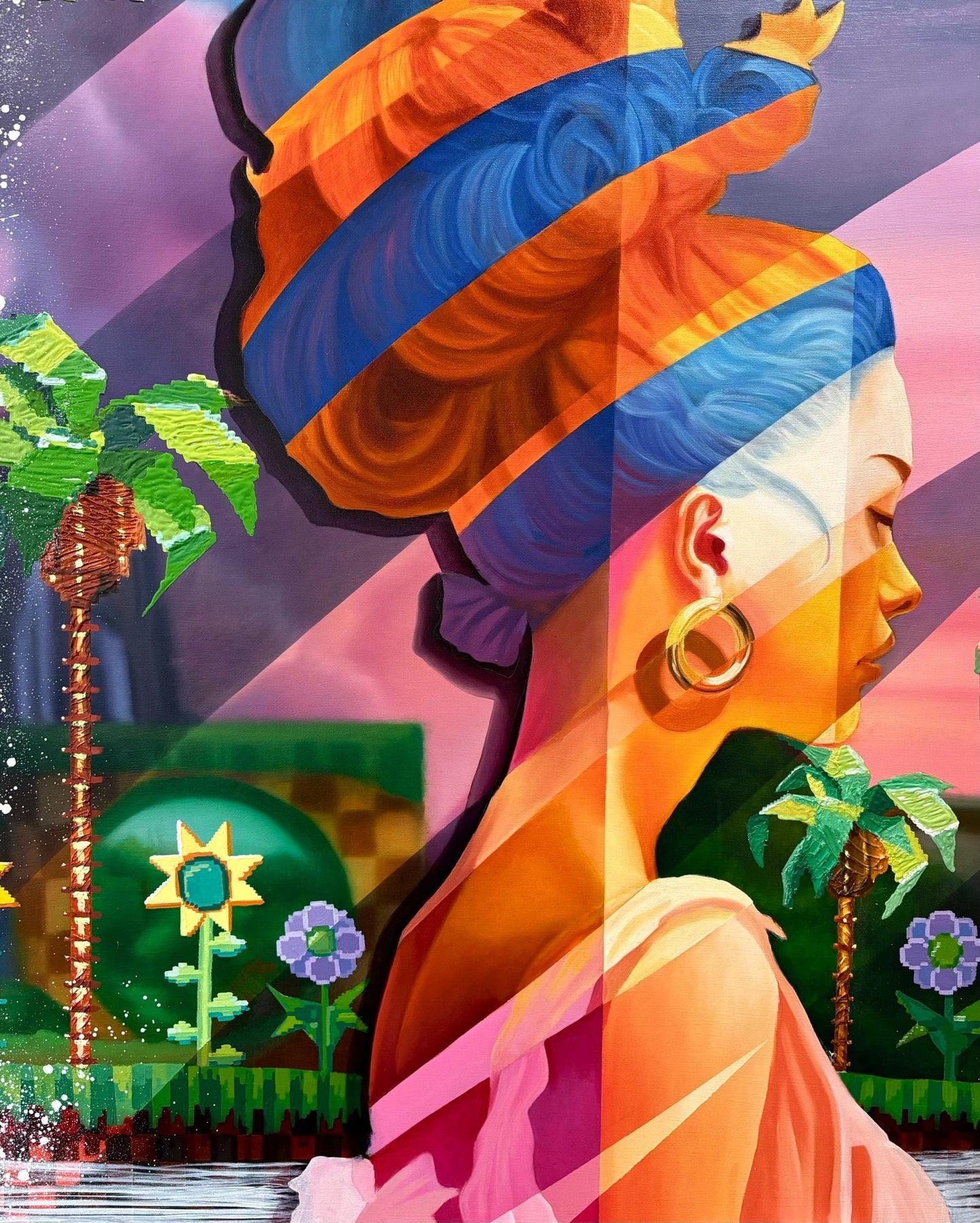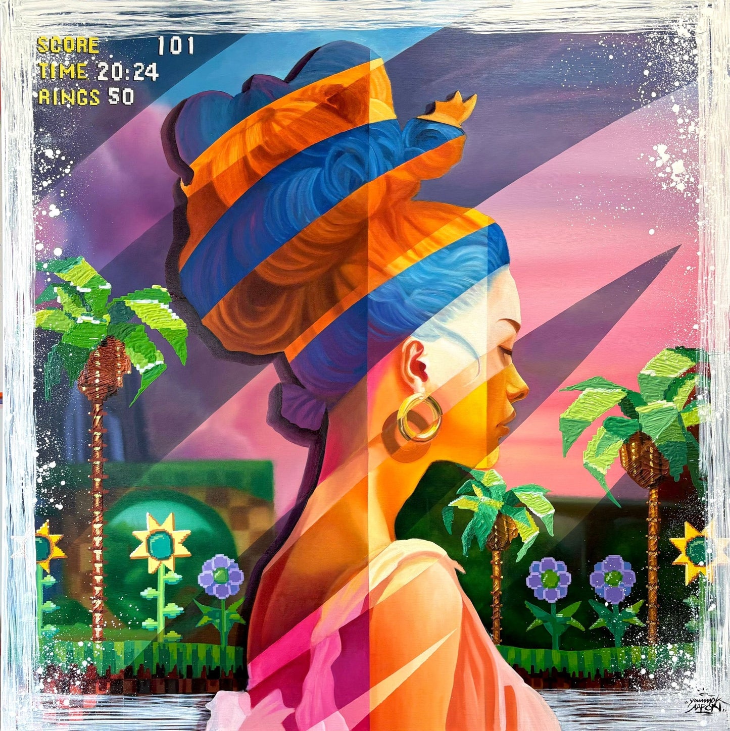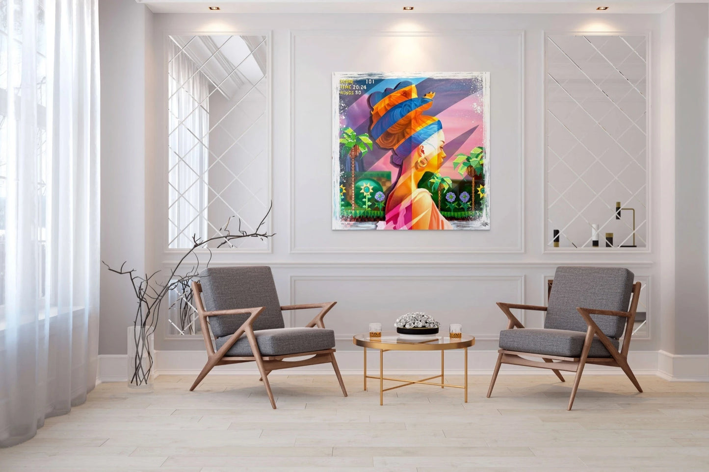 This 51x51 inches (130x130 cm) painting on canvas features a fusion of acrylic and oil mediums, offering a vivid, stylized profile of a woman. It merges vibrant geometric patterns, evocative of digital glitches, with tropical and classic video game motifs, enhancing the pop art aesthetic. The scoreboard-like text adds a unique, game-inspired twist.