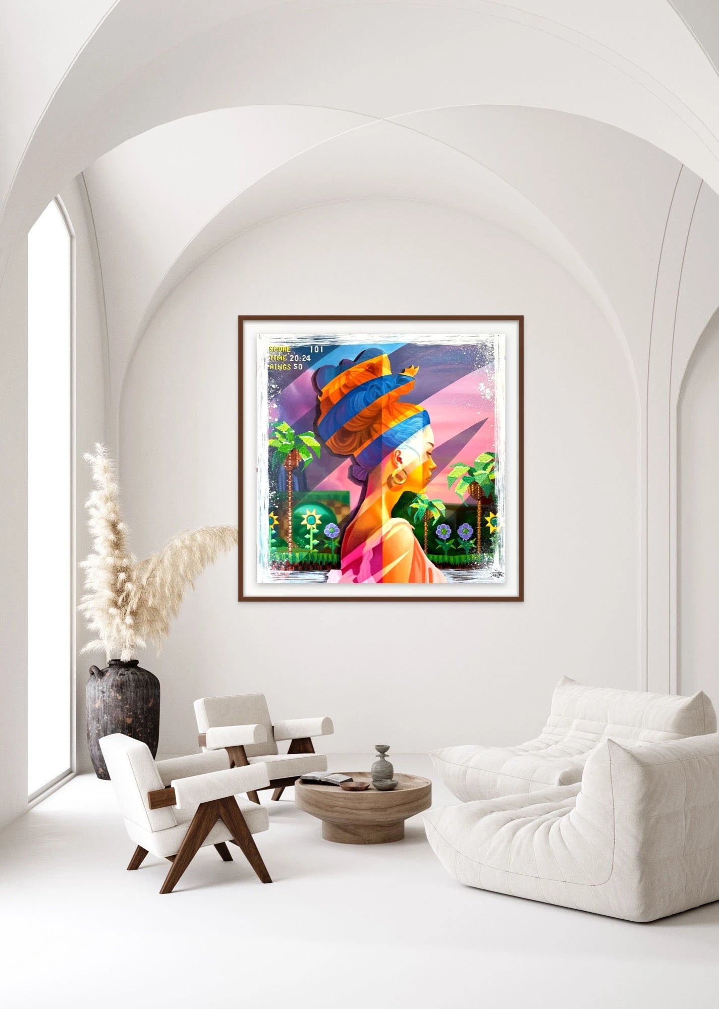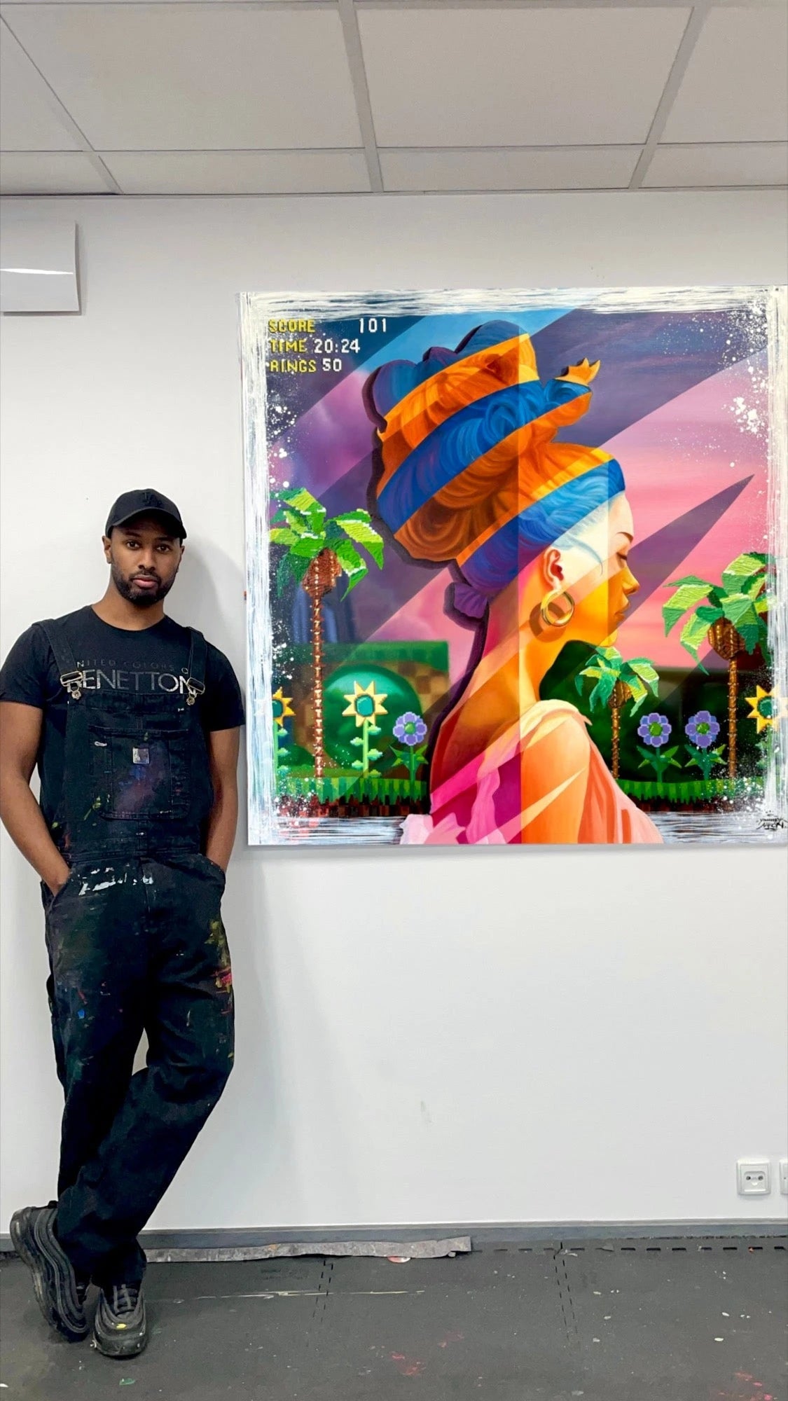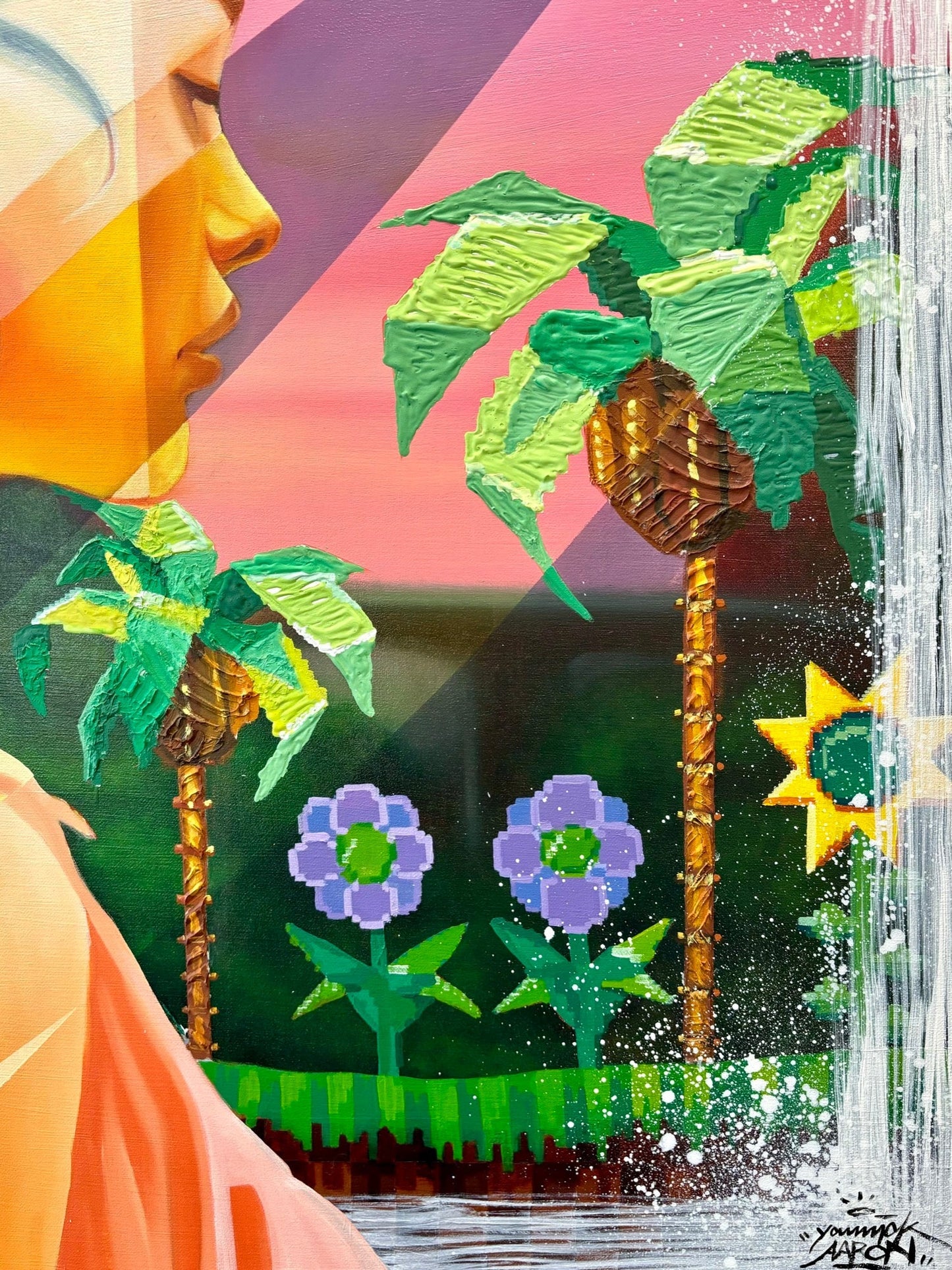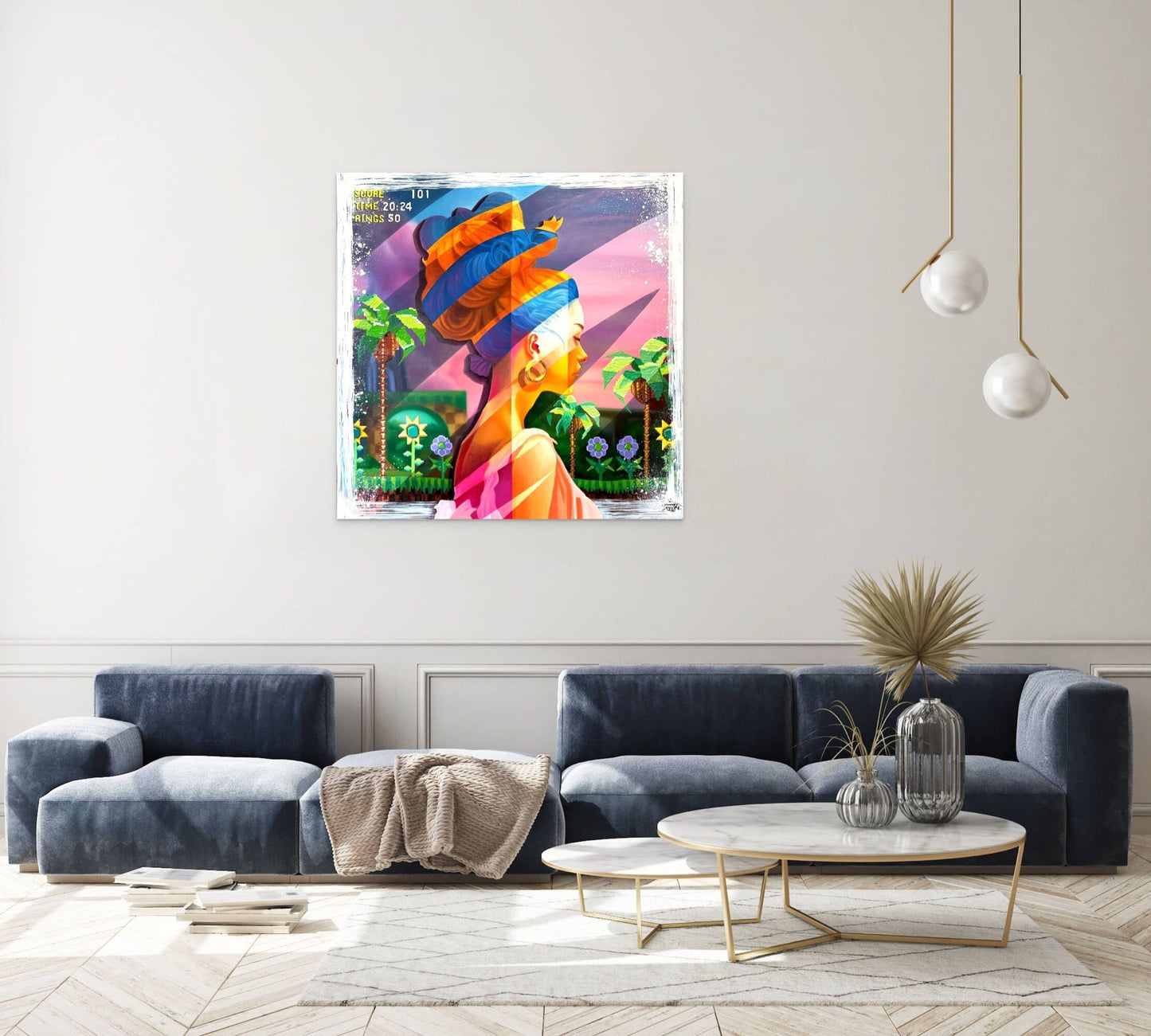 This 51x51 inches (130x130 cm) painting on canvas features a fusion of acrylic and oil mediums, offering a vivid, stylized profile of a woman. It merges vibrant geometric patterns, evocative of digital glitches, with tropical and classic video game motifs, enhancing the pop art aesthetic. The scoreboard-like text adds a unique, game-inspired twist.