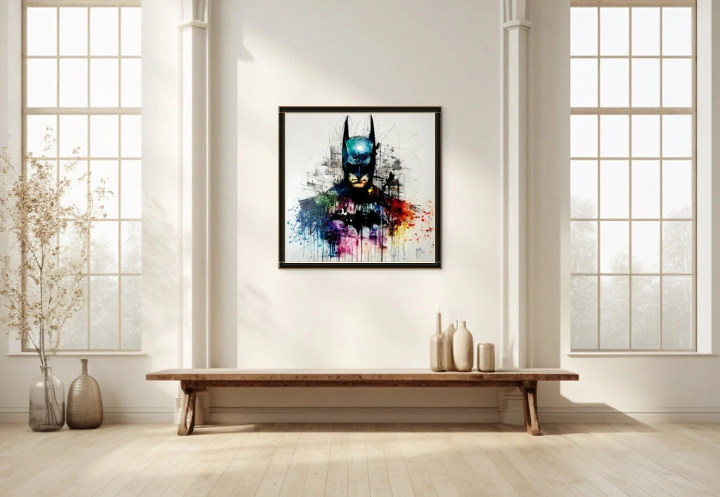 In this piece, Batman stands tall and imposing at the center of the composition. His suit, typically dark and brooding, is reinterpreted with splashes of bright colors that seem to explode from the canvas.