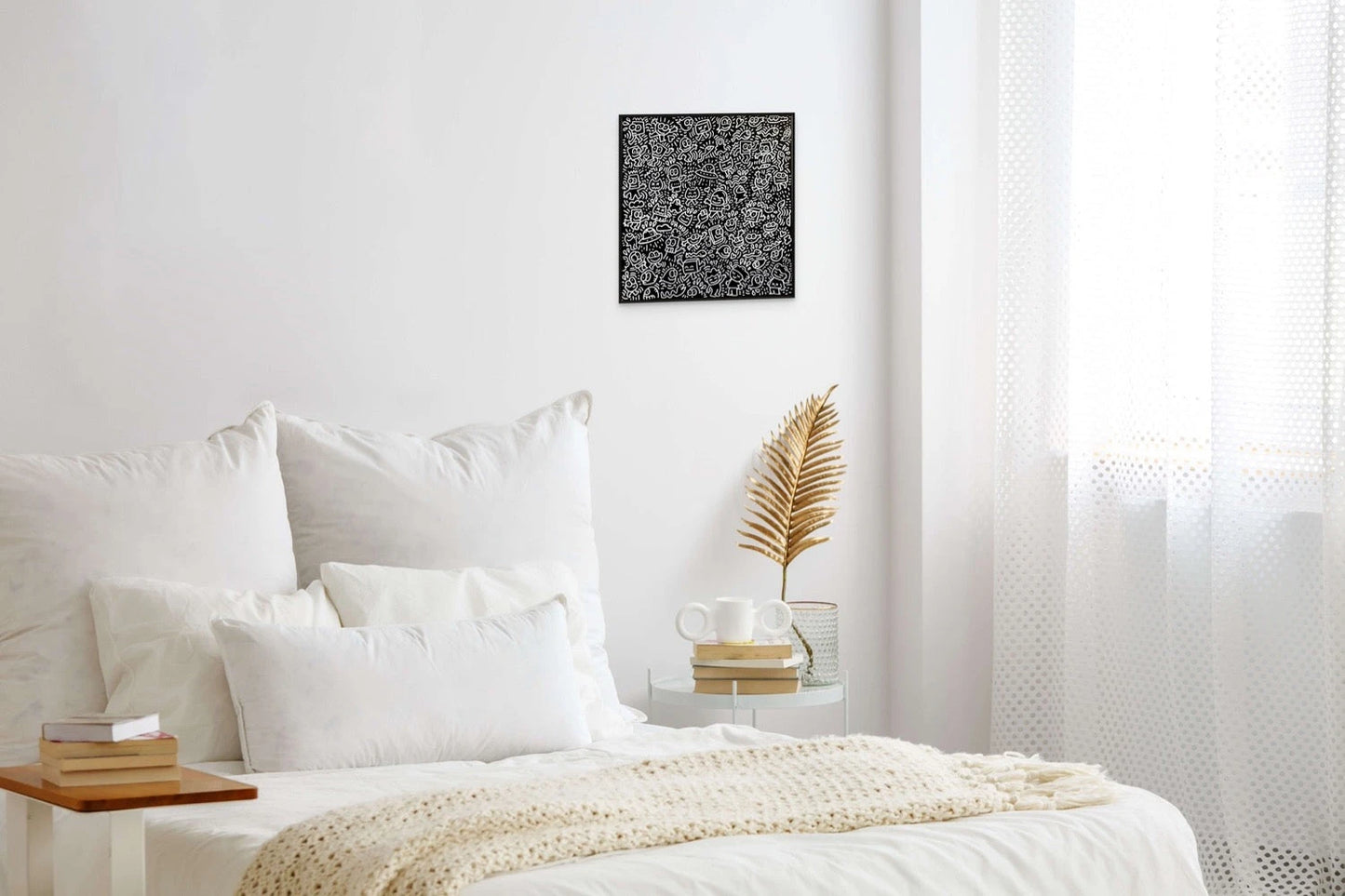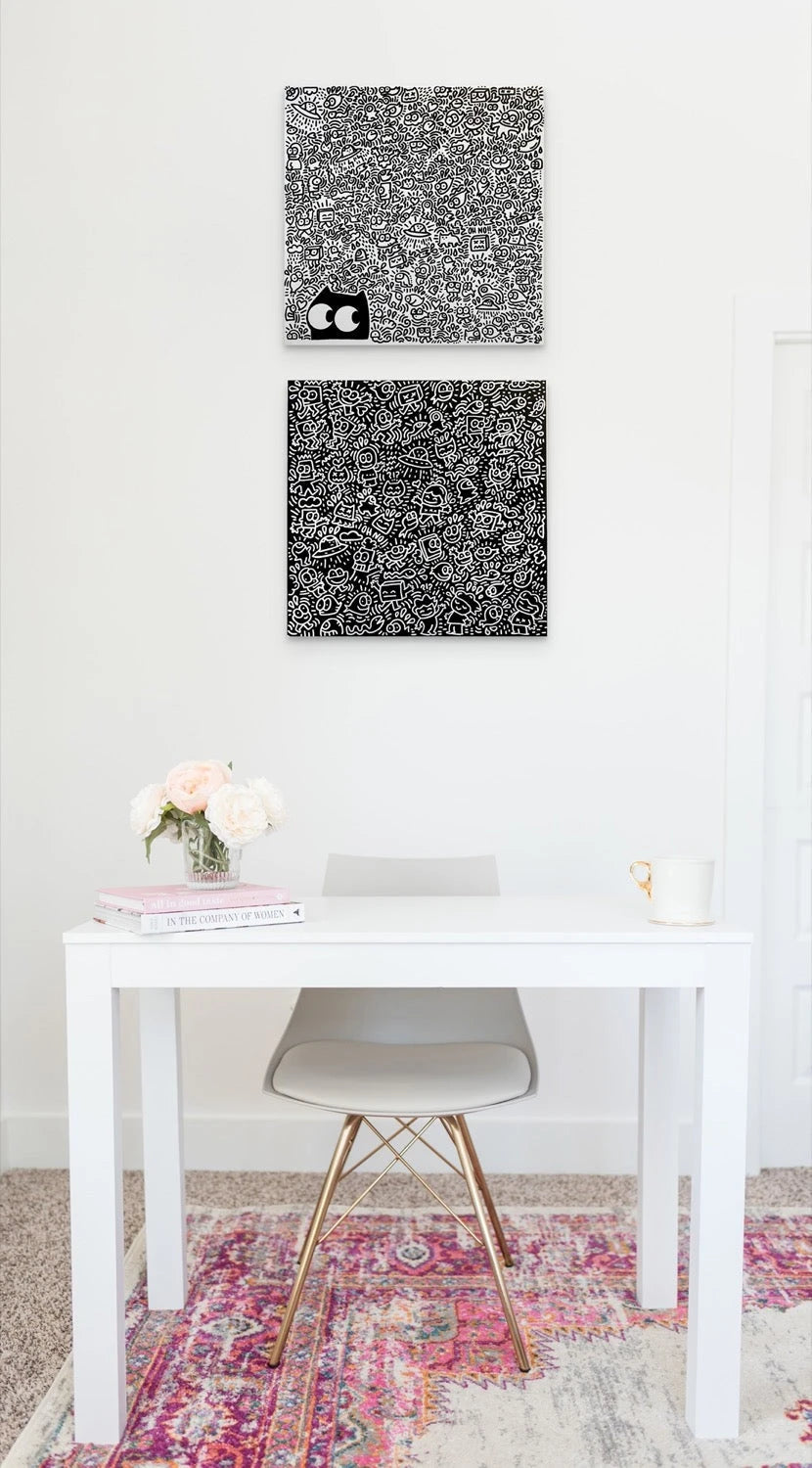 "OFF TOPIC" by BBQUEEN is a visually compelling 16x16" inches piece that playfully defies convention. Central to this vibrant tableau is the 'Confused Cat,' BBQUEEN's iconic character, which appears engulfed in a lively discourse of surrounding doodles. This artwork, rendered in acrylic and marker, pulsates with the energy of spontaneous creativity, challenging the viewer to find coherence in the delightful chaos. Each doodle seems to tell its own story, yet the 'Confused Cat' remains the unifying thread, embodying the artist's signature commentary on the serendipitous nature of life's distractions.