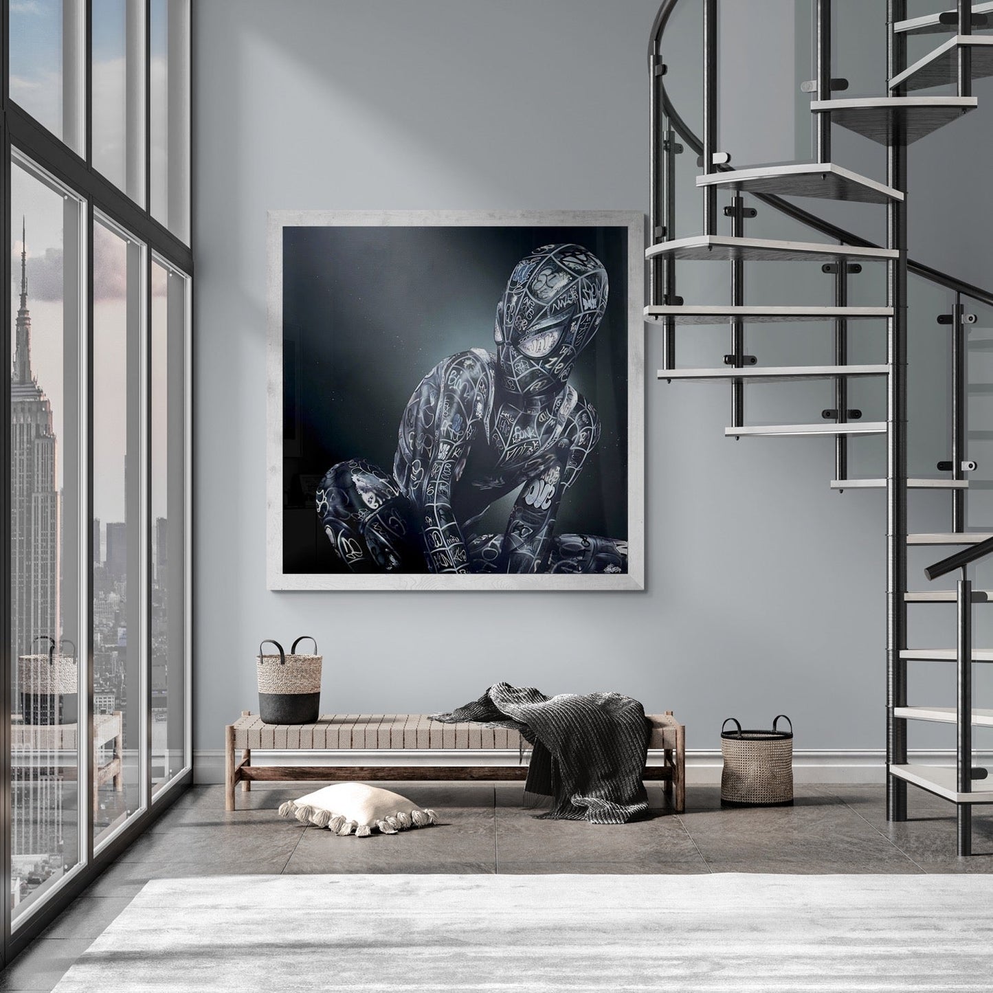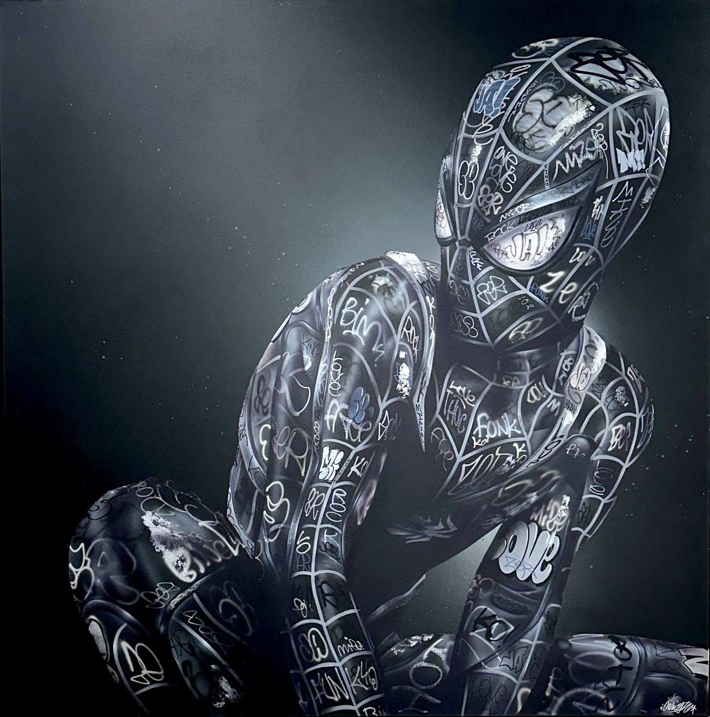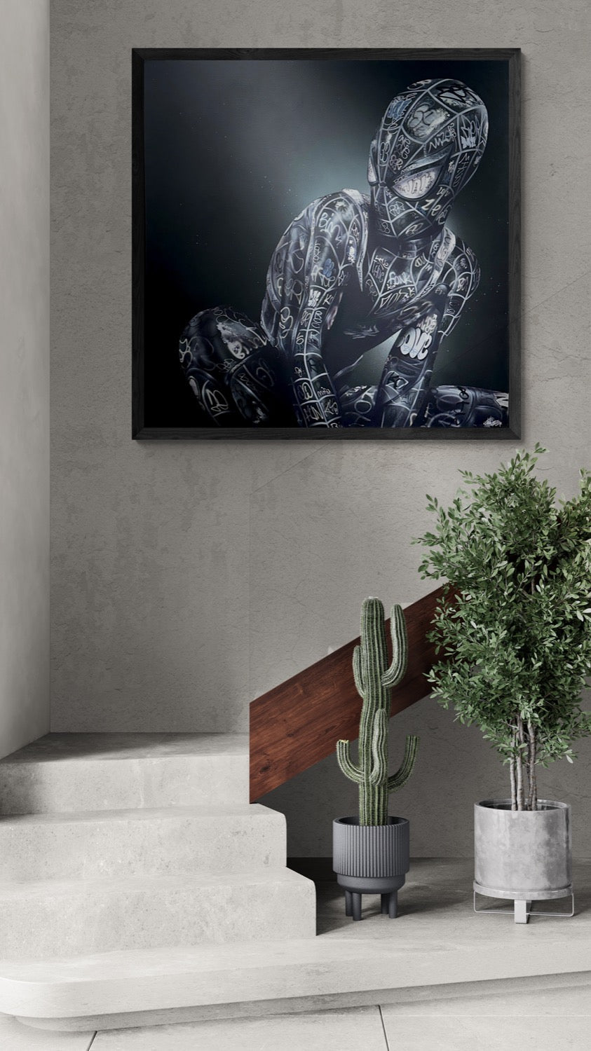 "Spider-Man Peter Marker" by ONEMIZER is a thought-provoking 150x150 cm work (approximately 59x59 inches), showcasing a figure cloaked in the artist's signature graffiti. Seated in reflective solitude, the figure's posture suggests introspection, a moment caught between the buzz of the streets and the quietude of the mind.