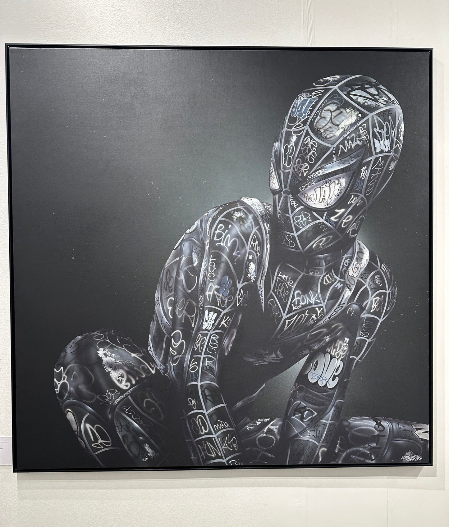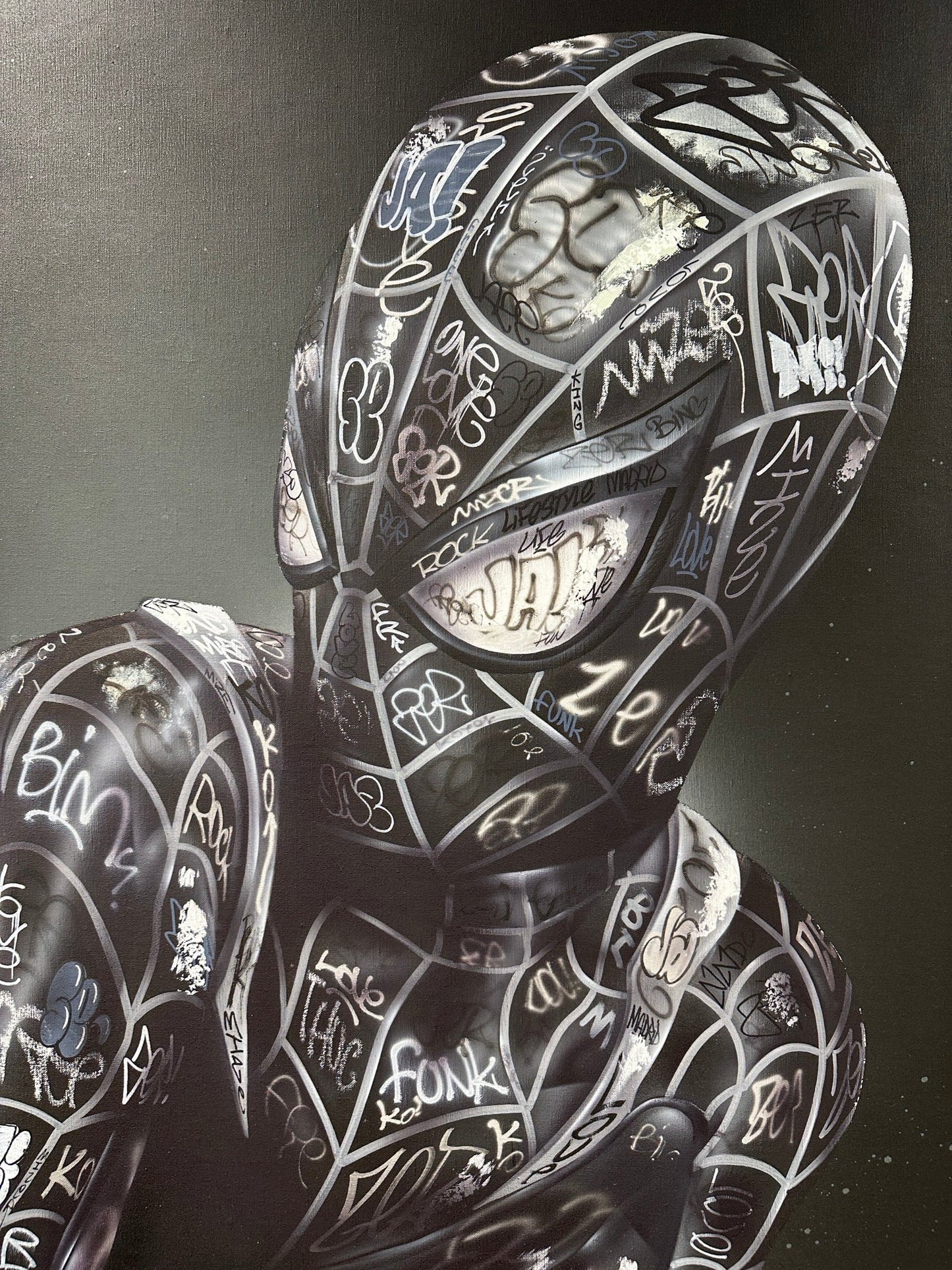 ONEMIZER has transformed the canvas into a living narrative, where the darkness of the background serves to highlight the complex network of graffiti language etched upon the individual.