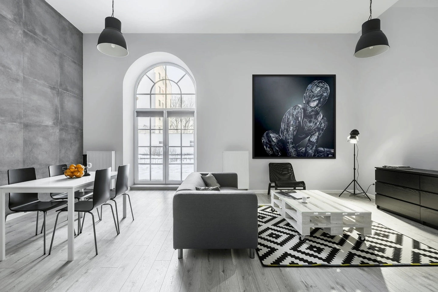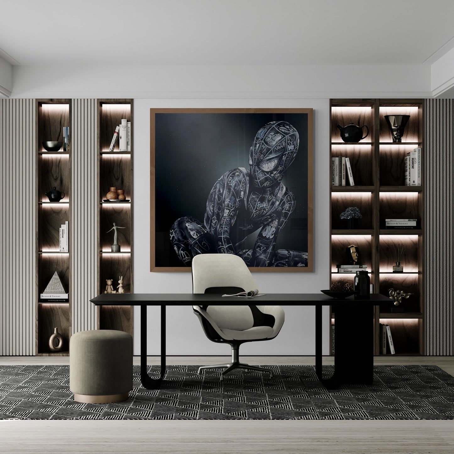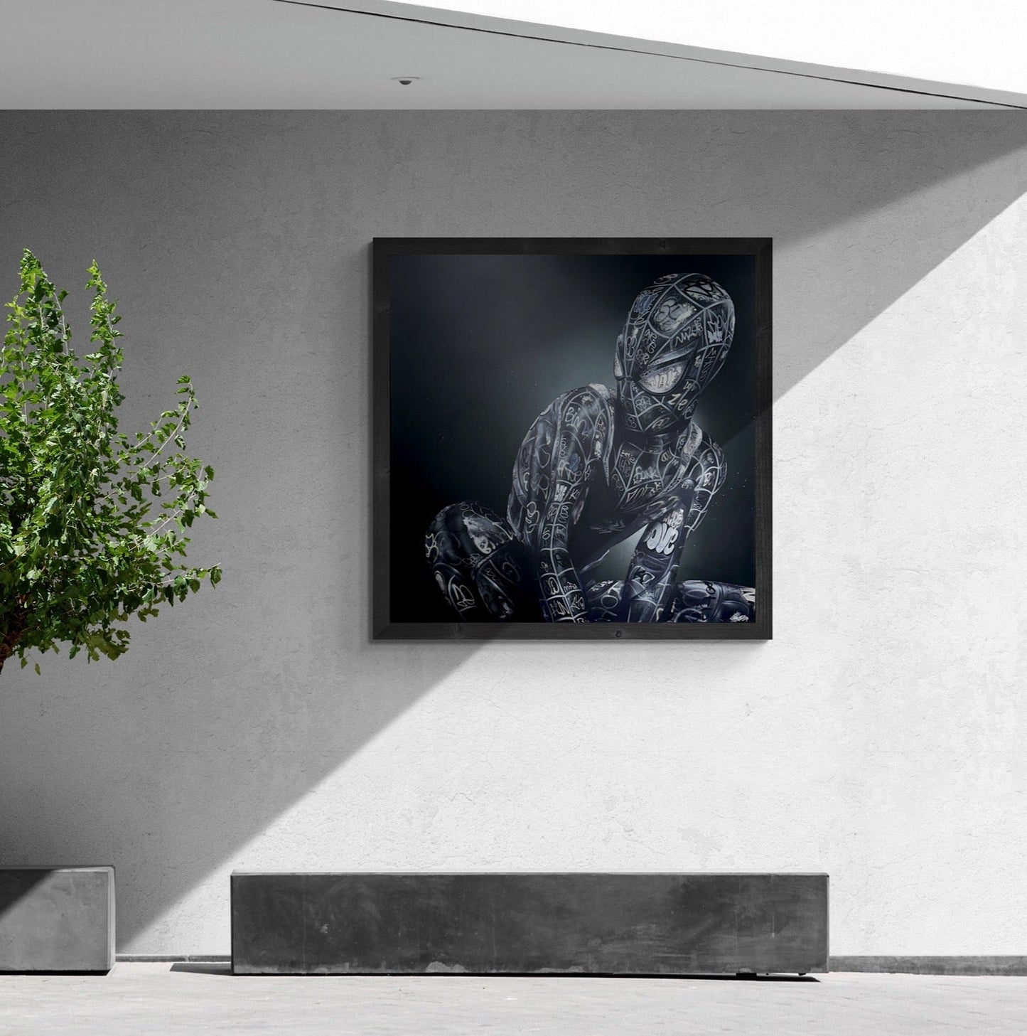 The monochromatic silhouette, composed of a myriad of street art inscriptions, speaks to the multifaceted nature of identity.
