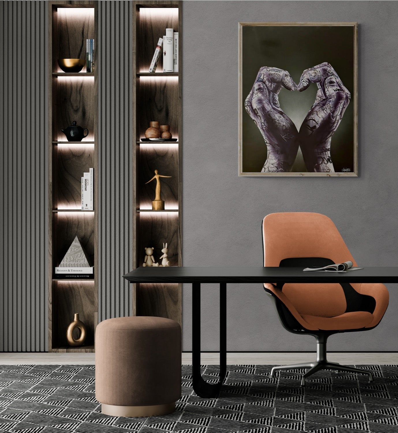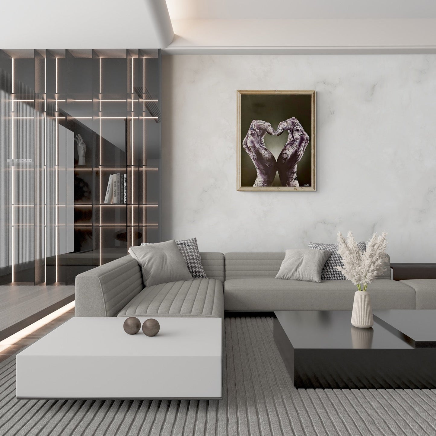 ONEMIZER’s “Hand heart” is a striking 92x73 cm (approximately 36.2x28.7 inches) canvas that captures the essence of connection and the complexity of human interaction.