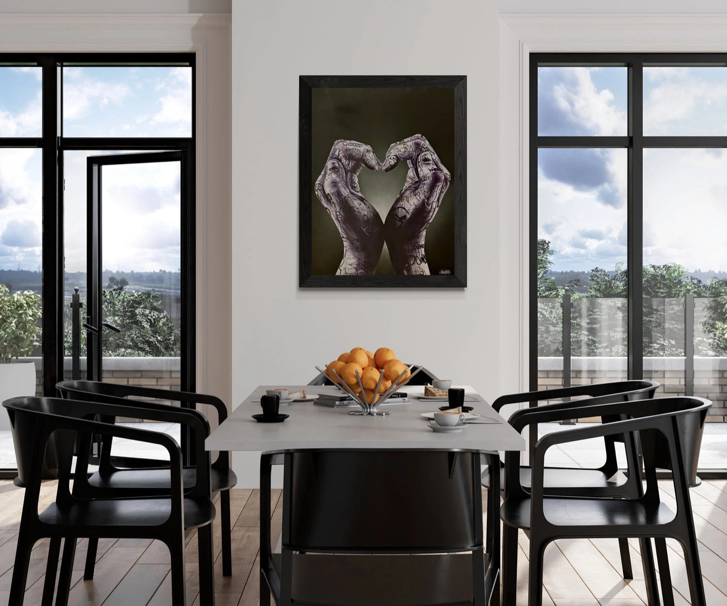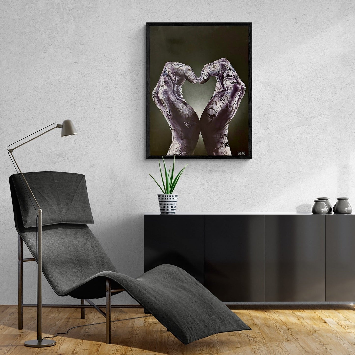 This piece portrays two hands coming together to form a heart shape, each finger adorned with intricate graffiti, suggesting that love and unity are as complex and detailed as the art that depicts them. In this work, the hands are more than just a symbol of affection; they are canvases themselves, each line of graffiti telling a story, each tag a testament to individual experiences coming together to form a shared narrative.