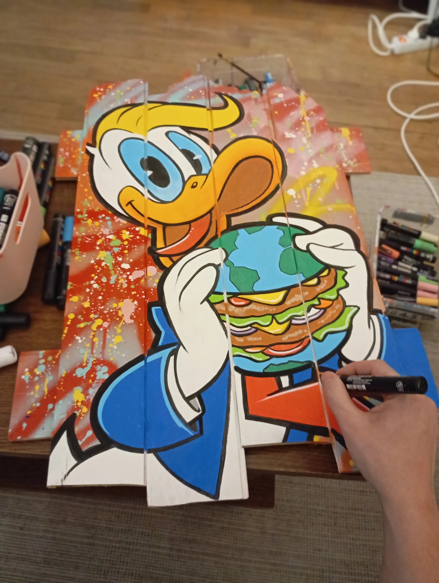 Painting executed by hand with acrylic and markers.