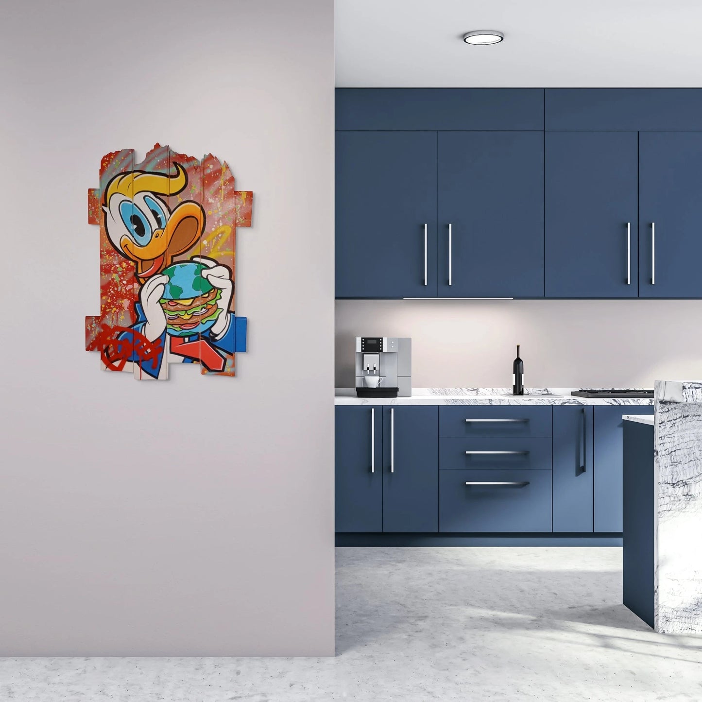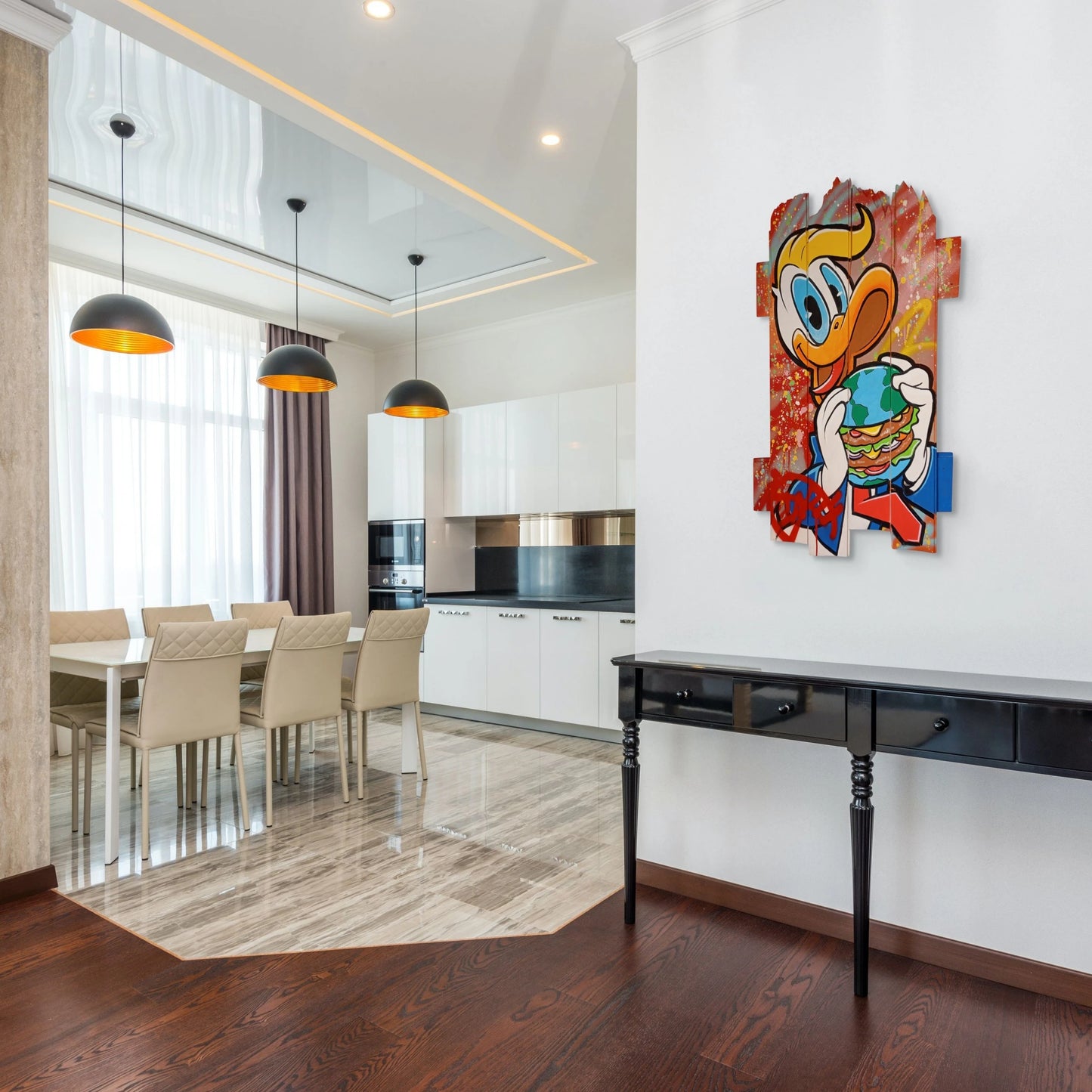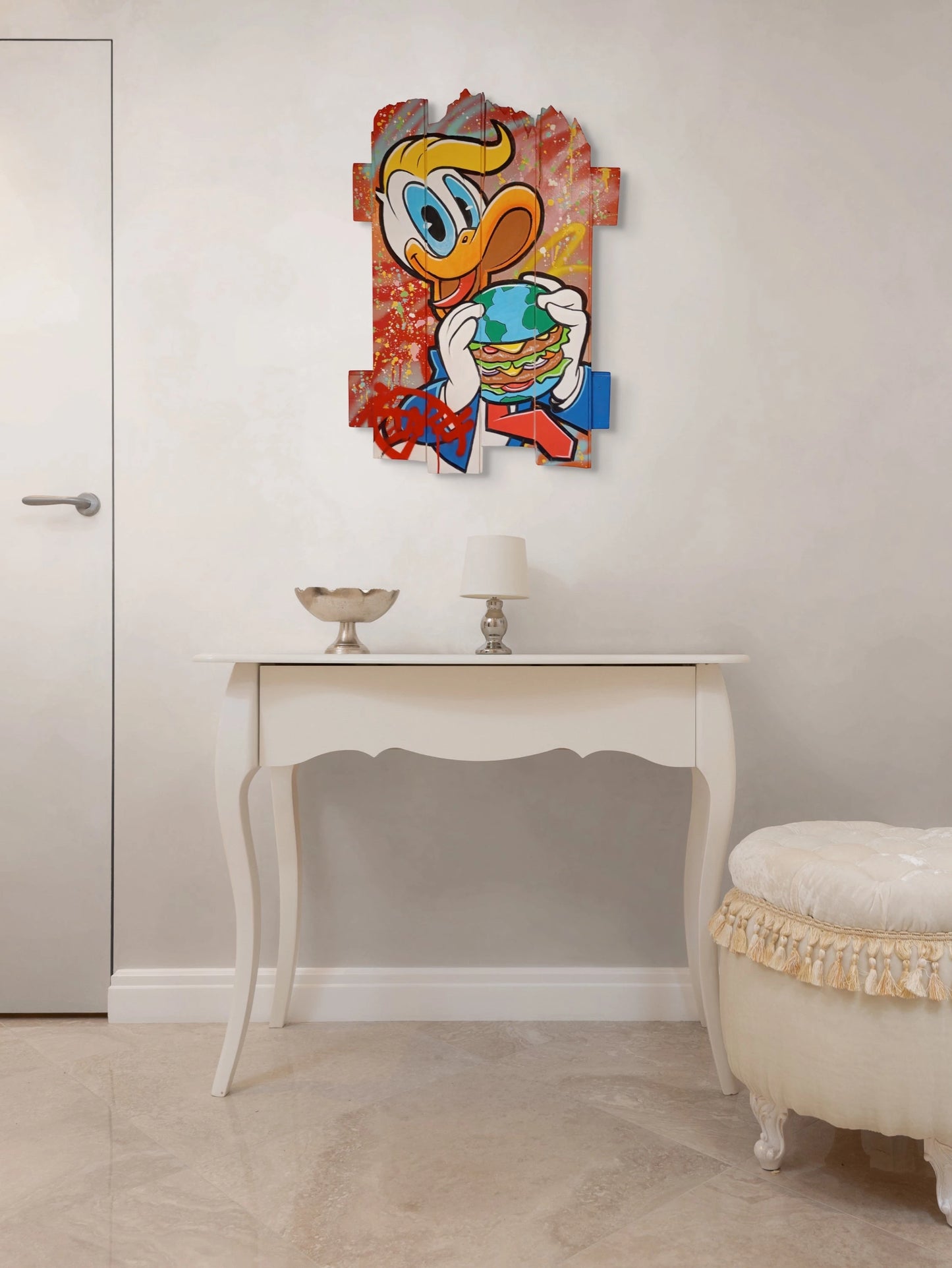 Daru's inspiration is drawn from a myriad of influences, encompassing everything from the rhythms of daily life to the grandeur of luxury brands. His artworks dance on the line between satire and homage, infusing familiar pop culture figures into opulent backdrops. The resulting compositions often carry a subtly comic and critical undertone, playing with the juxtaposition between ordinary characters and extraordinary settings.
