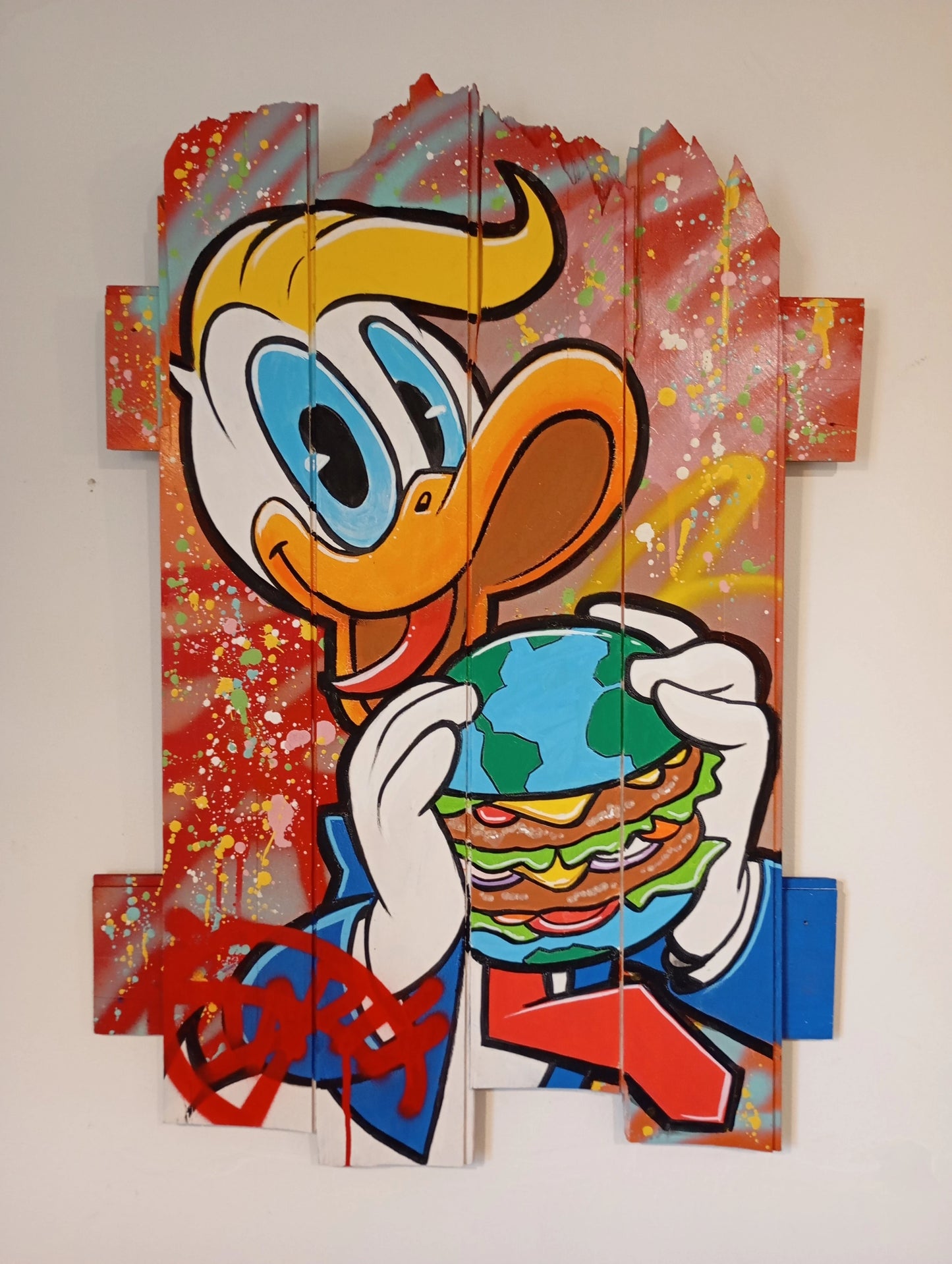 The simplicity of Daru's chosen canvases contrasts strikingly with the complex, colorful world he paints upon them. Utilizing a mix of spray paint and markers, he merges the lines between cartoon illustration and urban art to craft vibrant, eye-catching masterpieces.