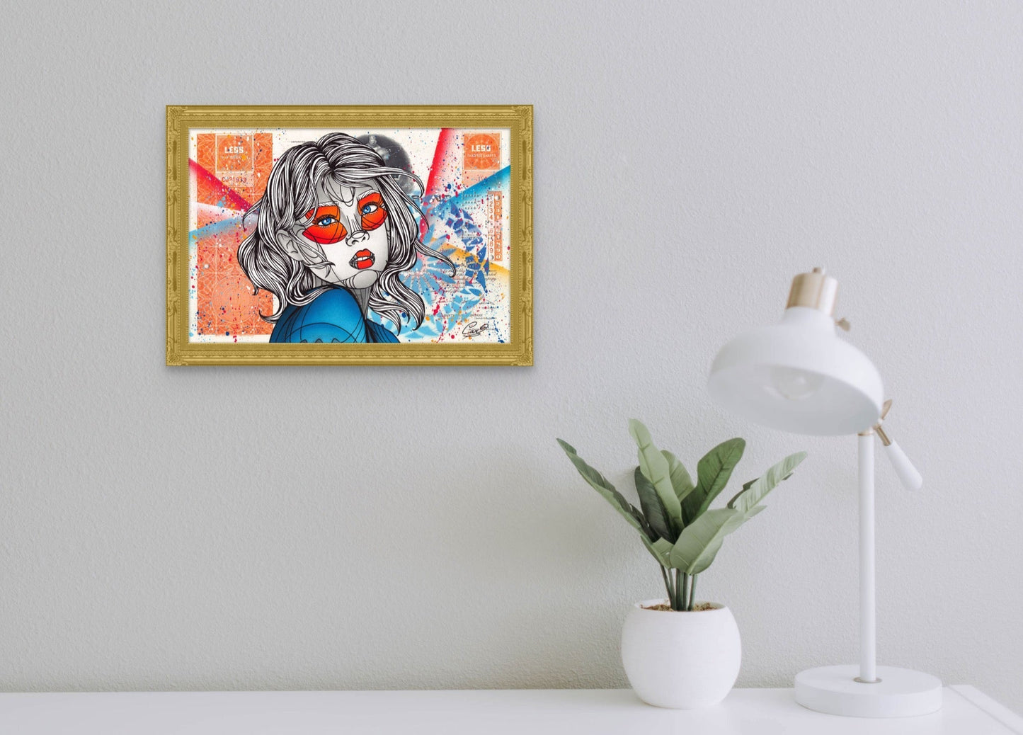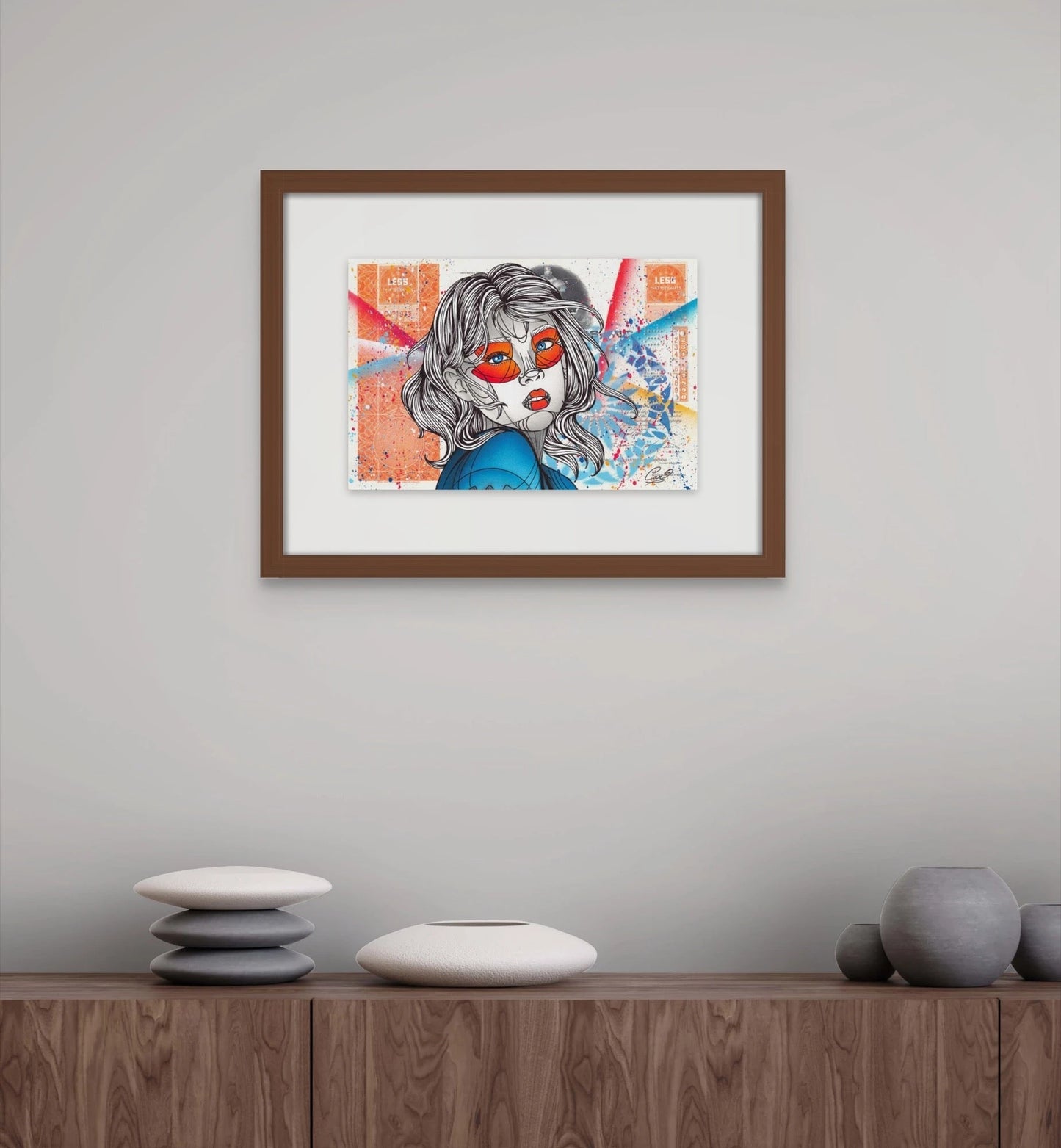 This artworks is an original and unique painting executed on a genuine vintage American stock certificate, nicely framed in 11"x14" in. floating Frame with Polished Glass and Hanging Hardware.