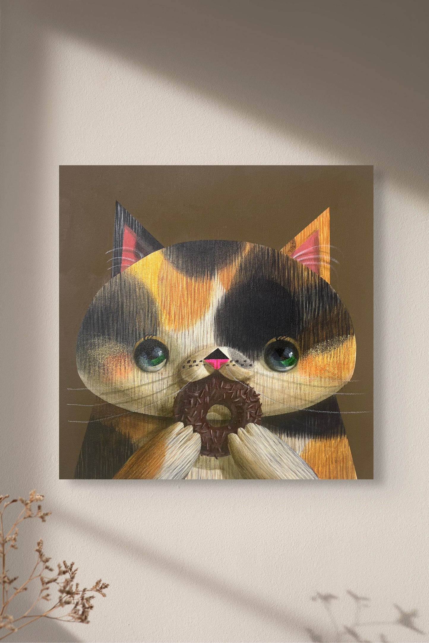 A calico kitten clutching a chocolate-covered donut is the subject of Akio Harada's endearing and whimsical painting "Invitation to My Mouth". As it looks ahead, the cat's big green eyes and cute pink nose radiate joy and curiosity, drawing the observer into its fun moment. The warm brown background heightens the homey and welcoming ambiance, while the detailed textures of the cat's fur and the donut's sprinkles provide depth and realism. In this charming and endearing work, Harada's skill at capturing both whimsy and detail is evident.