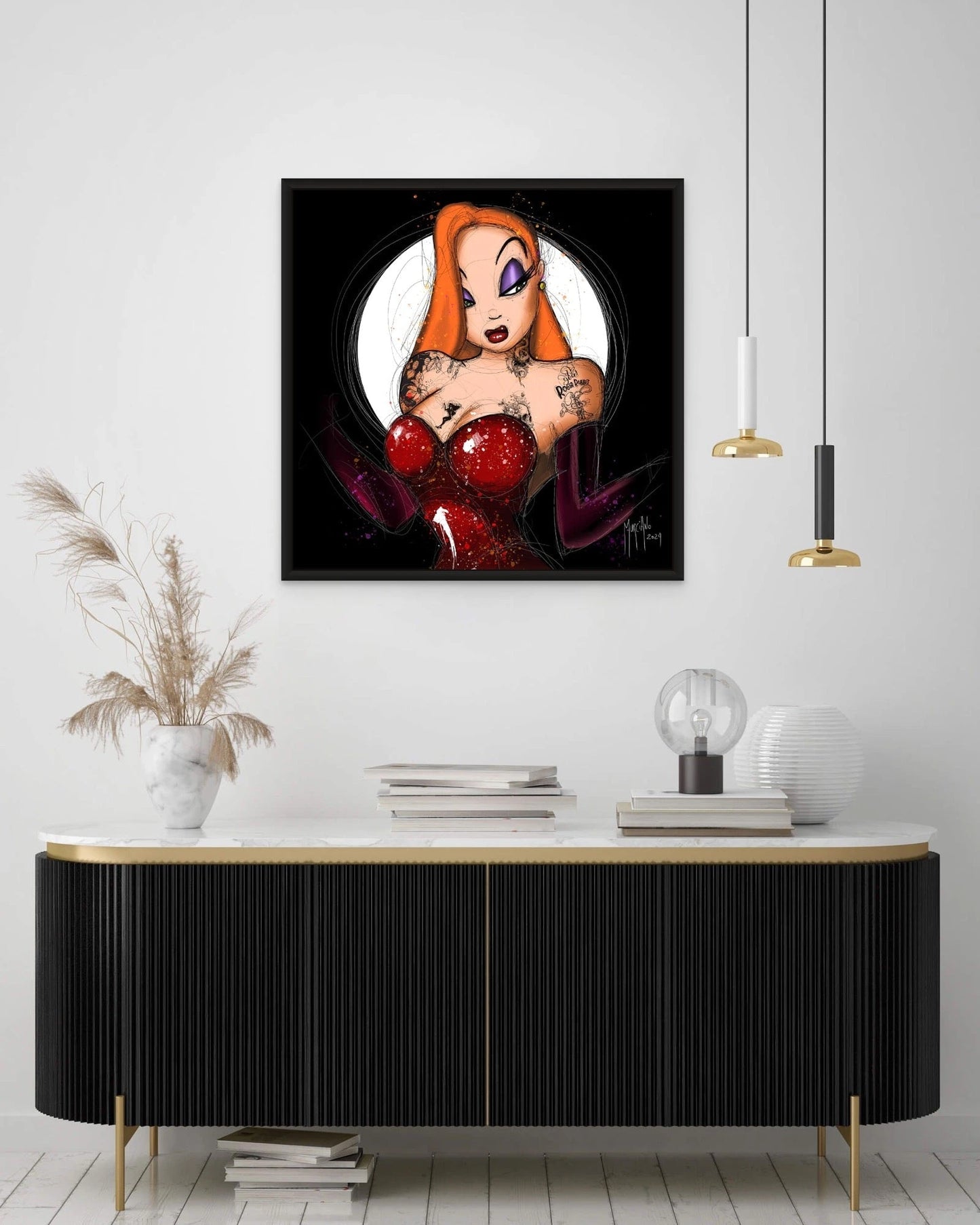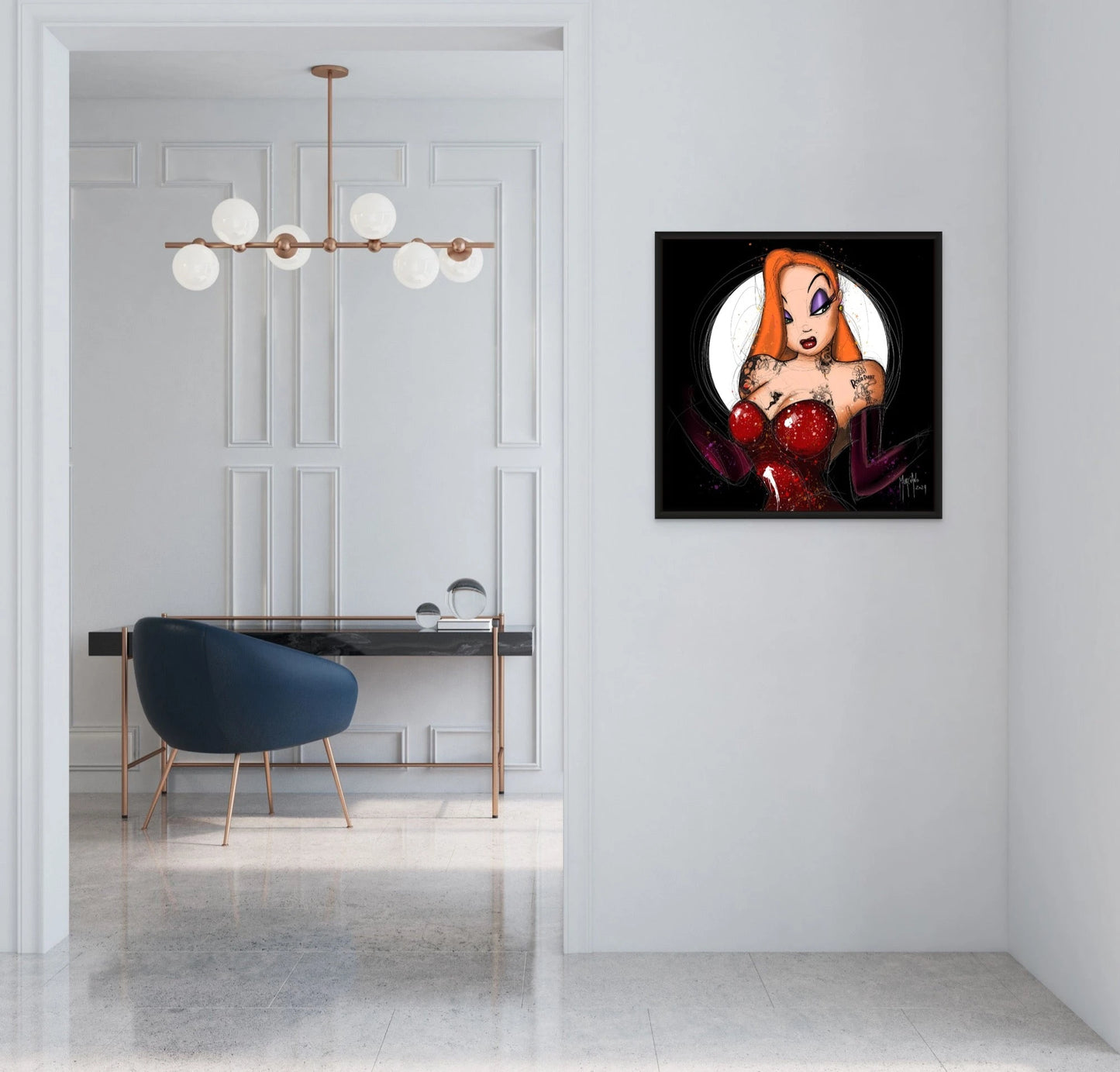 Patrice Murciano's "Jessica Rabbit" is a 39"x39" inch. (100x100cm) oil canvas that captures the sultry allure of the animated diva with a modern twist, showcasing her in a dazzling red with an enigmatic gaze.