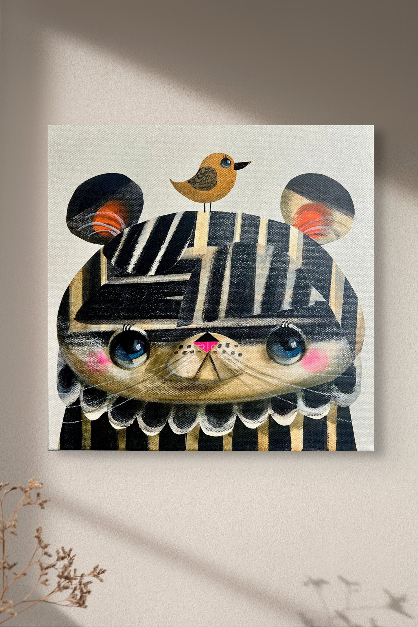 The intriguing and whimsical artwork "Mr. Collage at 2pm" by Akio Harada features a striped kitty with complicated geometric patterns, adorned with pink cheeks and brilliant blue eyes. A cute brown bird perches atop the cat's head, giving the piece of art a lighthearted narrative. The striking stripes are complemented by the delicate lace-like design around the cat's neck, which strikes a balance between style and play. The characters' complex textures and vivid colors are brought to life by the subdued beige background. Harada's own style is evident, skillfully fusing sophistication, playfulness, and charm.