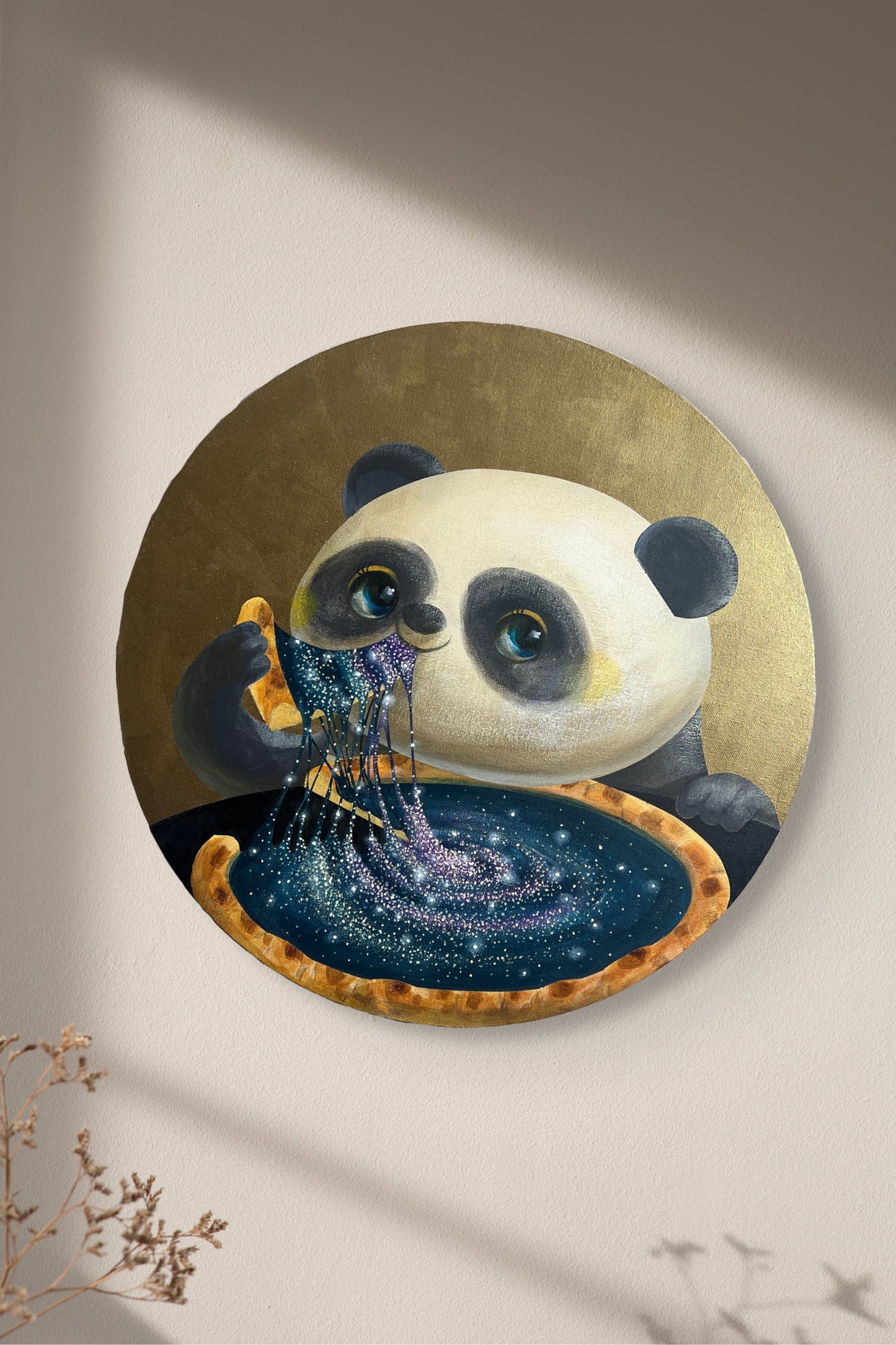 Akio Harada's "Ko Nishite Zen" depicts a cute panda in the bizarre act of consuming a piece of cosmic pie. With galaxies, stars, and sparkling lights spilling over in a captivating show, the spherical canvas reflects the vast universe portrayed in the pie's filling. The panda's soft smile and wide, inquisitive eyes give the composition a whimsical and playful feel. The scenario is elevated by the golden backdrop, which gives it a heavenly and surreal feel. Harada invites viewers into a realm of surprise and imagination by deftly fusing the commonplace with the exceptional.