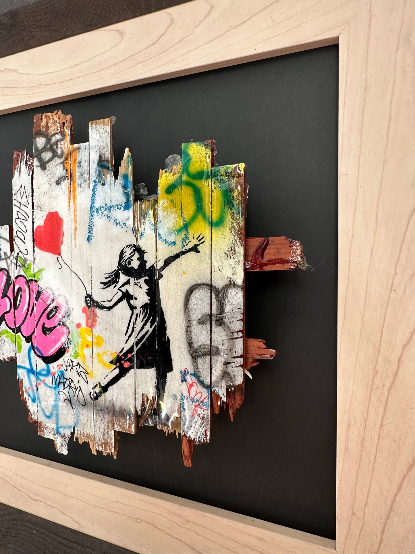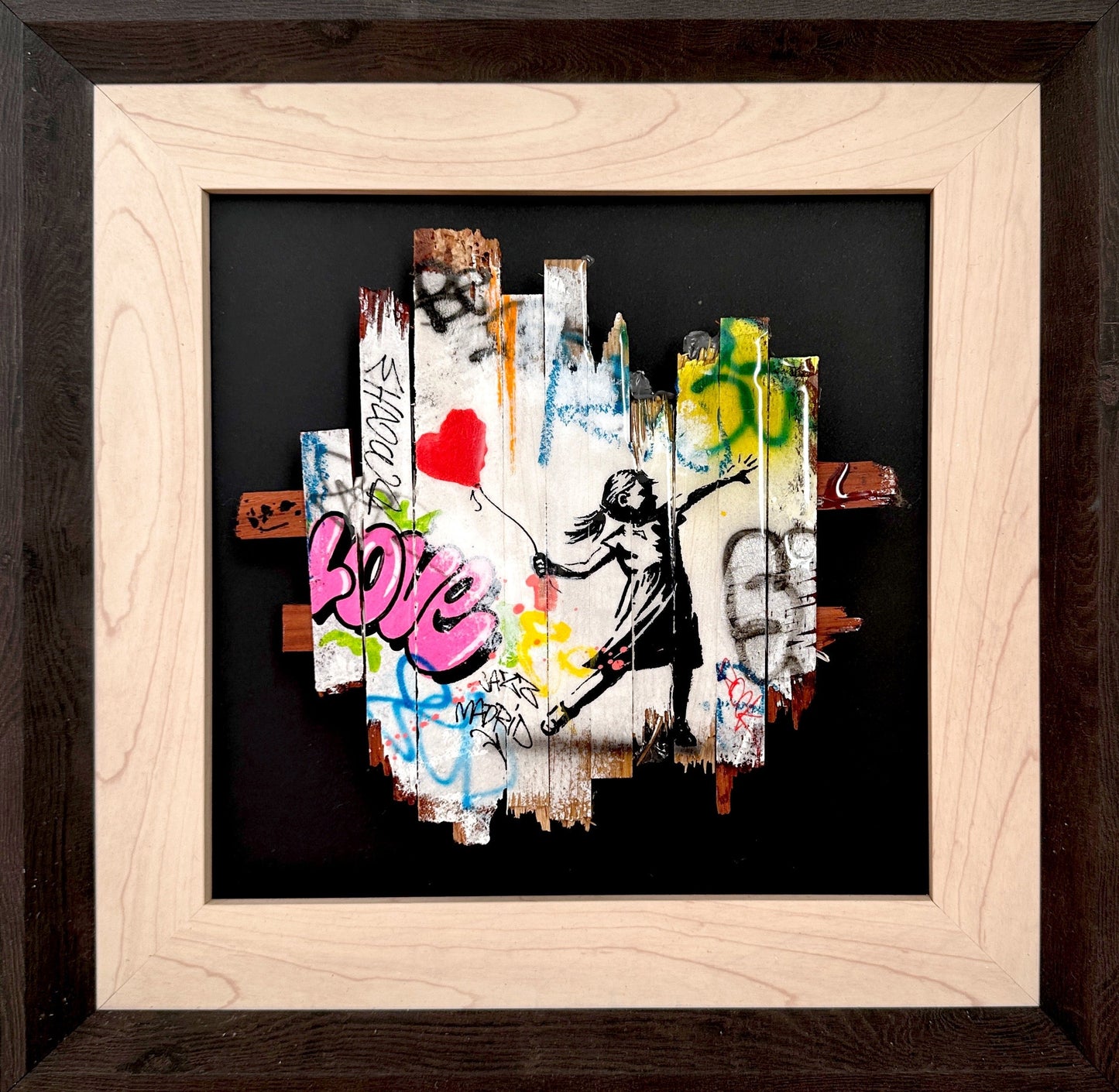 This artwork masterfully combines street art aesthetics with multi-dimensional design, featuring a silhouette of a girl reaching for a red balloon.