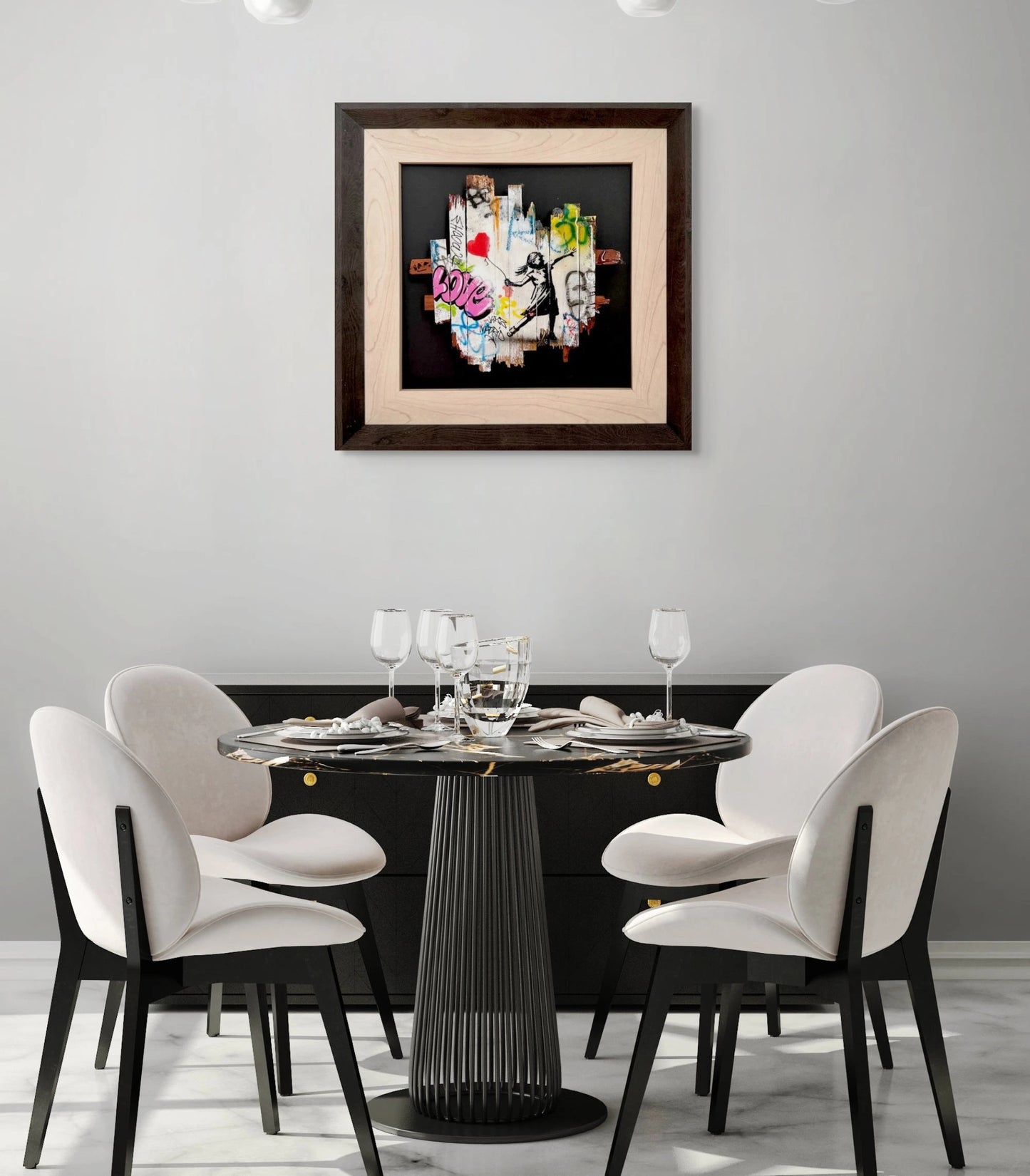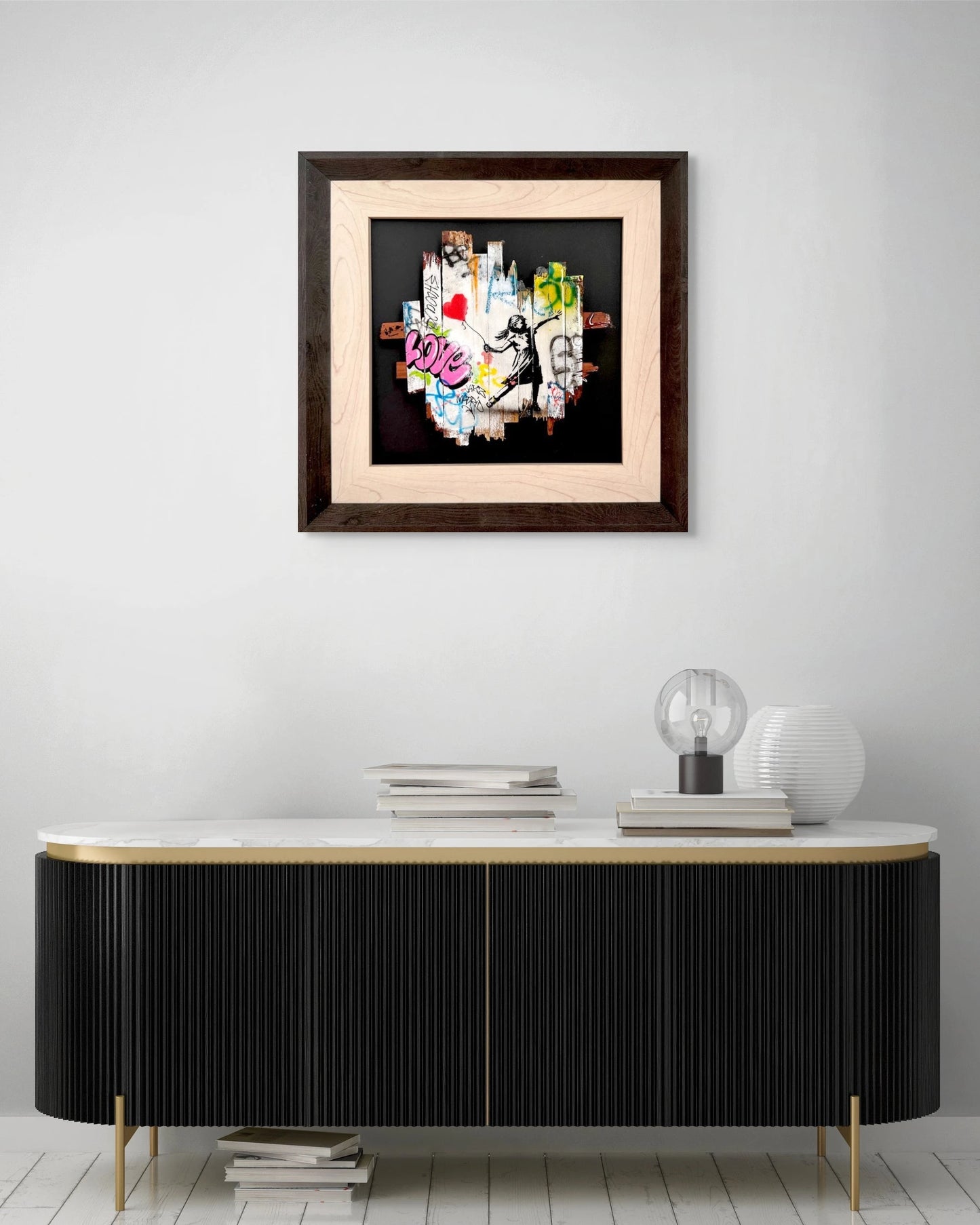The framing provides a refined border, highlighting the central design in a sleek black and natural wood. This piece challenges traditional notions of art by merging raw street culture with polished presentation, making it both thought-provoking and visually enthralling.