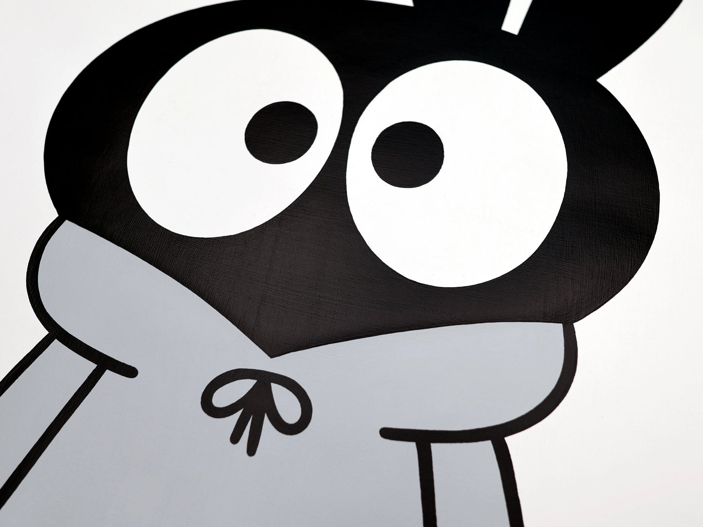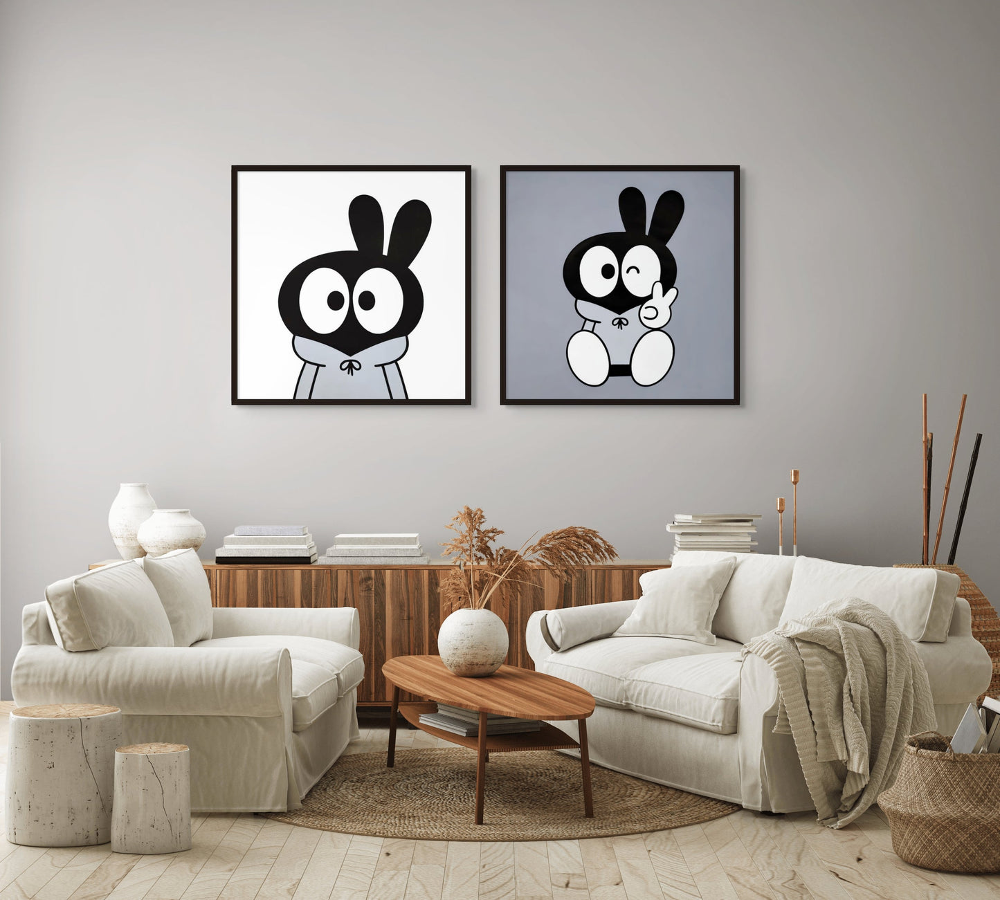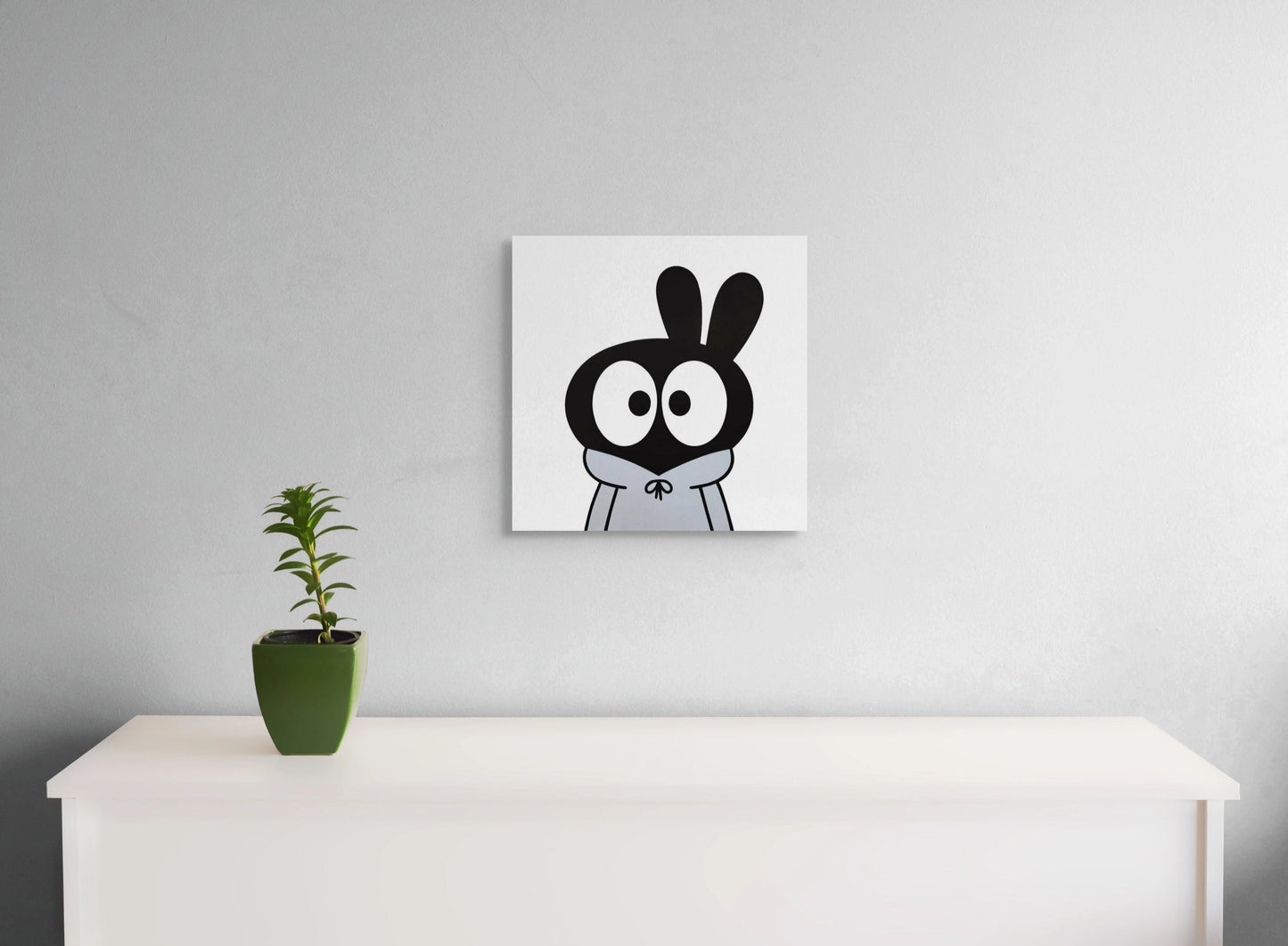 This playful artwork by Yeka Haski features Michi, the artist's signature bunny-like character, exuding charm and positivity. The minimalist black-and-white design, set against a soft gray background, emphasizes Michi's expressive personality and iconic peace sign gesture. The piece radiates joy and innocence, capturing the essence of childlike wonder that defines Yeka’s imaginative world. Perfect for brightening any space with its cheerful and modern aesthetic.