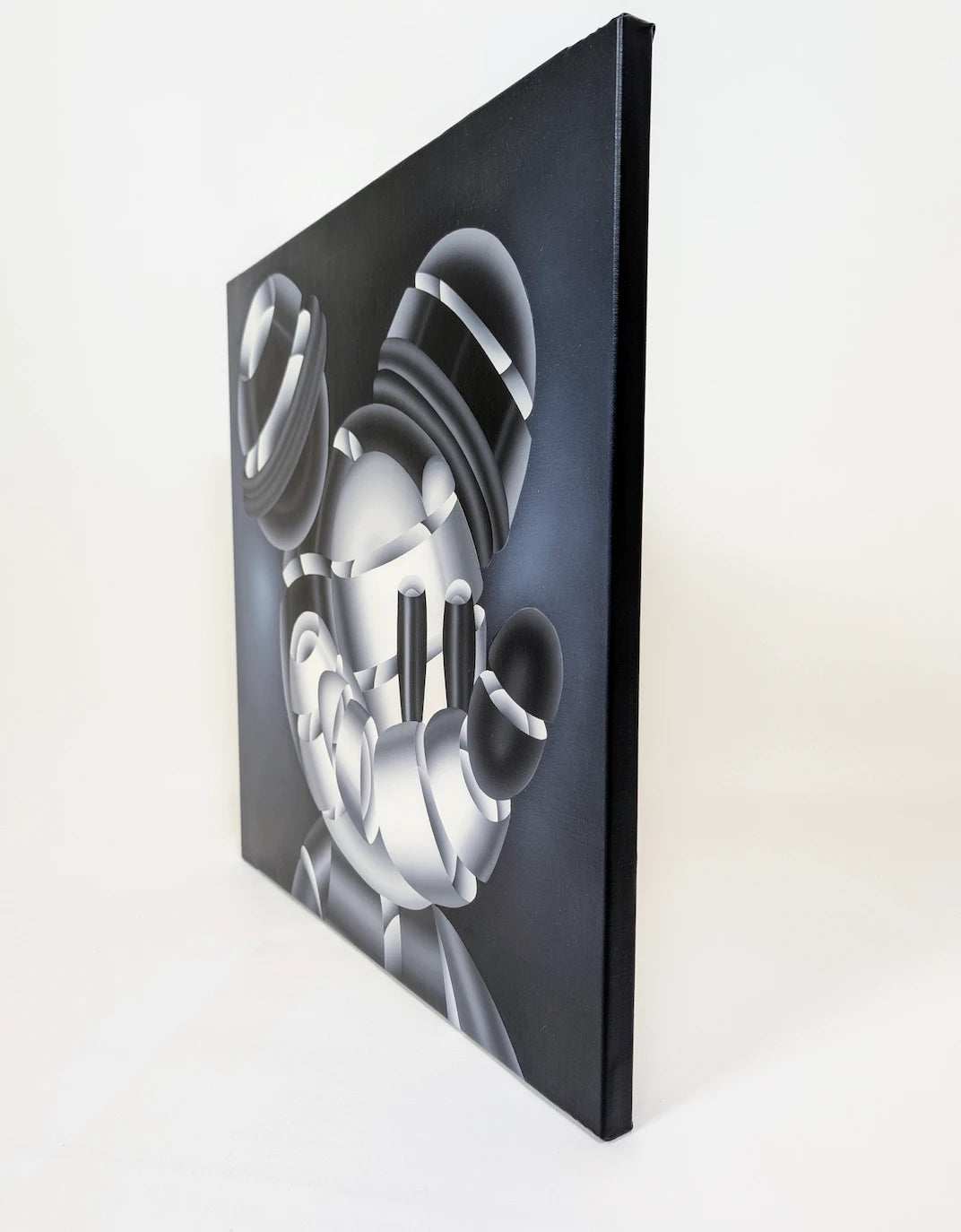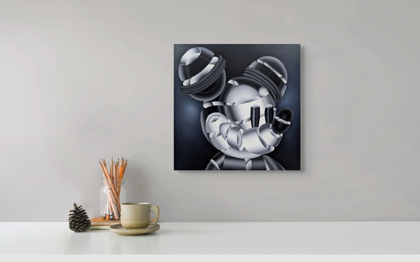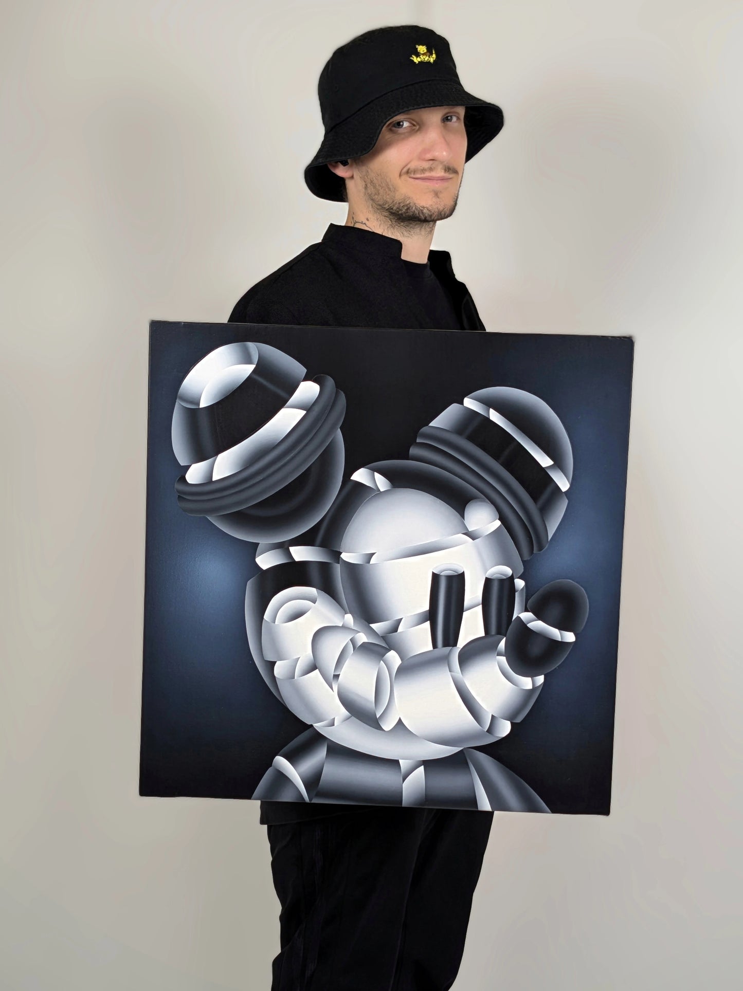 This piece deconstructs one of the most recognizable pop culture icons into geometric and mechanical forms. It reflects on the endless reproduction and commodification of such characters, questioning their place in a consumer-driven society.