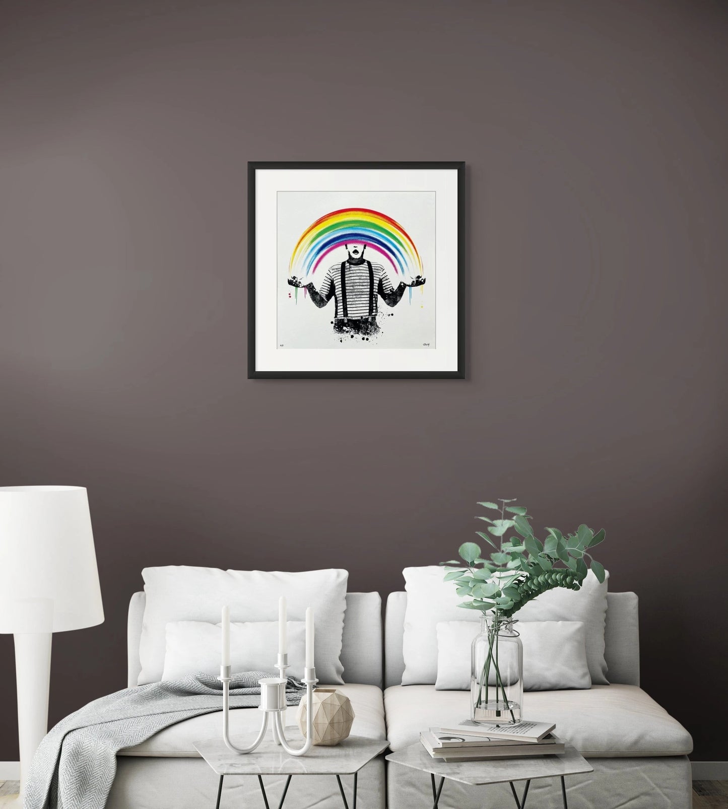 JBOY, a UK-based artist, created this eye-catching limited edition print measuring 50 by 50 cm. It shows a black-and-white mime with braces and traditional stripes. A huge rainbow that arcs above the mime's head hides its face. Bright and vivid colours of the rainbow contrast sharply with the figure's black and white appearance.