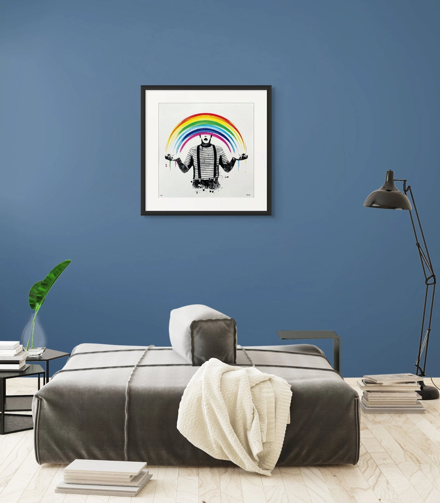 The rainbow appears to be leaking paint from both ends as the mime holds out both palms. This creates the idea that the mime is in charge of or summoning the rainbow. The topic of the artwork, which may serve as a reminder to viewers of the power of joy and creativity, is bringing colour and imagination to the world through its straightforward yet bright design. Each print is signed by JBOY, making it a special piece of collectible art.