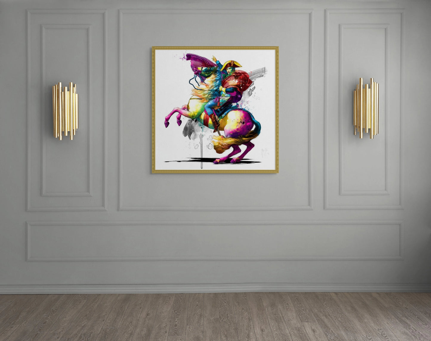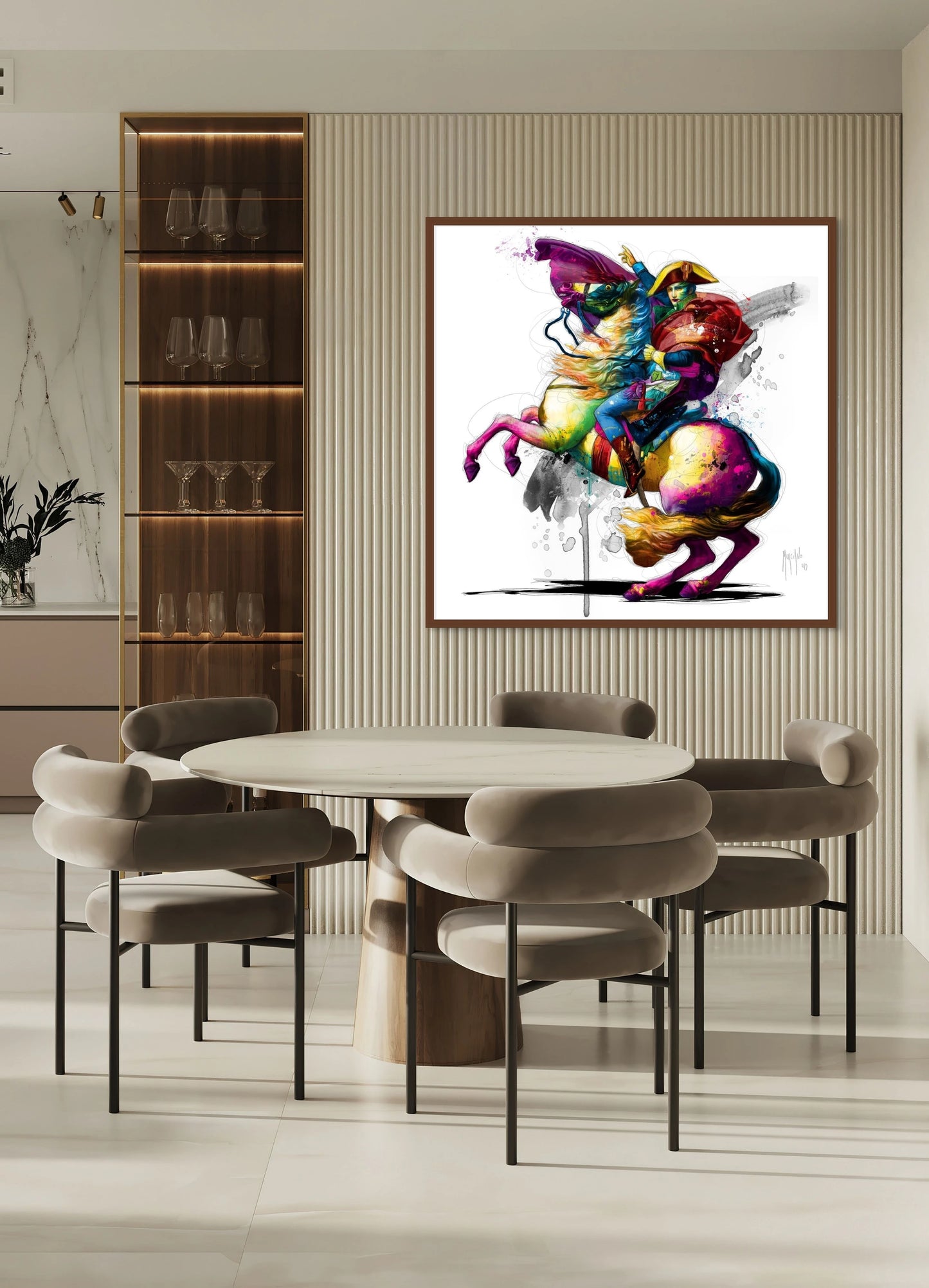 Patrice Murciano's "NaPOPleon" is a striking 120x120cm (approximately 47x47 inches) canvas that vividly reimagines Napoleon in a burst of psychedelic colors, blending history with a splash of modern pop art.