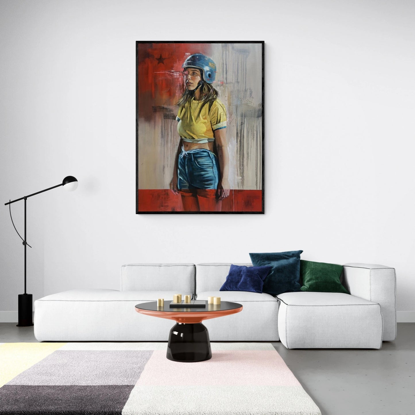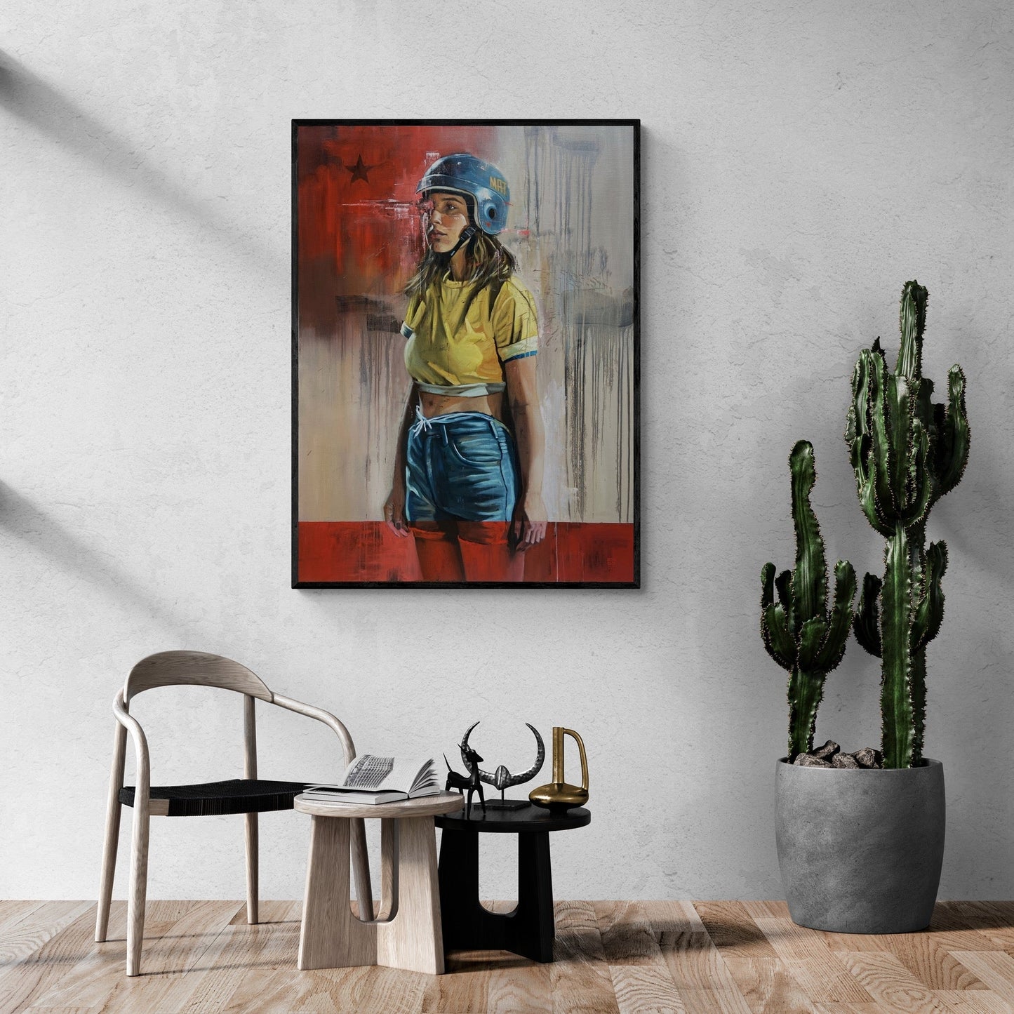 The painting, with dimensions of 130 by 97 centimeters, showcases a young woman marked by a protective helmet, her countenance reflecting a serene resolve.