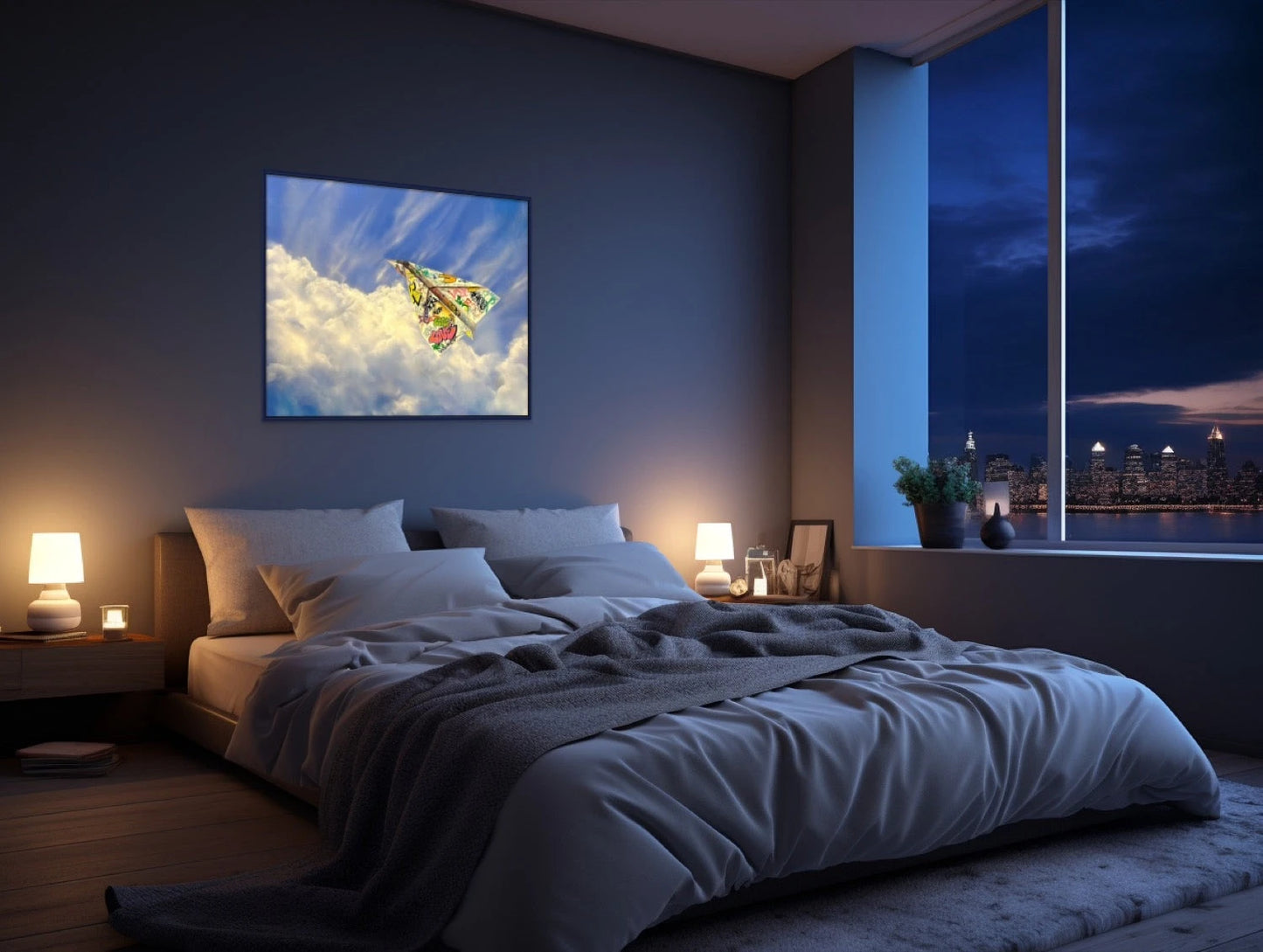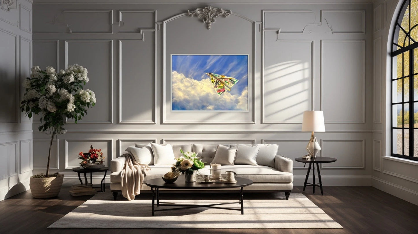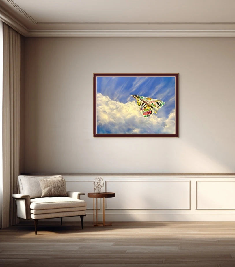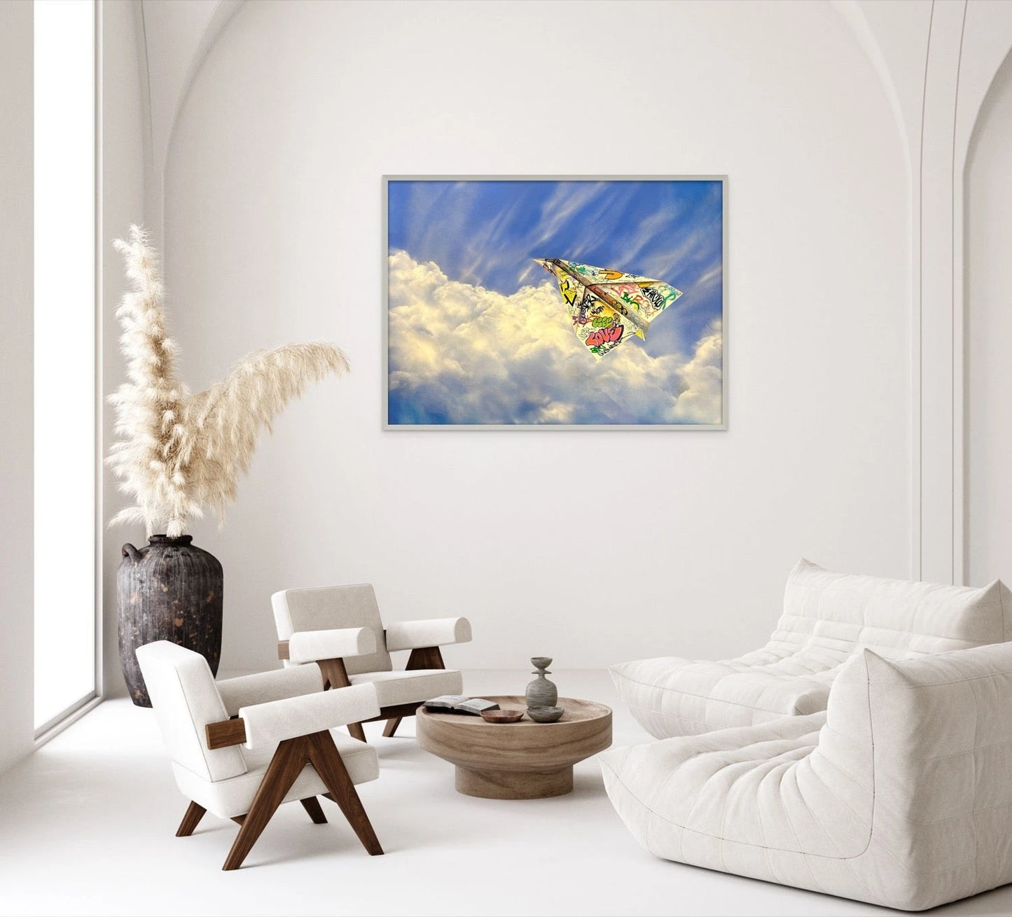 ONEMIZER's "Paper Plane" is a captivating 116x81 cm work (approximately 45.7x31.9 inches), that vividly captures the soaring spirit of ambition and hope. Floating amidst a serene expanse of clouds is a paper plane, its surface a riot of graffiti, embodying the dreams we set in the boundless sky of possibility.