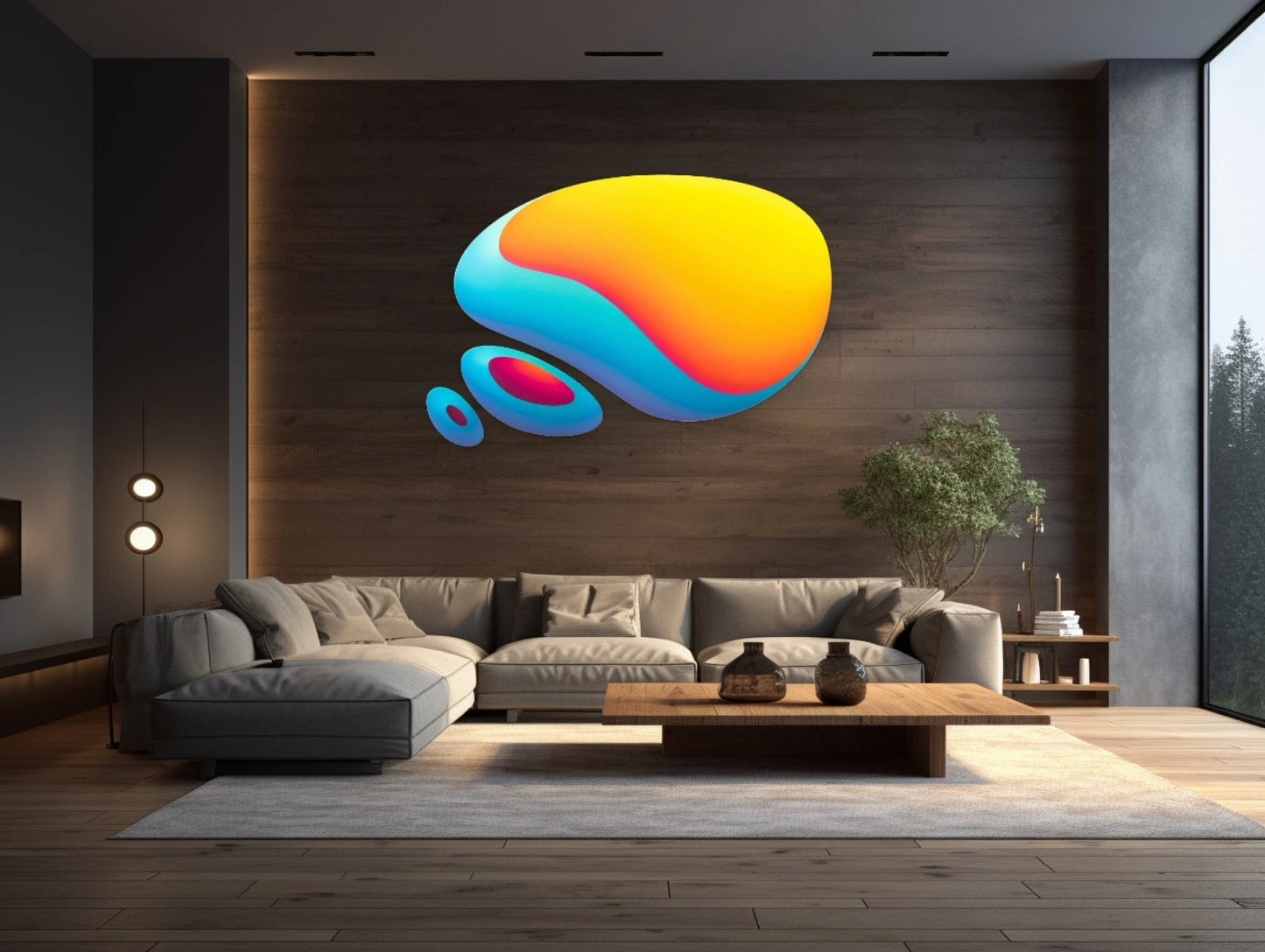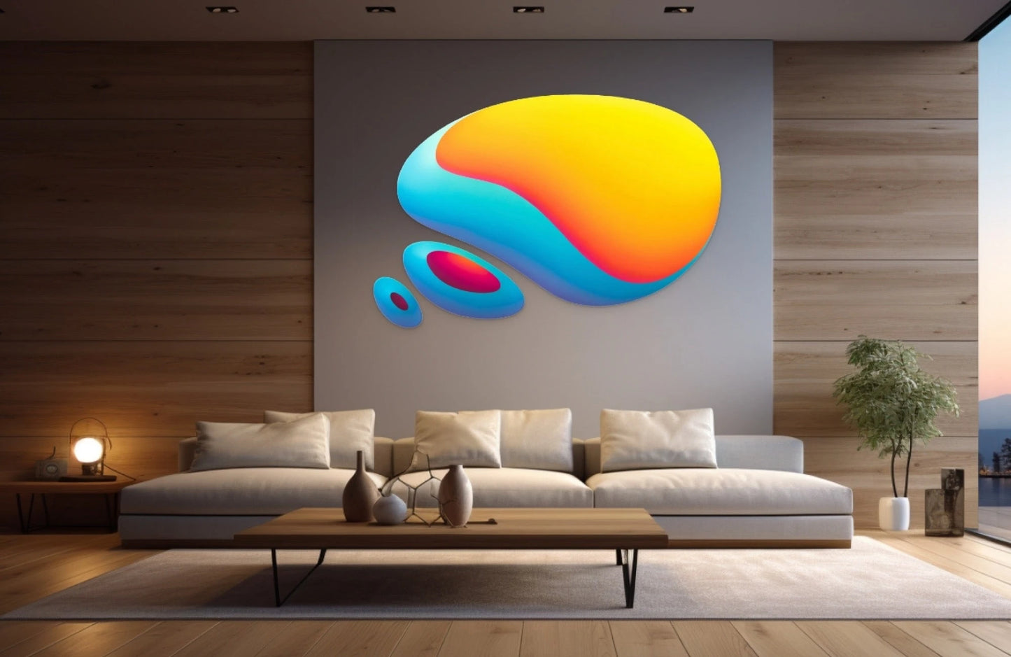 The chilly blues and reds combine with the brilliant, warm tones of yellow and orange to create a captivating combination of colours that seem to change depending on the observer's viewpoint. The sculpture's three-dimensional components, evocative of abstract marine life or natural shapes like stones, add to its dreamy appearance.