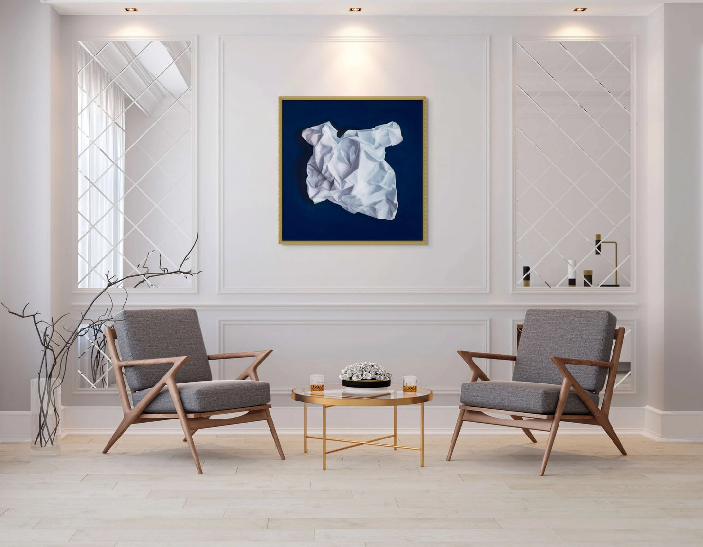 Renault's technique turns the canvas into a seemingly tactile collage, an illusion of crinkled paper cutouts. Her command of light and shadow is not merely seen but felt, as it creates the persuasive effect of depth and texture that one could almost reach out and touch.