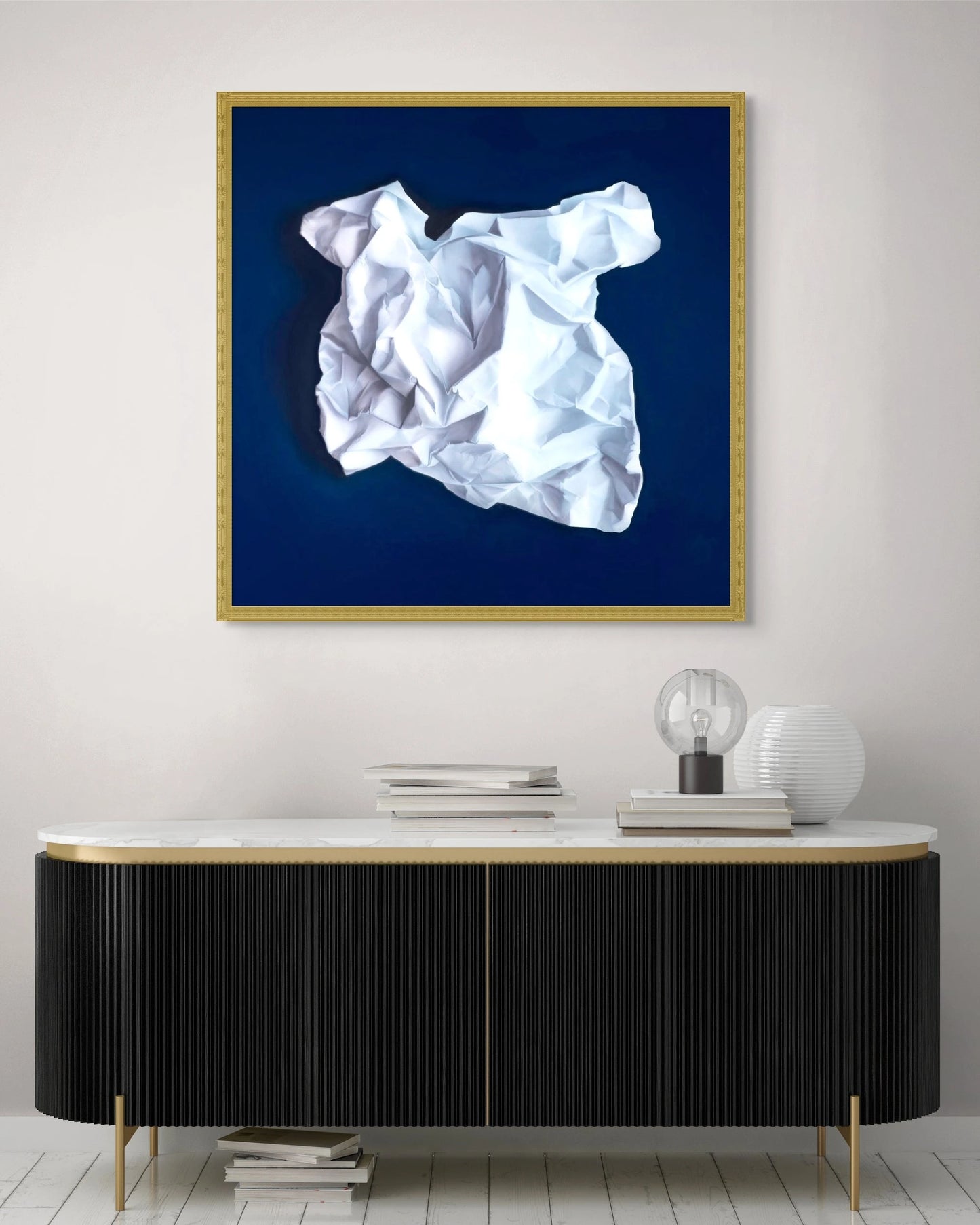 "Paper Ball" a stunning airbrushed canvas by the French virtuoso Jessica Renault, invites the viewer into a trompe-l'oeil spectacle that merges the playfulness of a child's craft project with the sophistication of fine art.